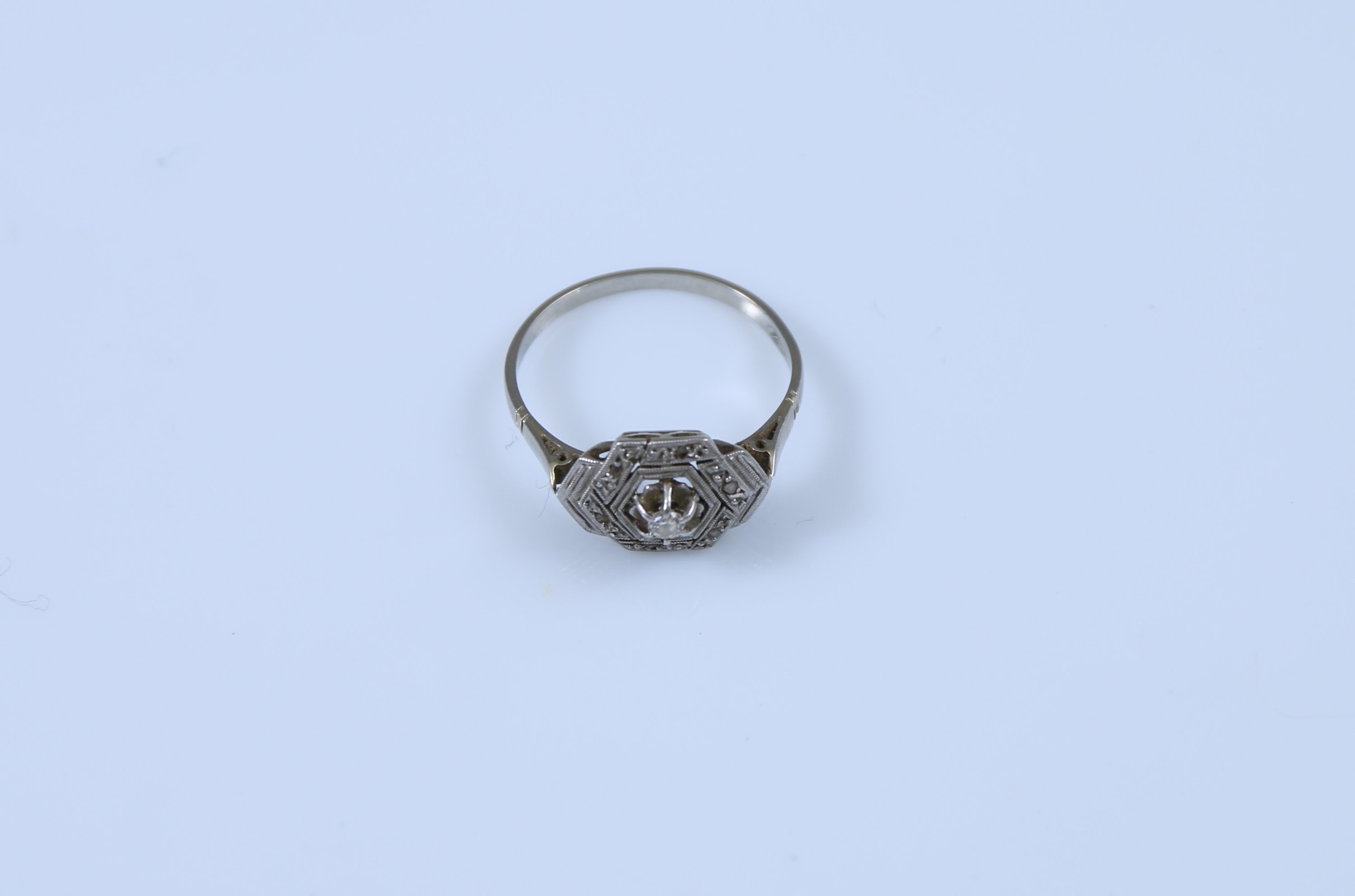 Joint: Petite bague en or gris 750 millièmes et platine de style Art Déco ornée d'un petit diamant en taille brillant en serti griffes dans une monture hexagonale. Tdd: 54,5. Poids brut: 2 g.