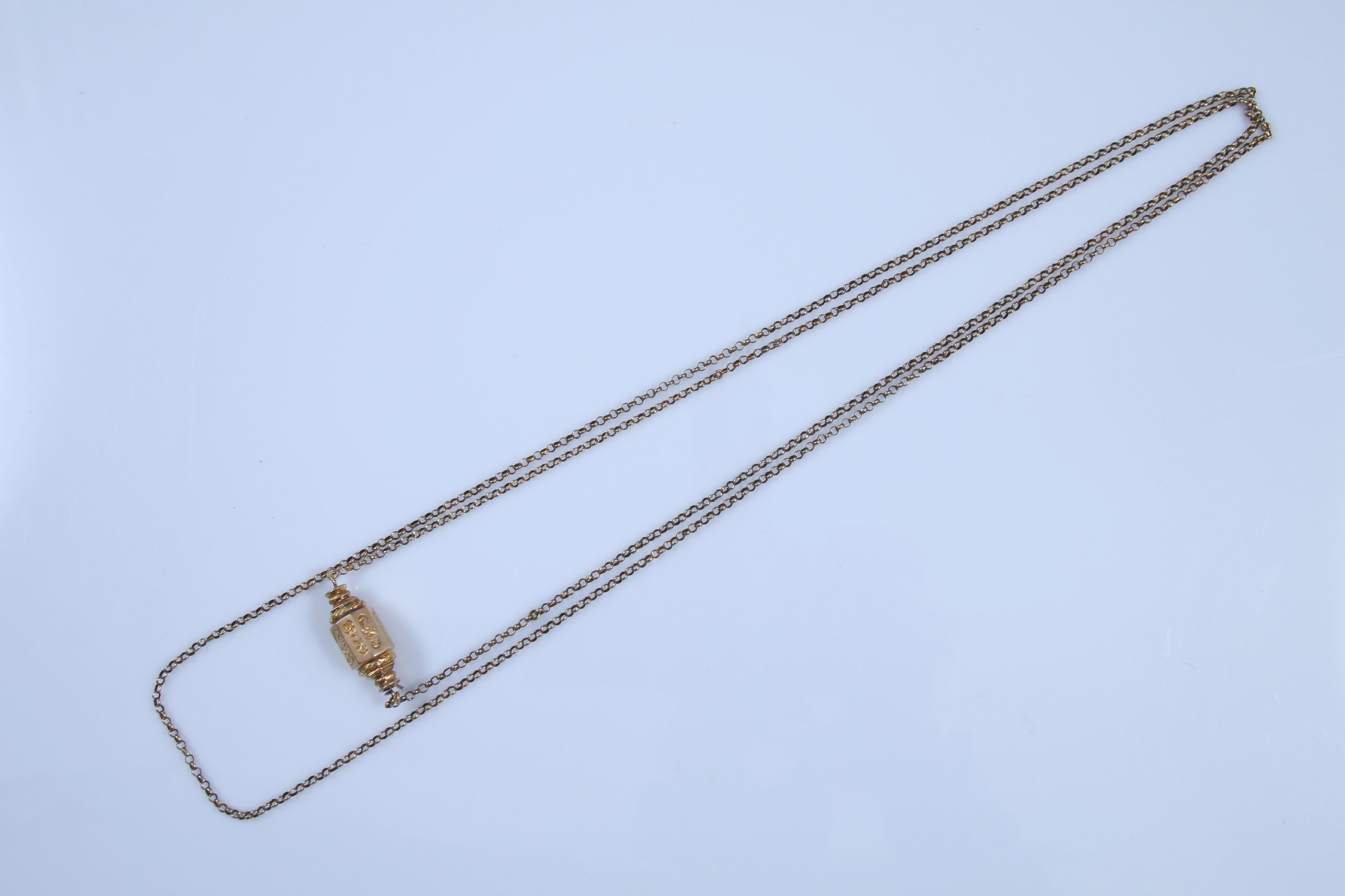 La chaine à mailles forçats à plusieurs rangs terminés par un pendentif de forme octogonale à décor de rinceaux et fleurs épanouies.