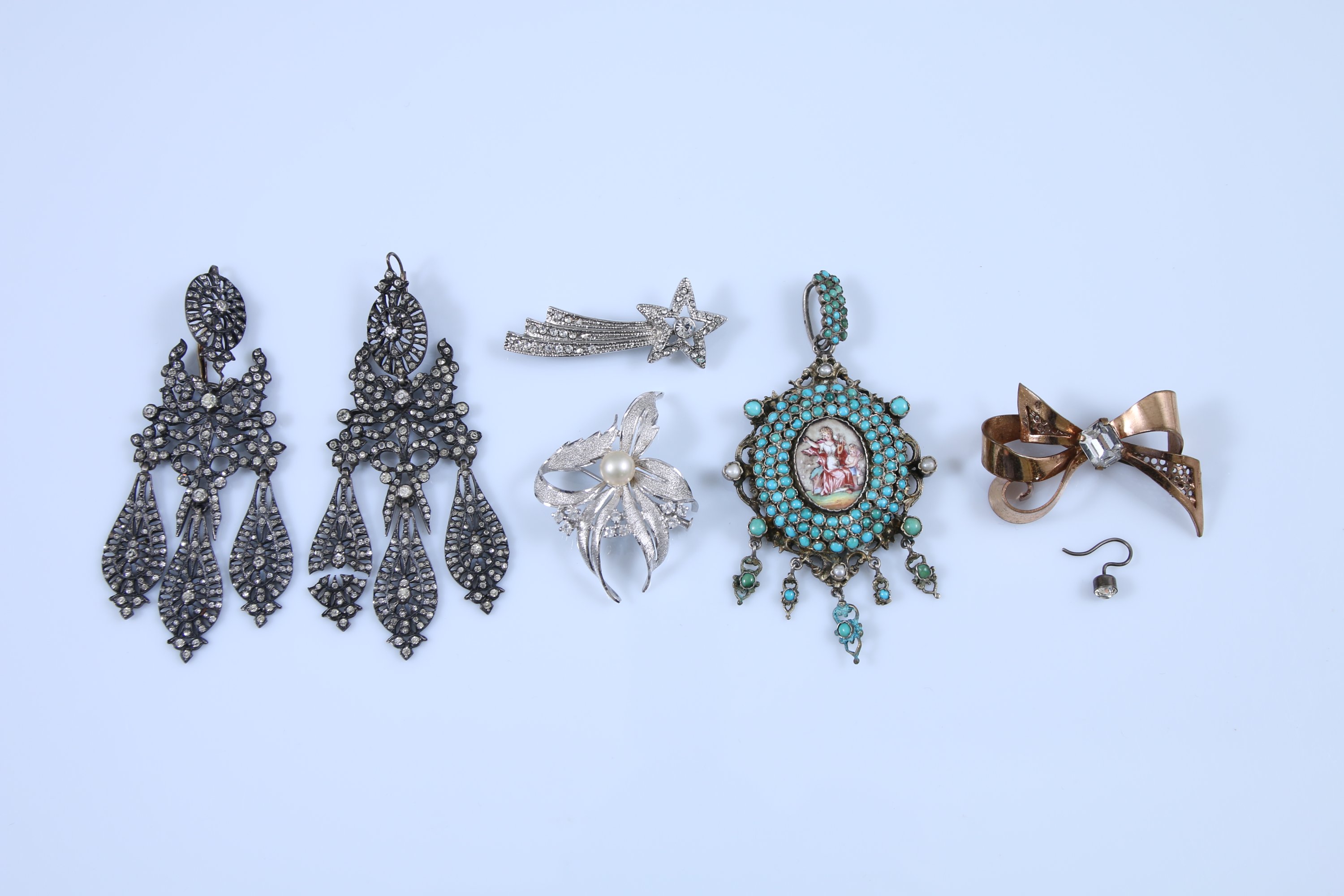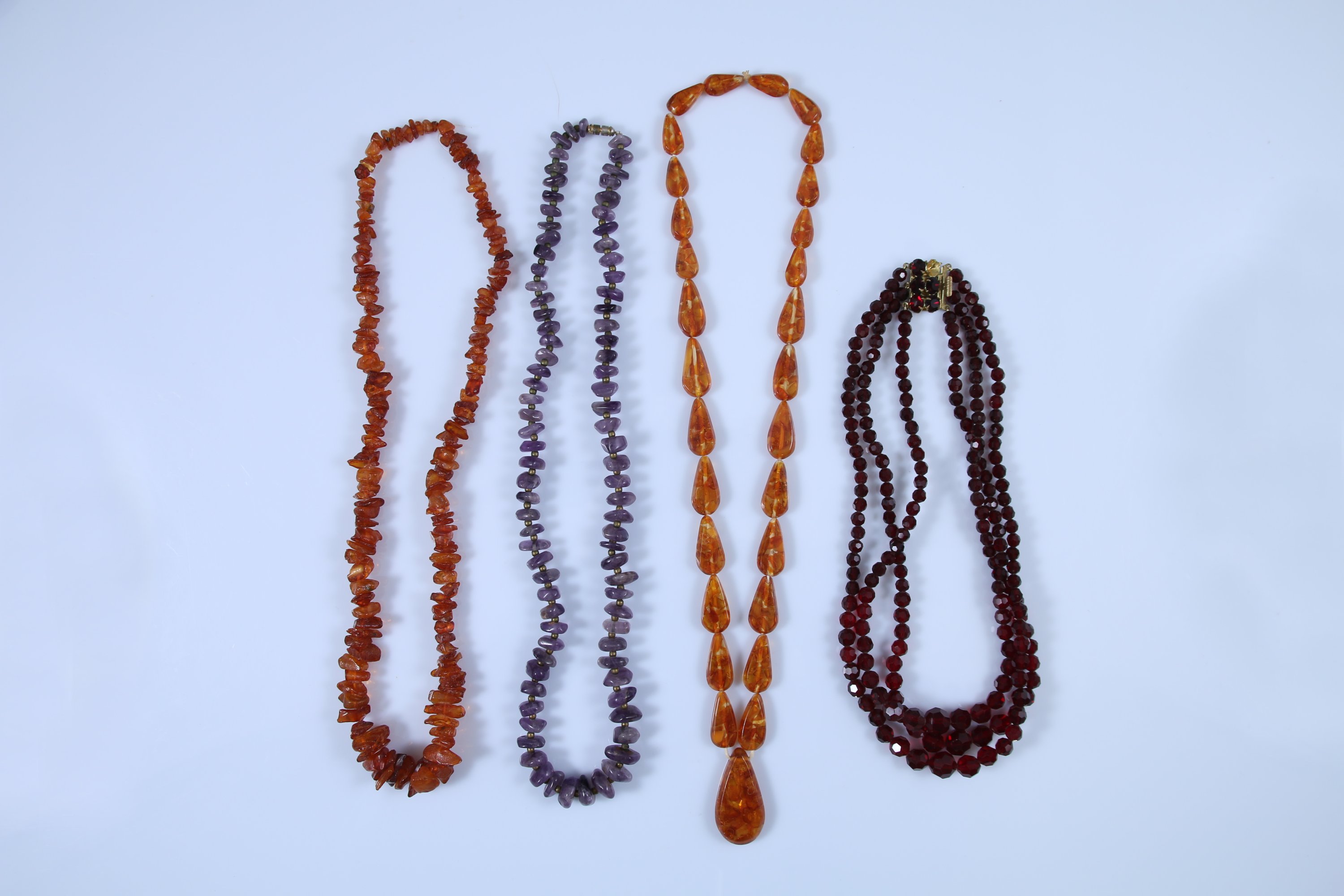 Comprenant un collier en chutes d'améthystes, collier en chute d'ambre, colliers en verroterie imitant l'ambre et le grenat et petits bijoux en métal plaqué dont trois broches, deux pendants d'oreilles, un clou d'oreille, un médaillon porte-photo orné de turquoises et un petit camée sur coquillage.