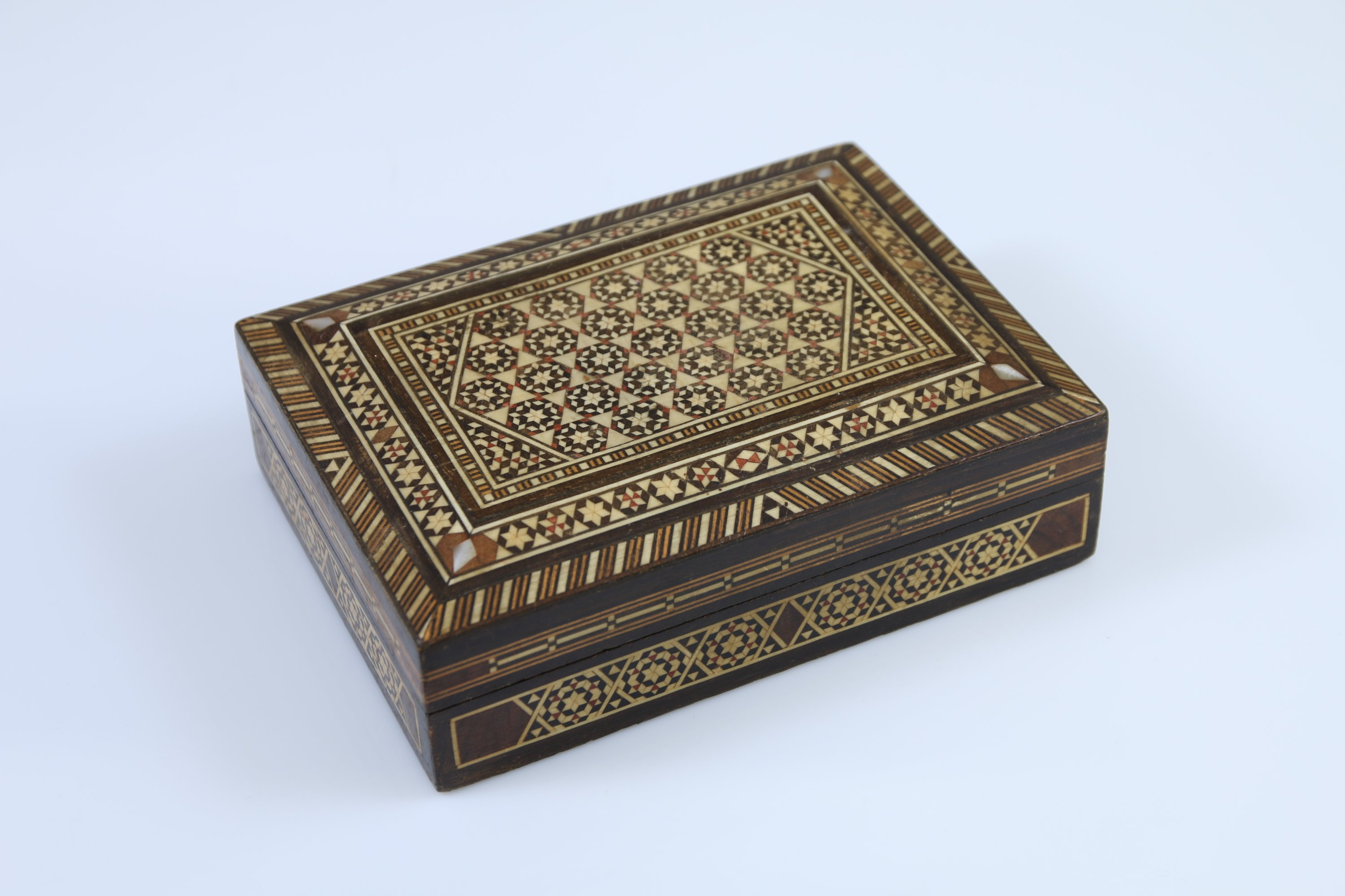 Joint: Boite en Khatam kari. Travail probablement syrien. Haut. 4,5 Long. 14,5 Prof. 10,5 cm.