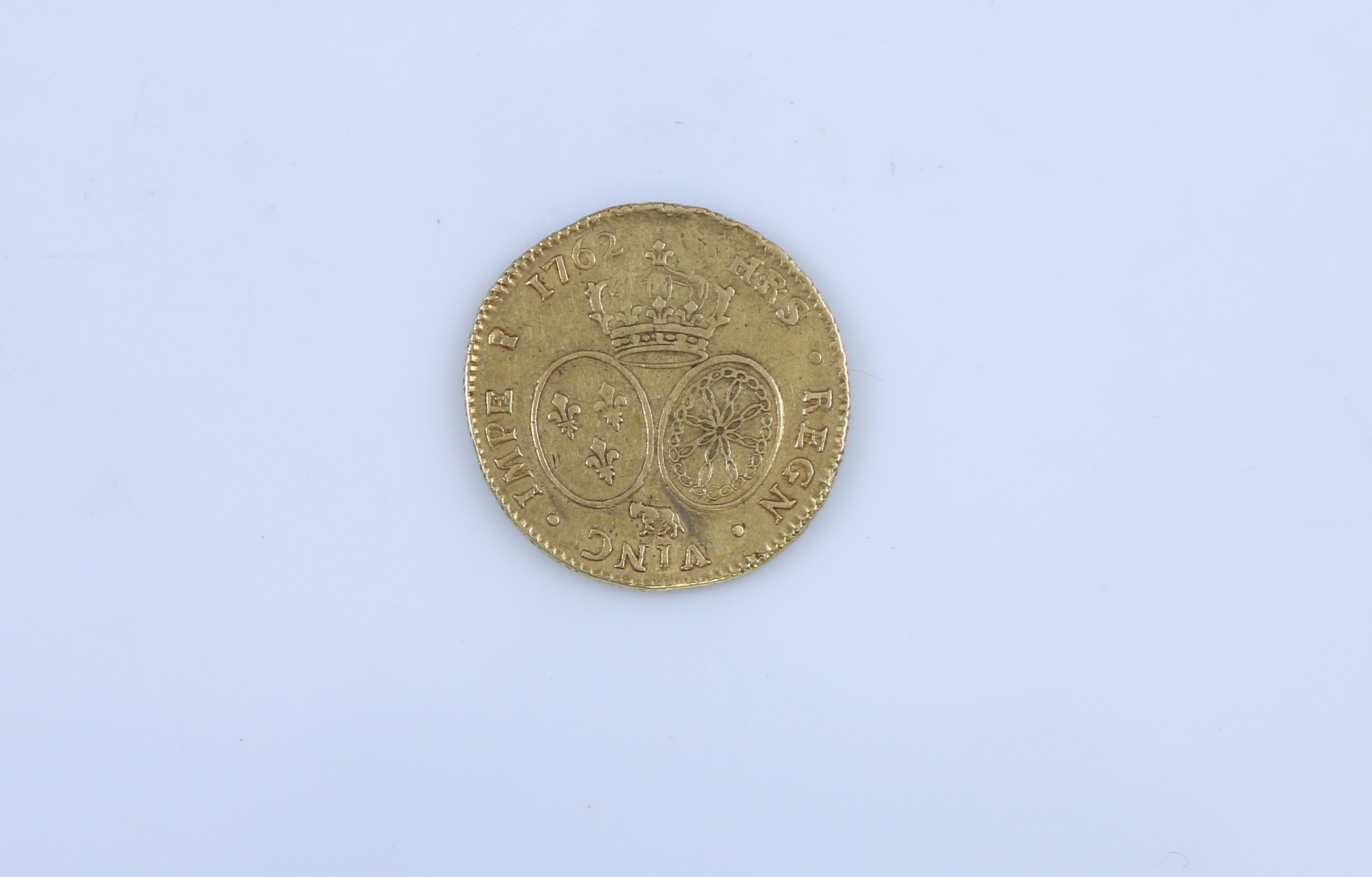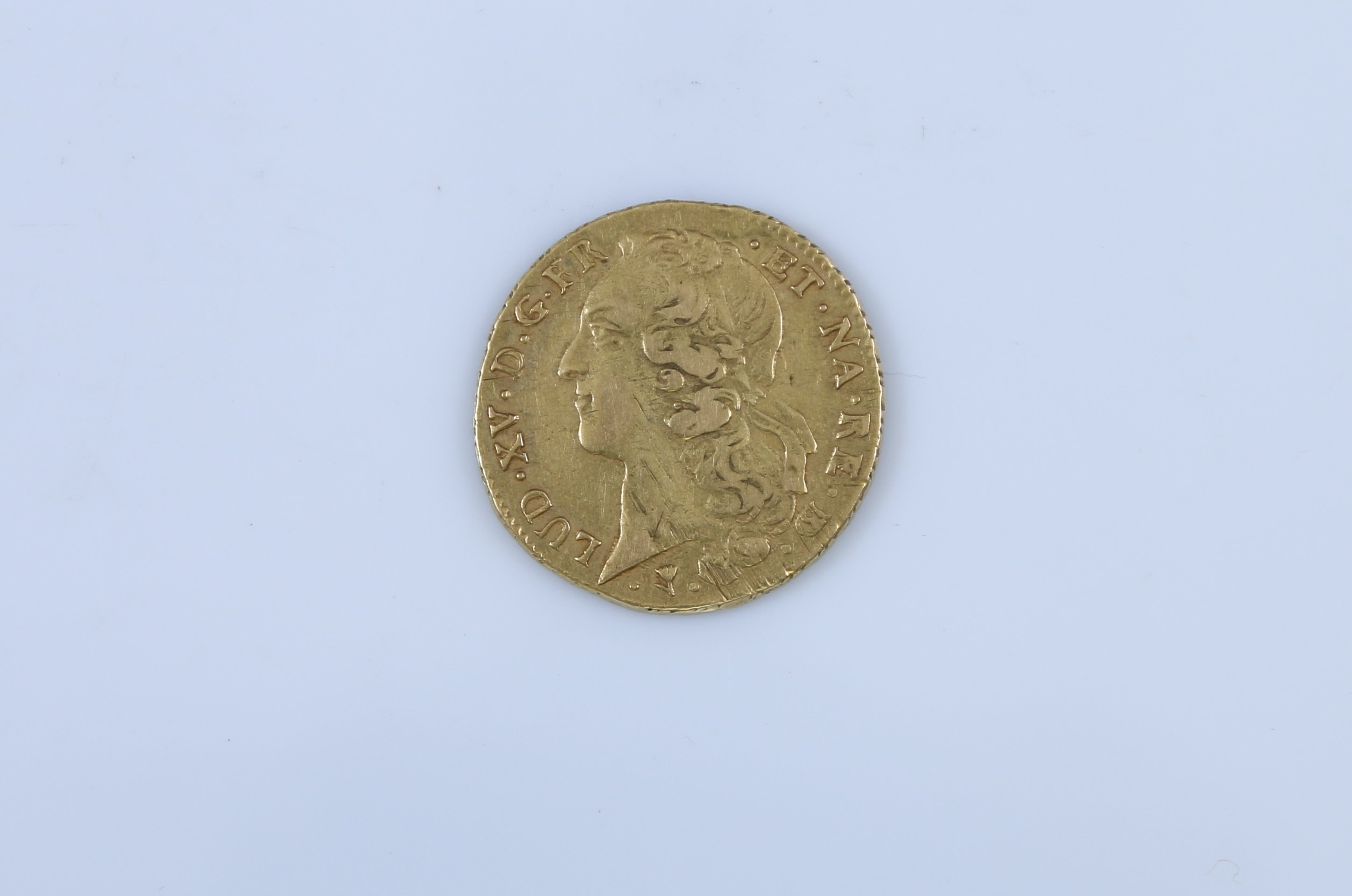LUD. XV. D. G. FR - .ET. NA. RE. BD. Tête à gauche du Roi, ceinte d'un bandeau. Dessous, différent du directeur. R/. CHRS. REGN. VINC. IMPE. Différent du graveur et millésime. Deux écus ovales aux armes de France et de Navarre couronnés. Dessous, vaquette.