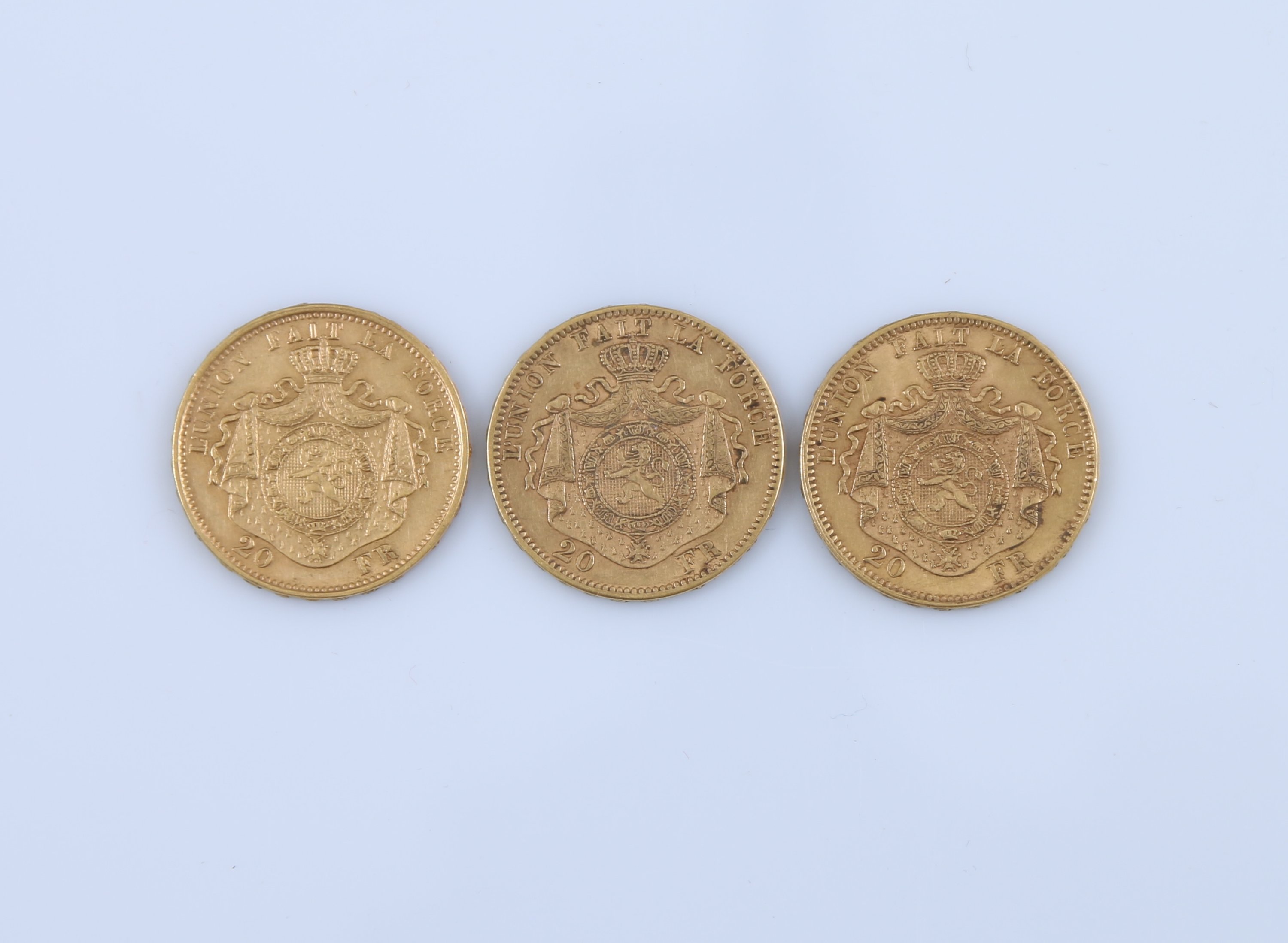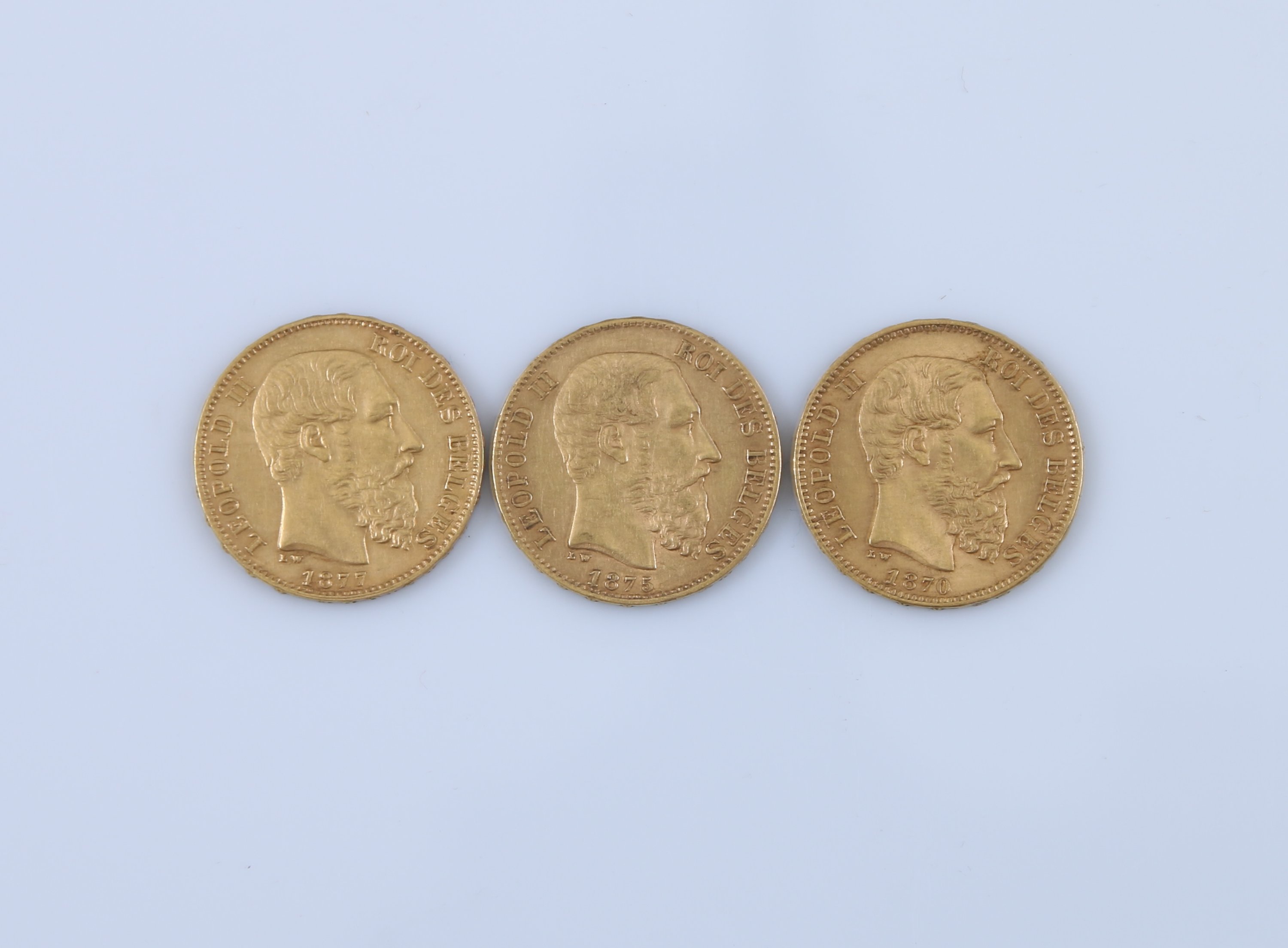 BELGIQUE. 3 x 20 FRANCS OR, Léopold II, 1870, 1875 et 1877.