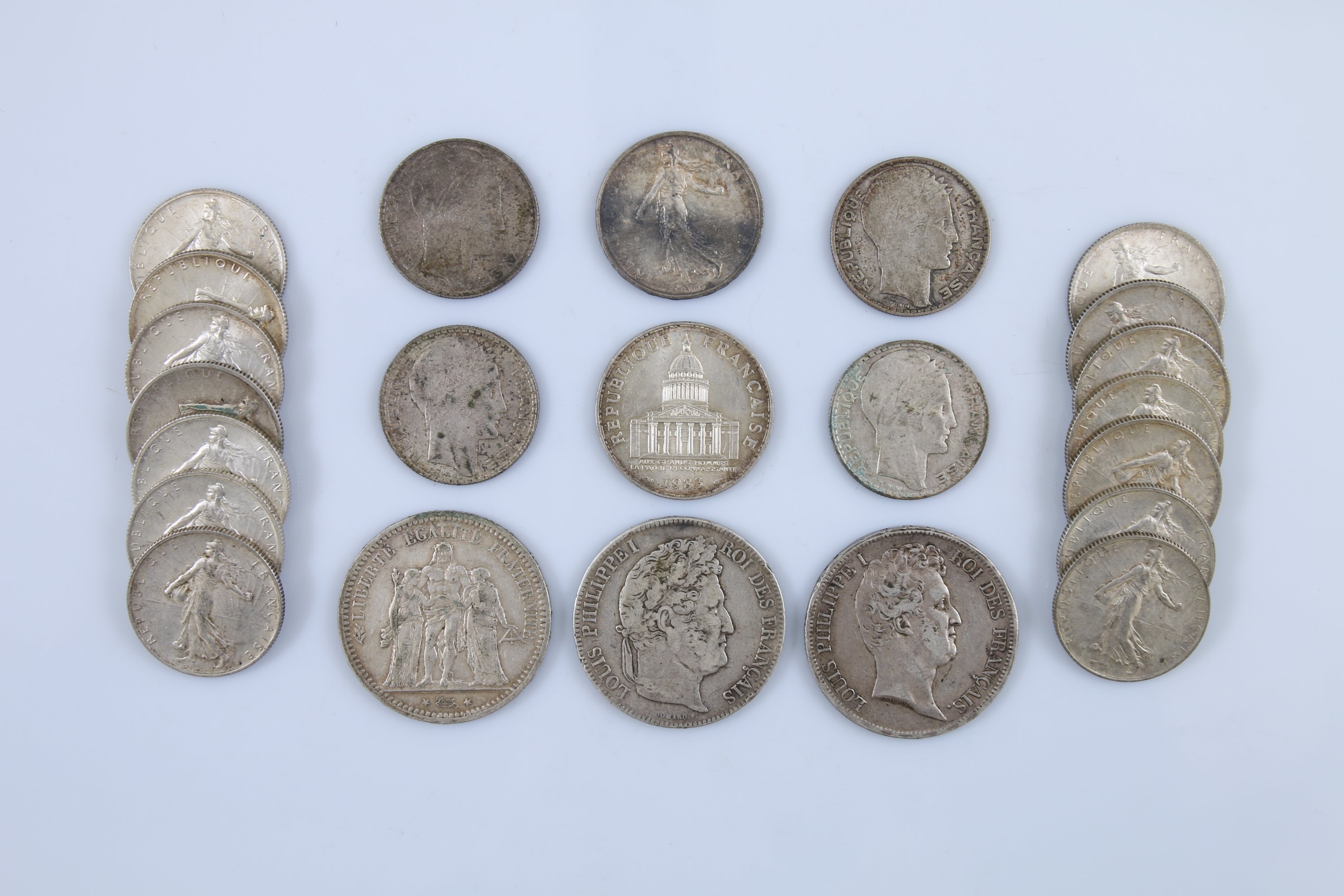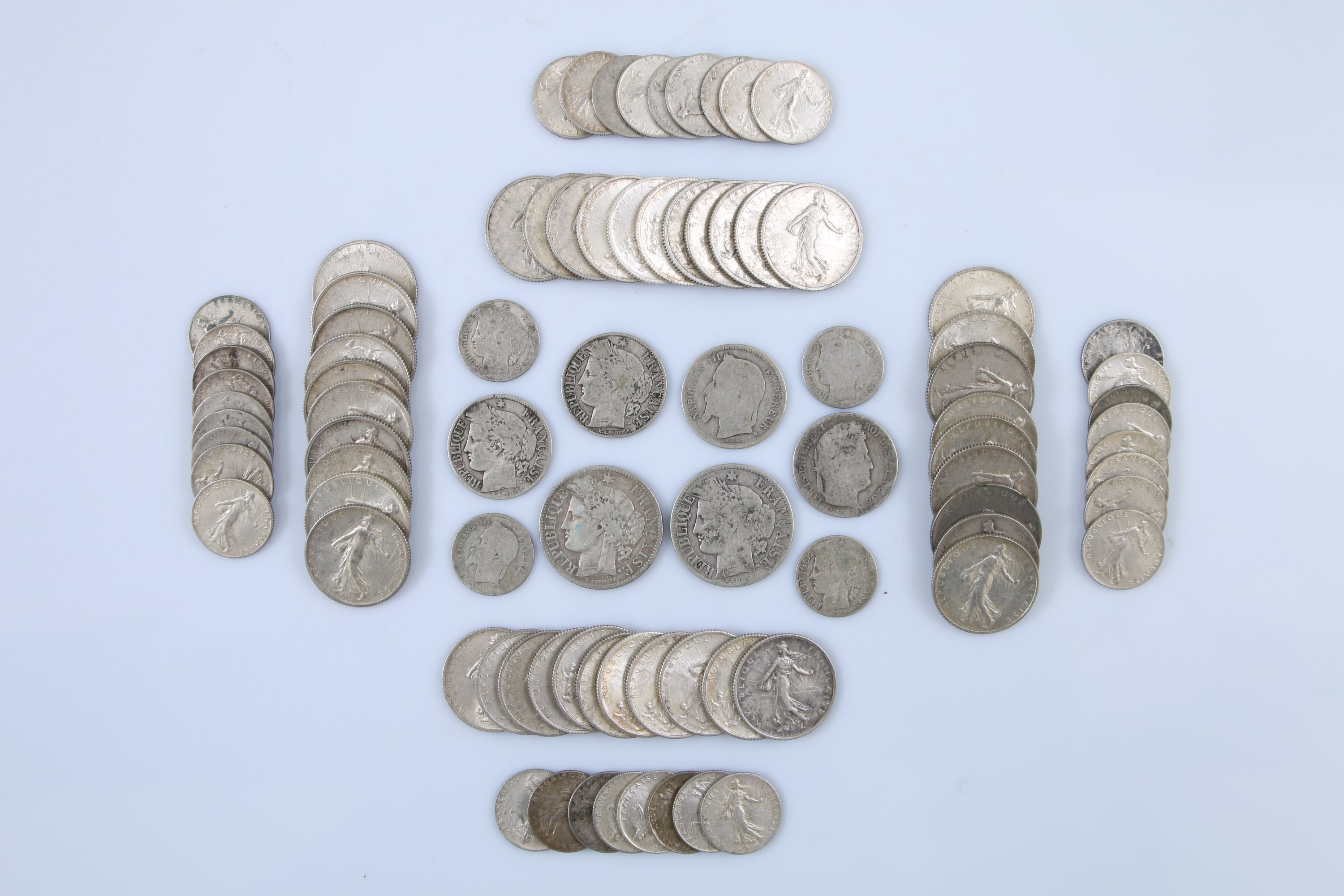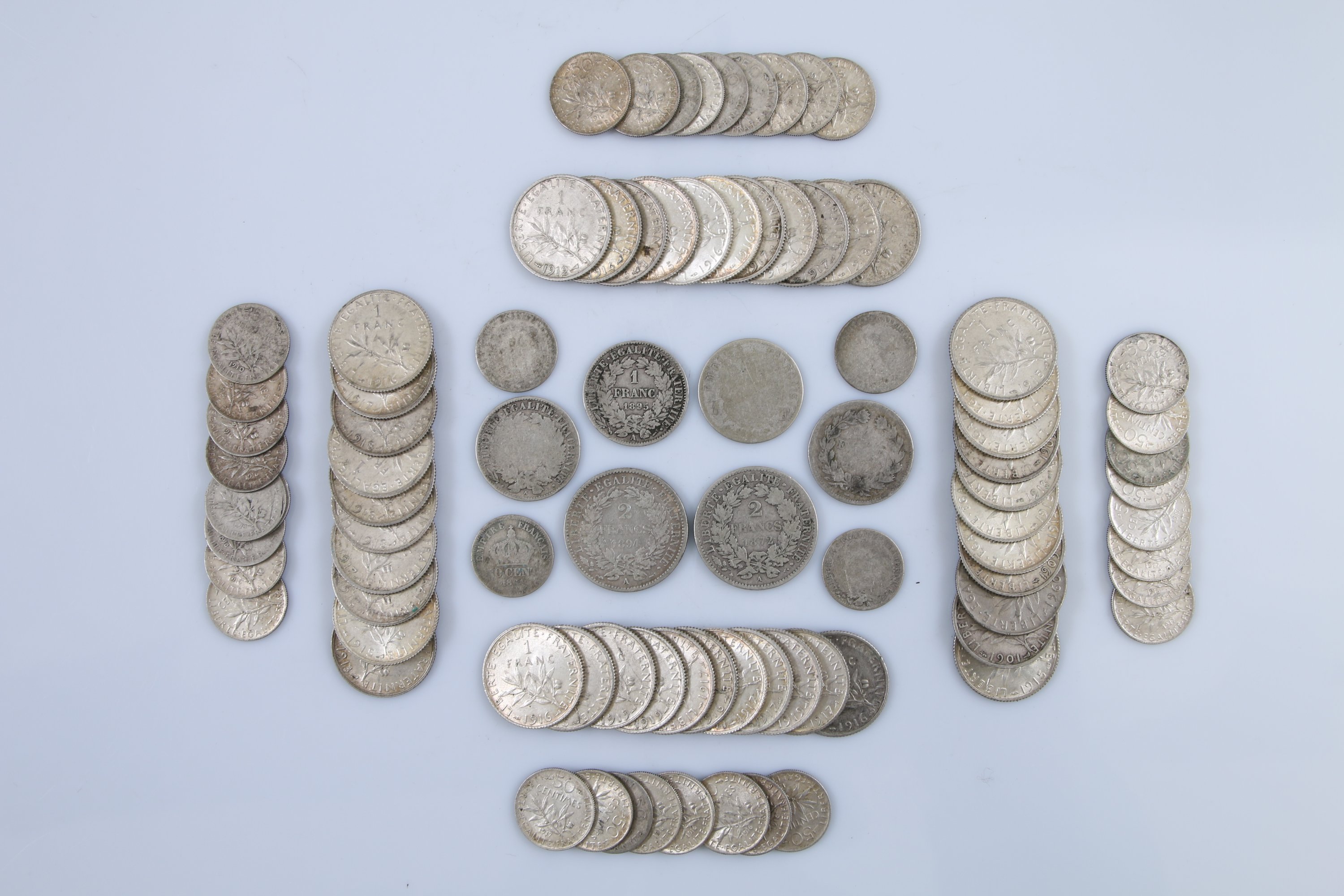 - 47 x 1 franc dont une type Louis-Philippe (date effacée), une type Napoléon III (date effacée), deux types "Cérès" 1895 et une date effacée et 43 types "Semeuse: 1901 (1), 1909 (2) 1912 (1), 1913 (2), 1914 (2), 1915 (8), 1916 (9), 1917 (9), 1918 (5), 1919 (3) et 1960 (1).