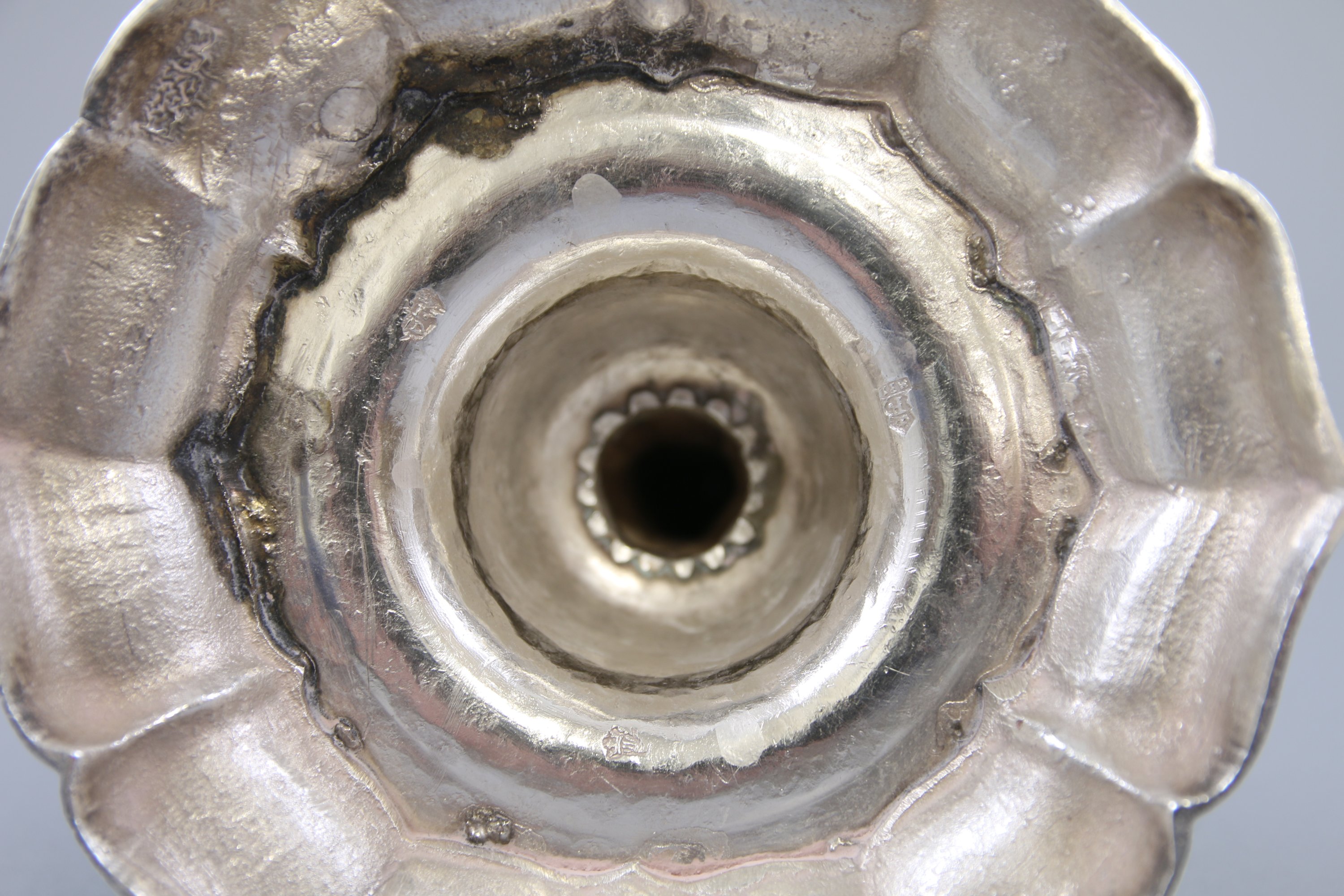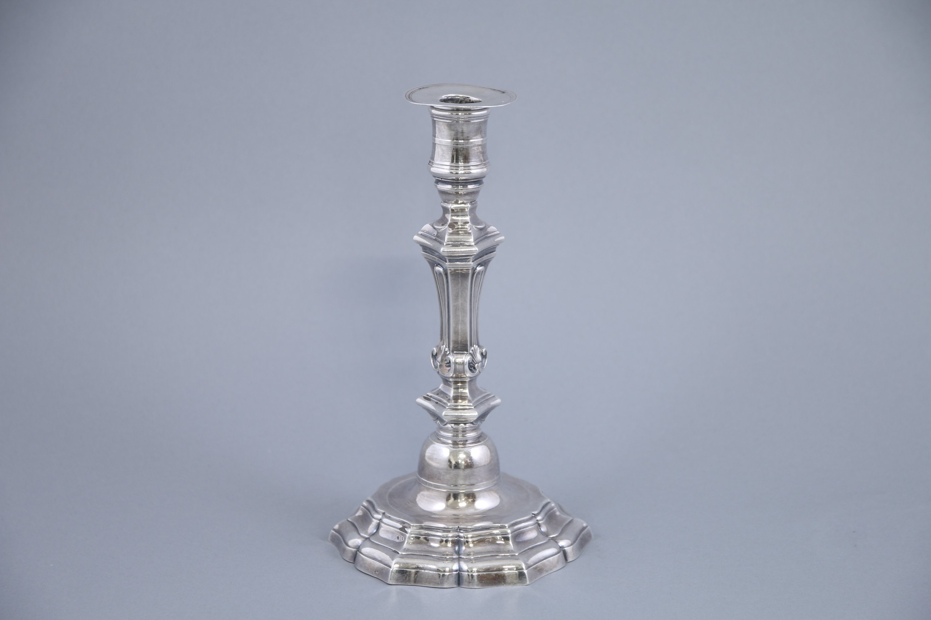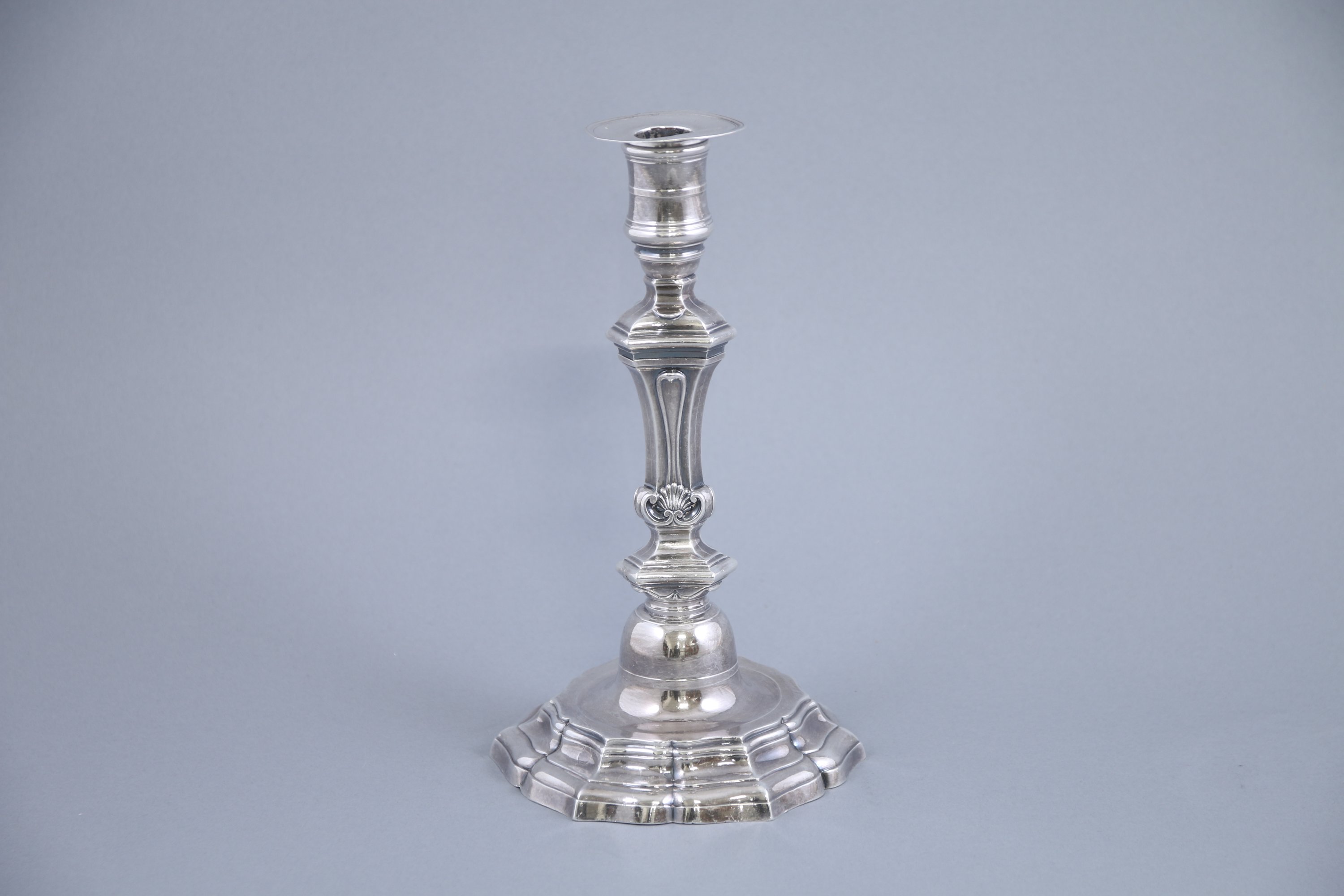 Reposant sur une base hexagonale mouvementée et rehaussée de moulures, le fût en gaine à trois côtés est décoré de volutes et de coquilles, le binet bagué.