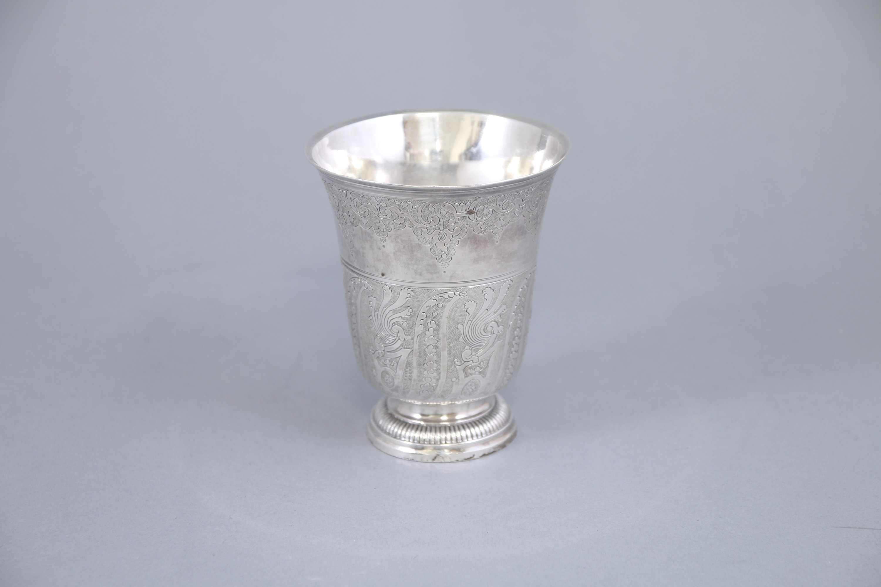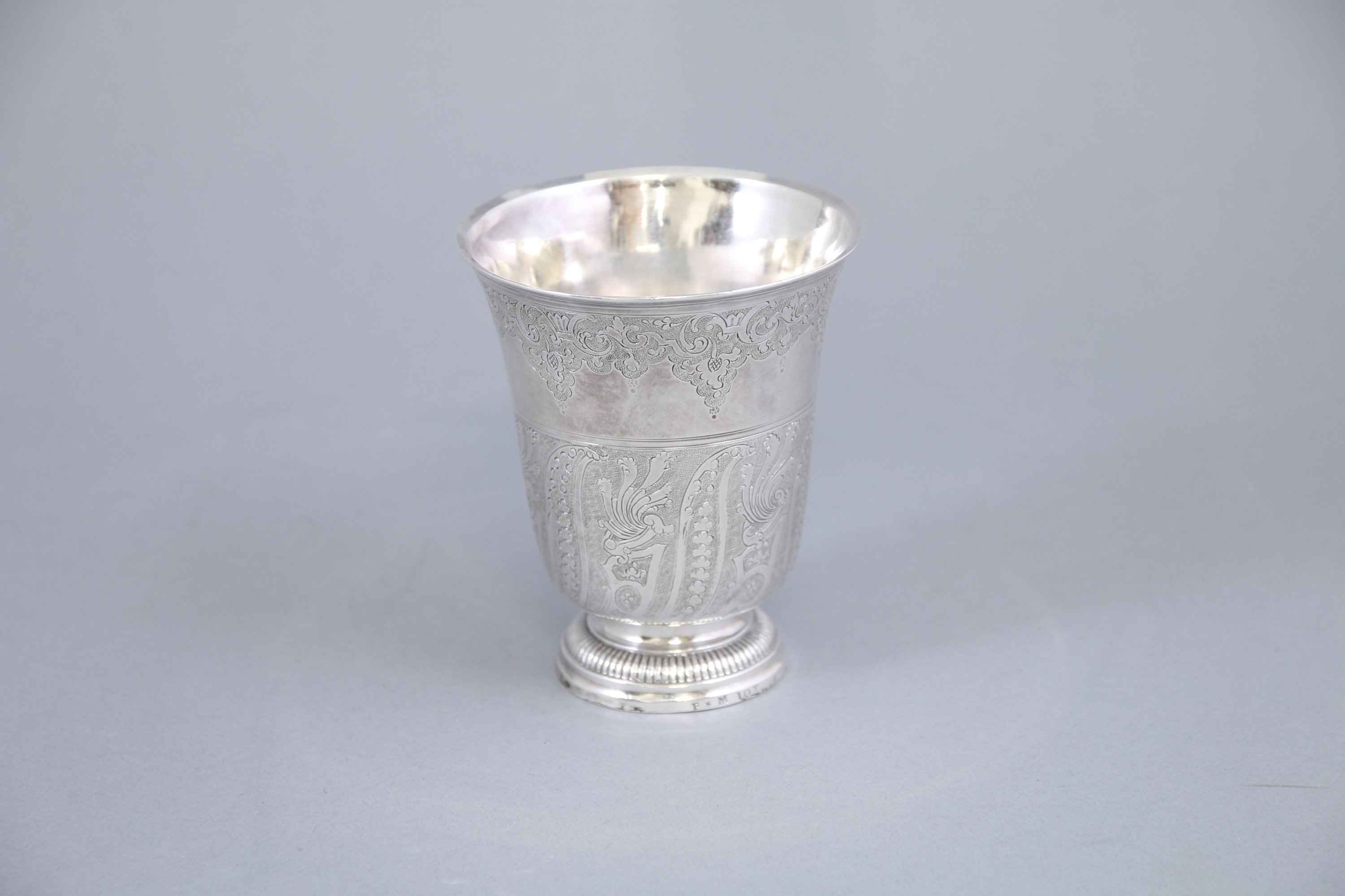 La lèvre évasée soulignée de filets surmontant un corps au riche décor gravé sur deux registres de rinceaux et lambrequins sur fond amati. Le pied est orné de godrons et la mention " F.M LOT" avec une étoile.