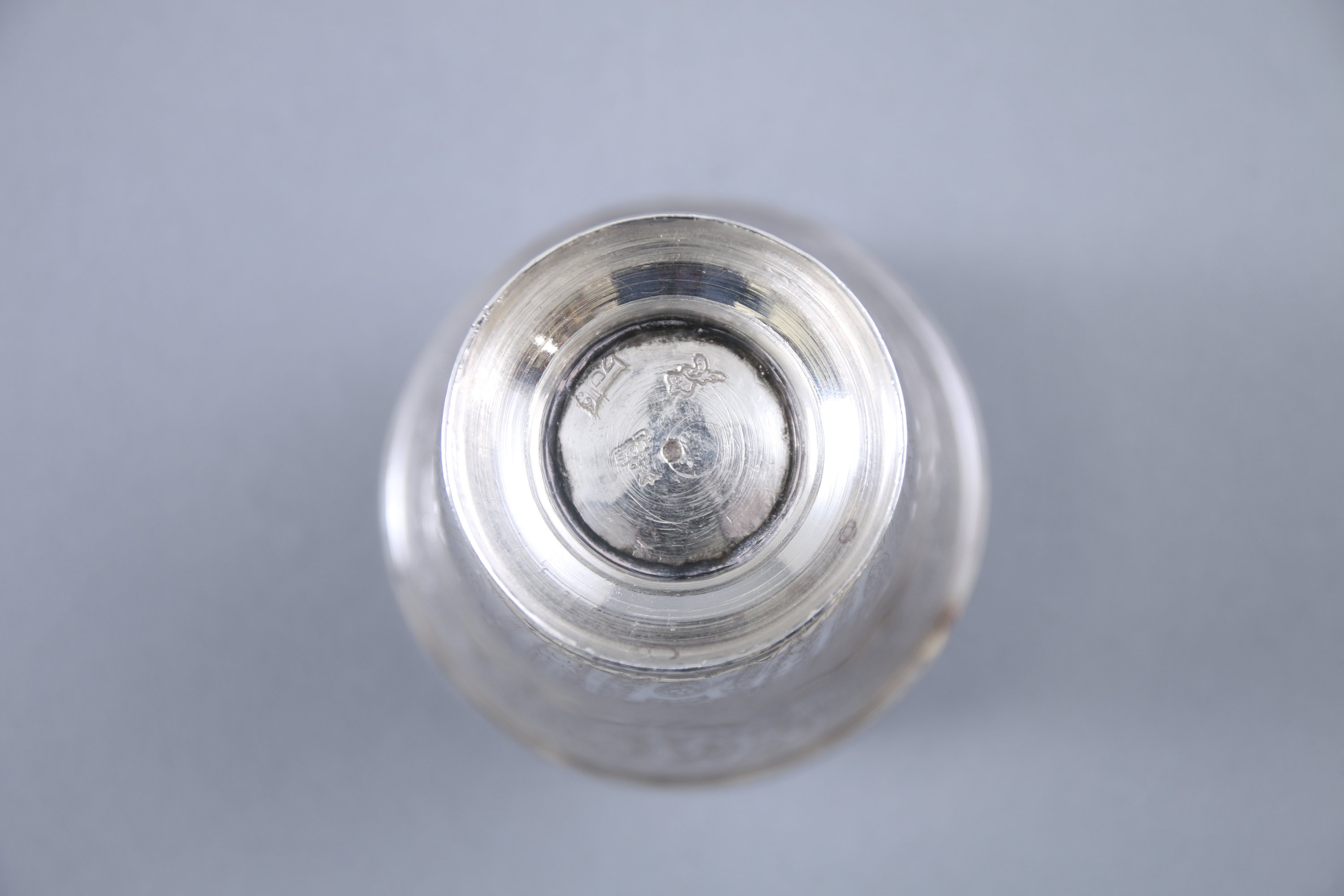 Poinçon de charge: "A couronné", 1756-1762. Poinçon de décharge: "coquille vue par dedans", pour les menus ouvrages d'argent. Poinçon de jurande: "R couronne", 1757-1758. Maître-orfèvre: Jean Debrie (1686-1758), reçu maître en 1725.