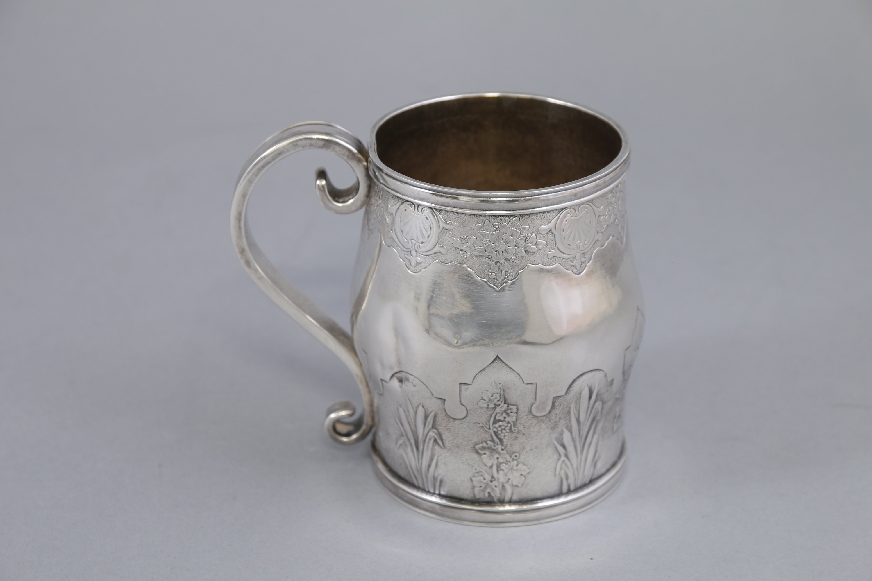 La lèvre moulurée surmonte un corps décoré sur deux registres au fond amati. Le décor supérieur est gravé de coquilles en alternance de bouquets de fleur. La partie inférieure festonnée présente un décor de roseaux et pampres de vigne. Une anse en enroulements.