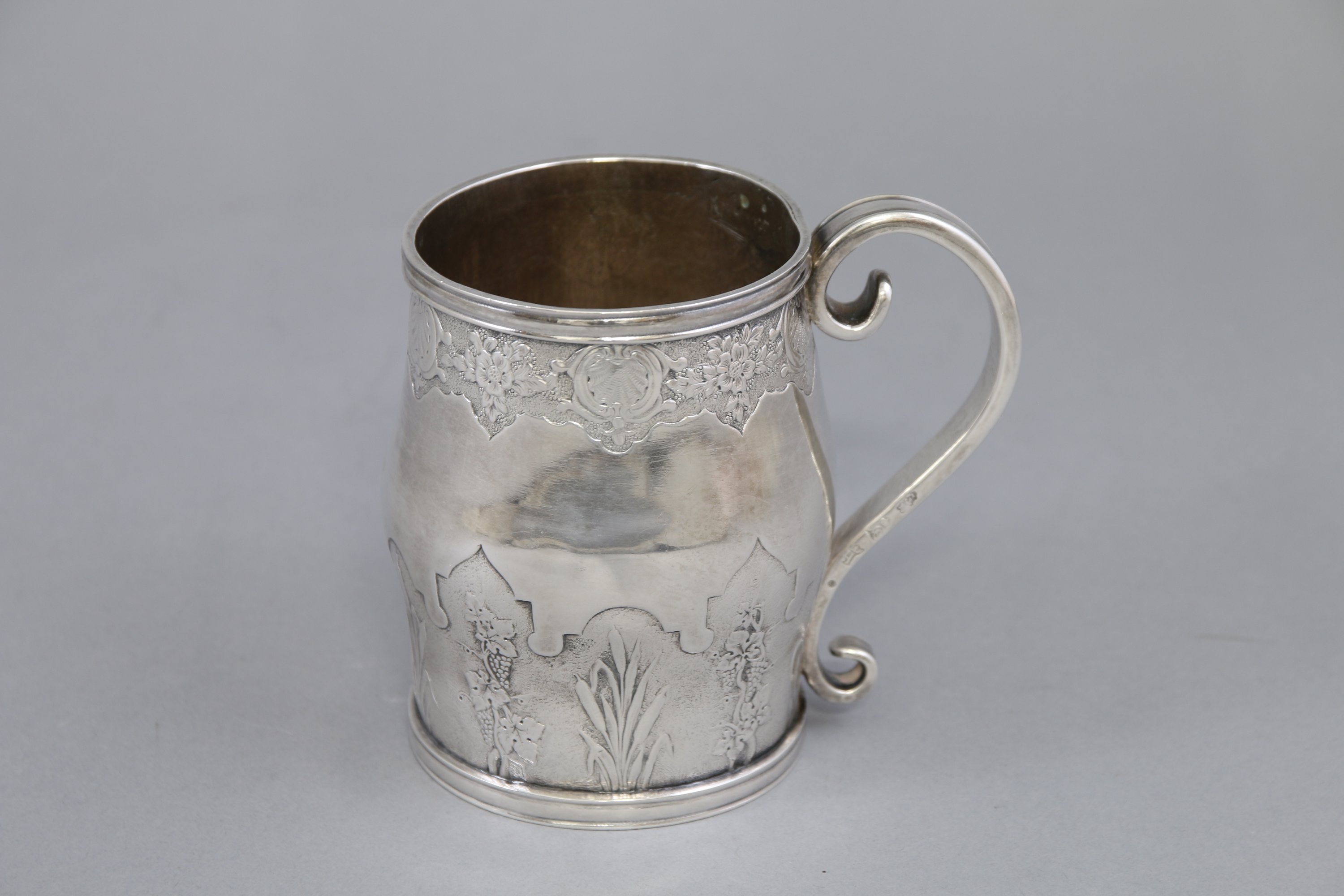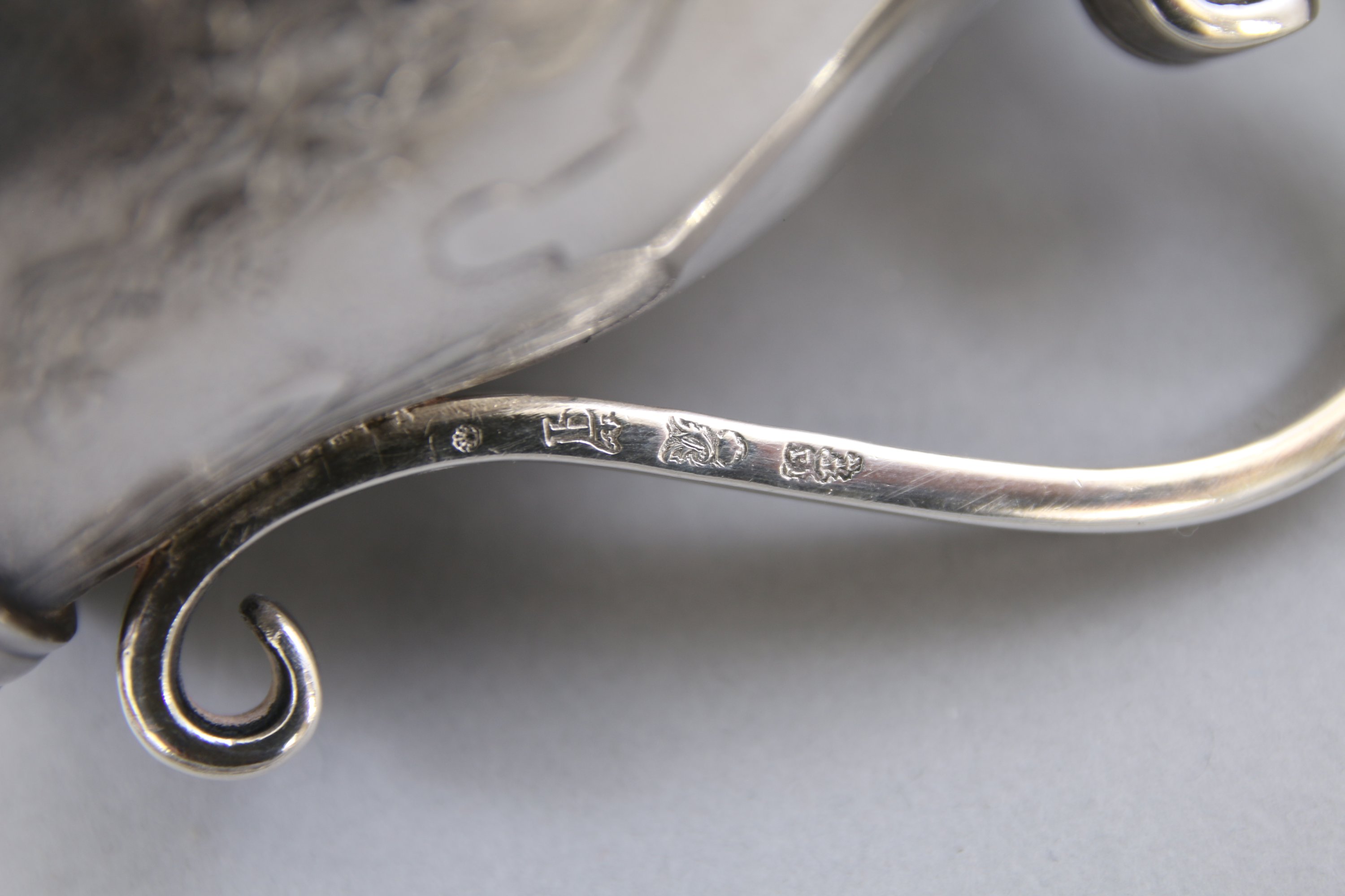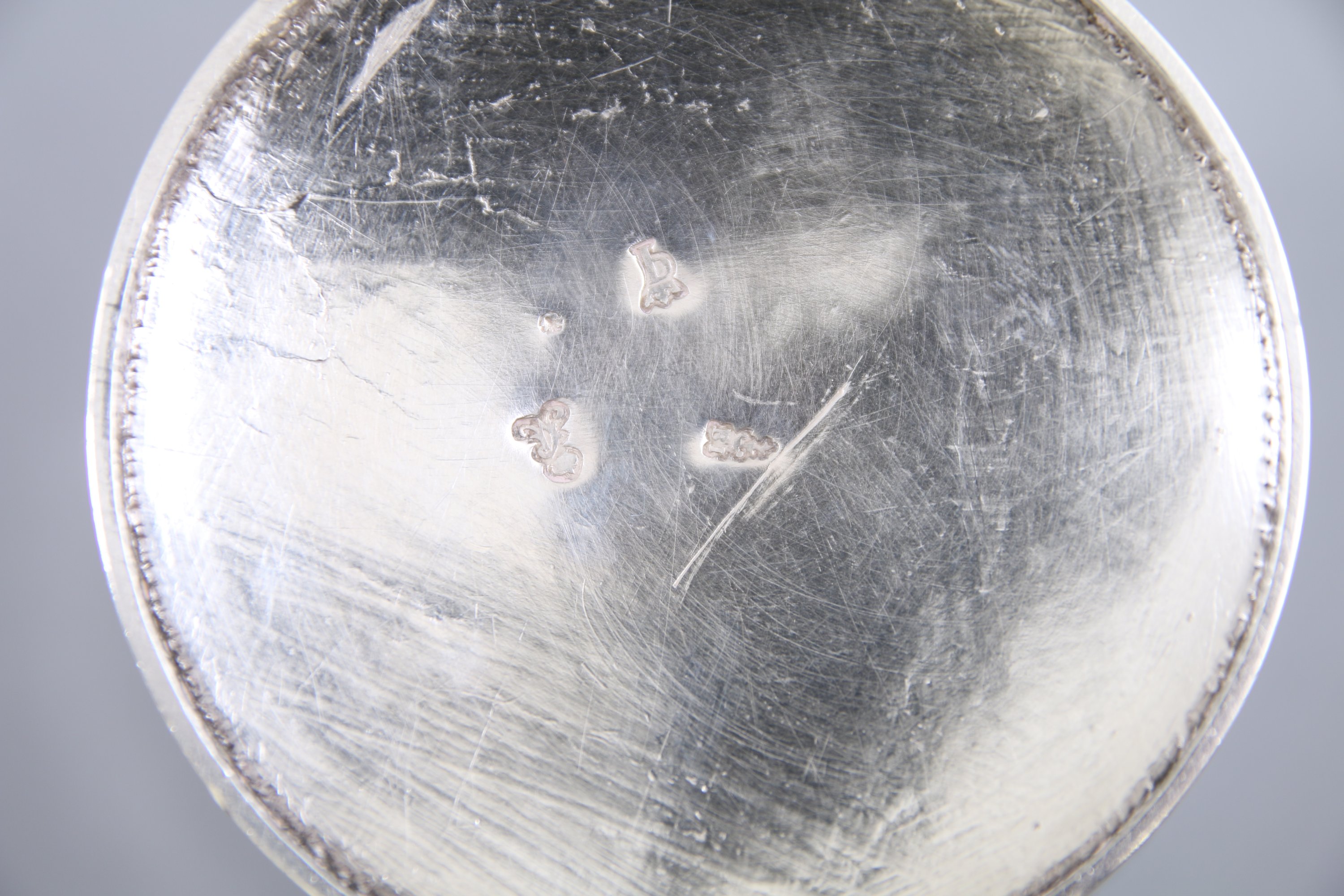 Poinçon de charge: "A couronné", 1756-1762. Poinçon de décharge: "une coquille vue par dessus", des menus ouvrages d'argent. Poinçon de jurande: "Q couronné", 1756-1757. Poinçon d'orfèvre: "BI", non identifié.