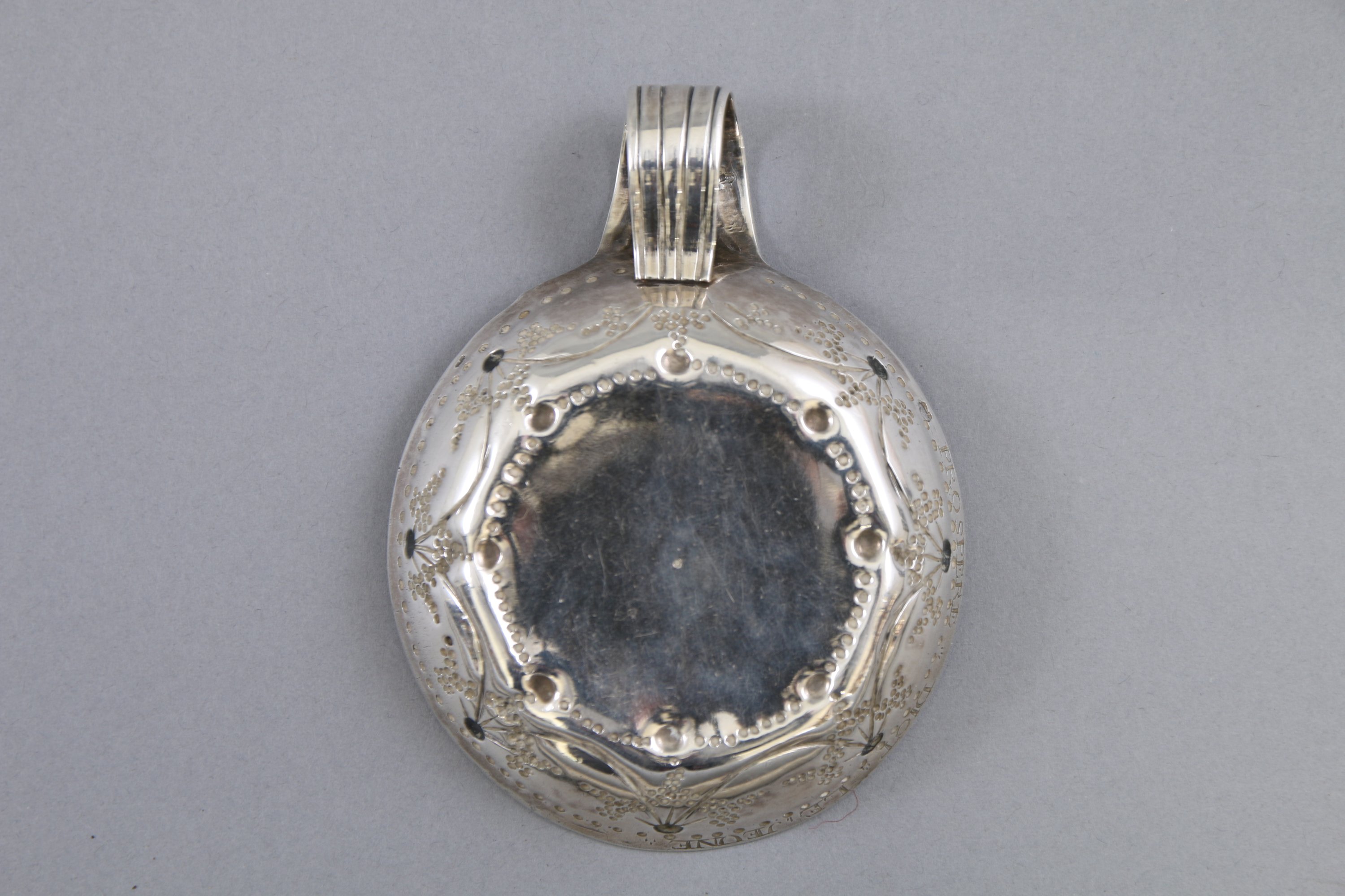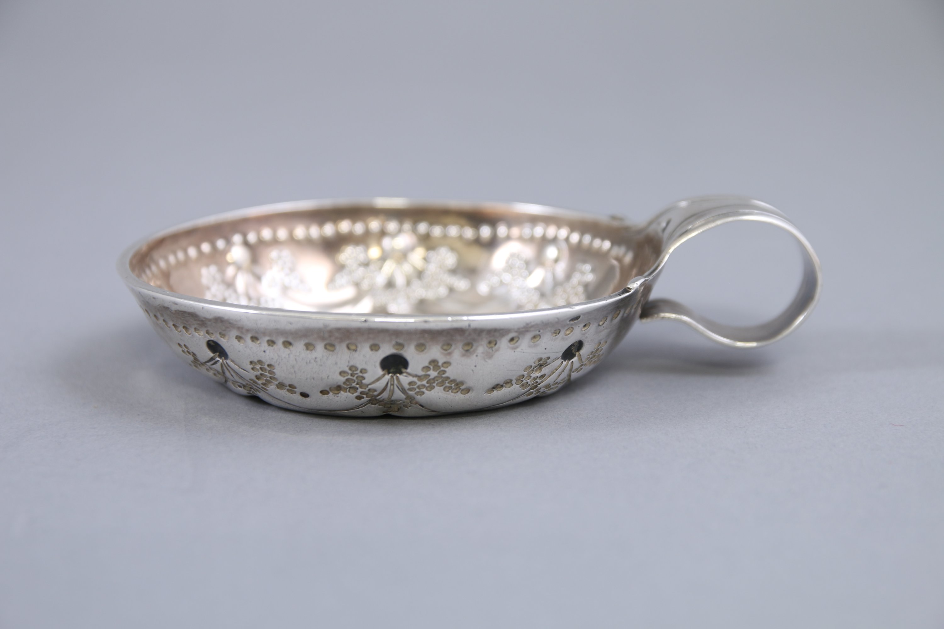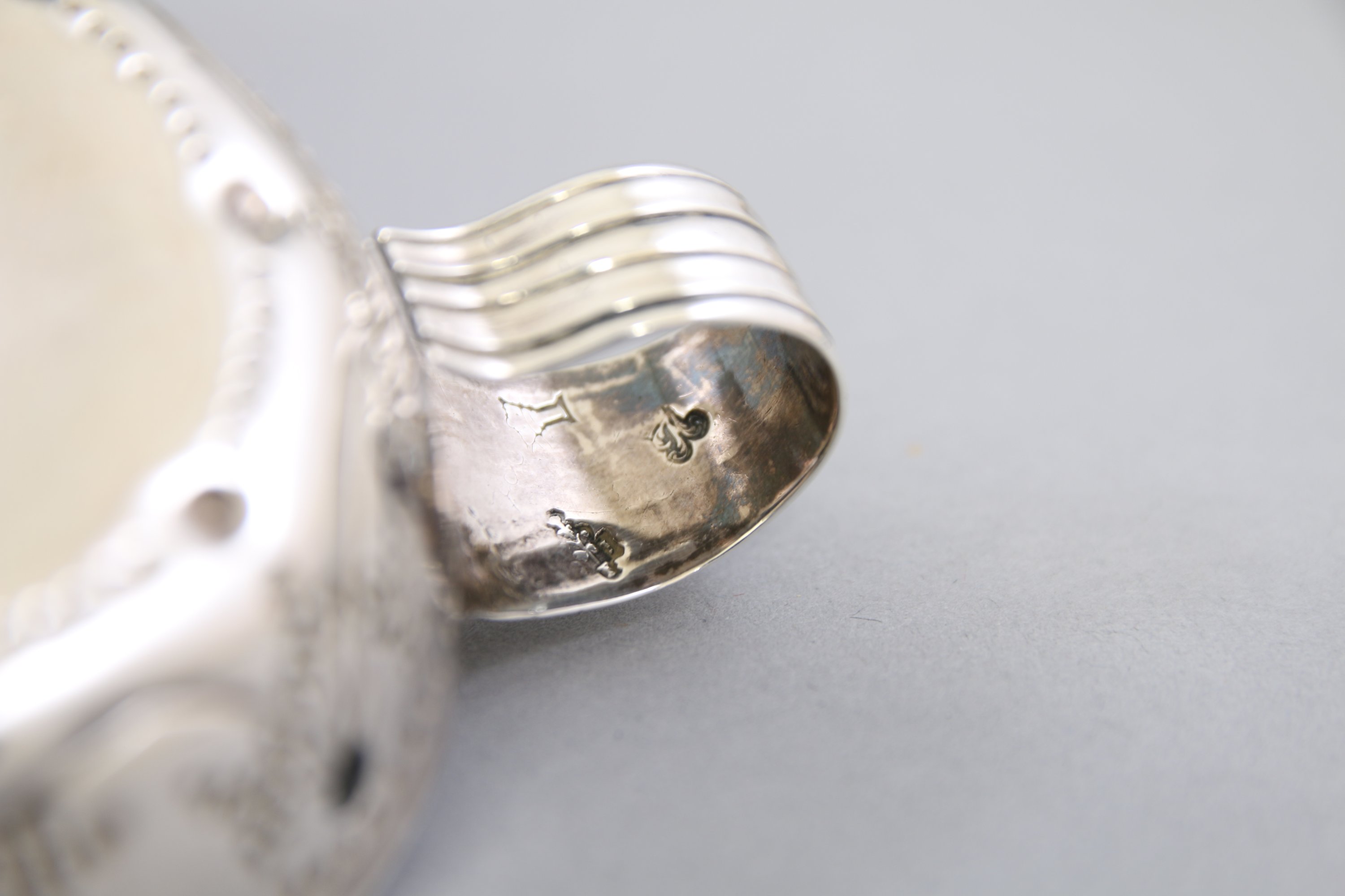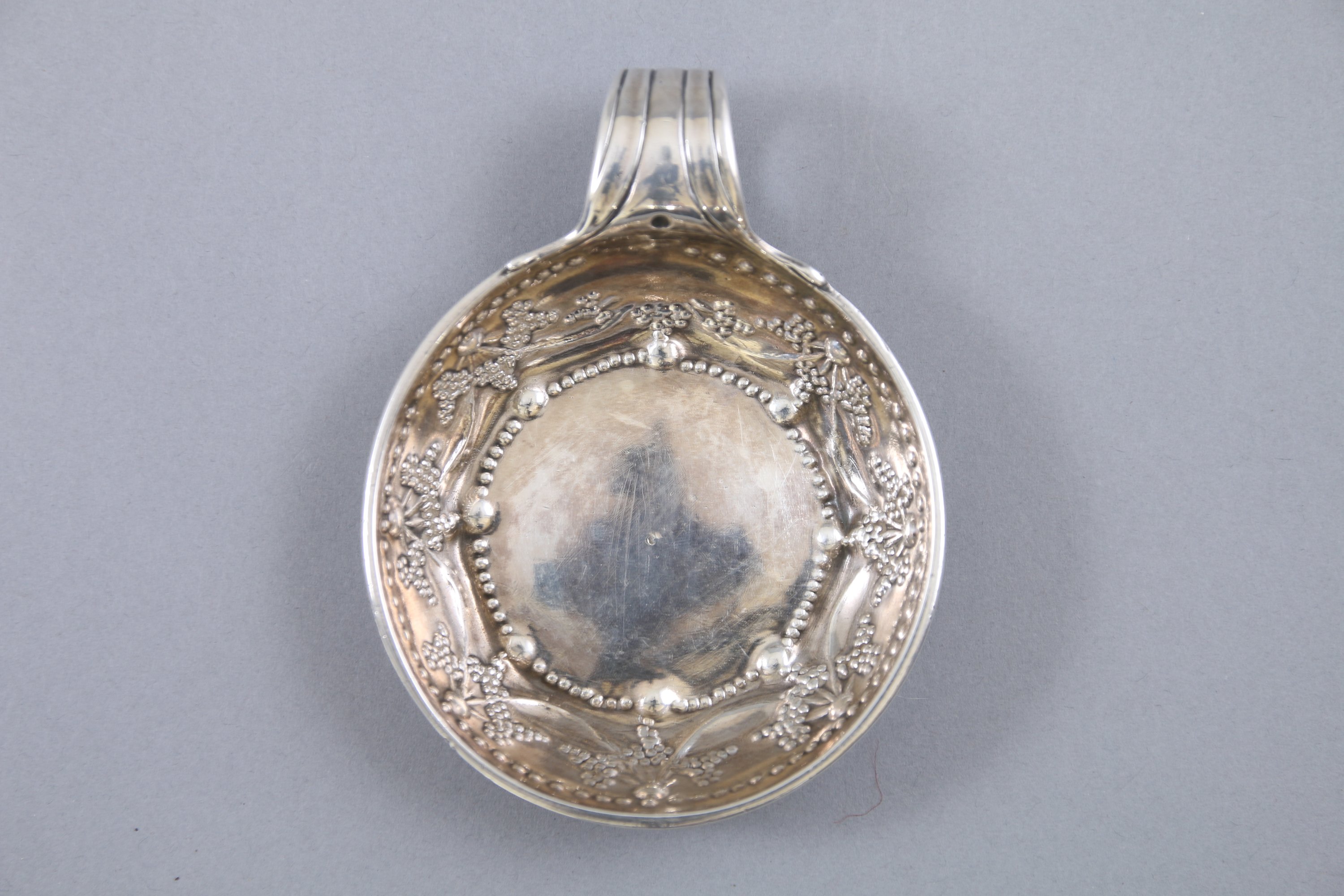 A décor de pampres de vigne et d'une frise de perles. L'anse à décor de godrons, gravé " Prospere Diot Le Jeune".