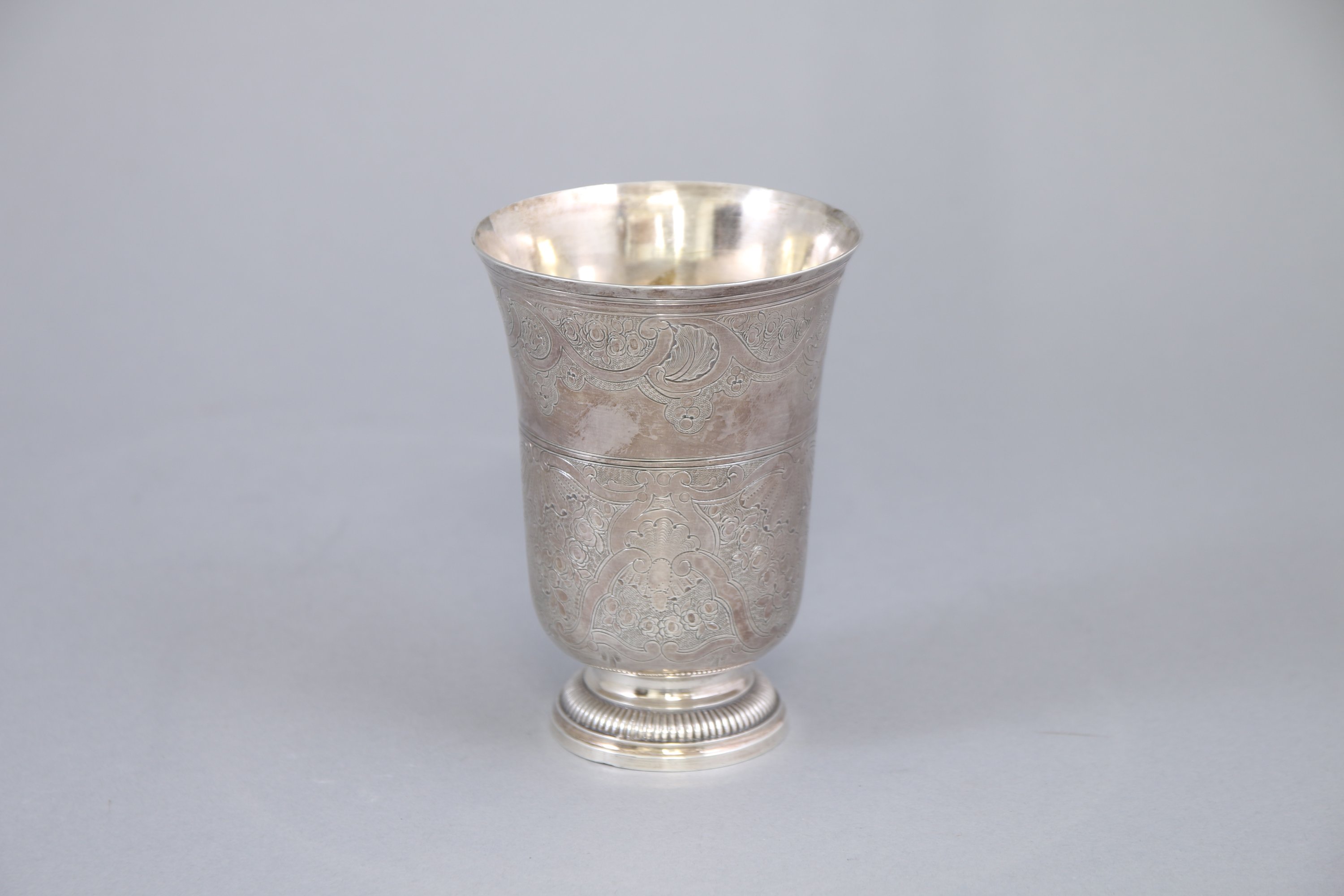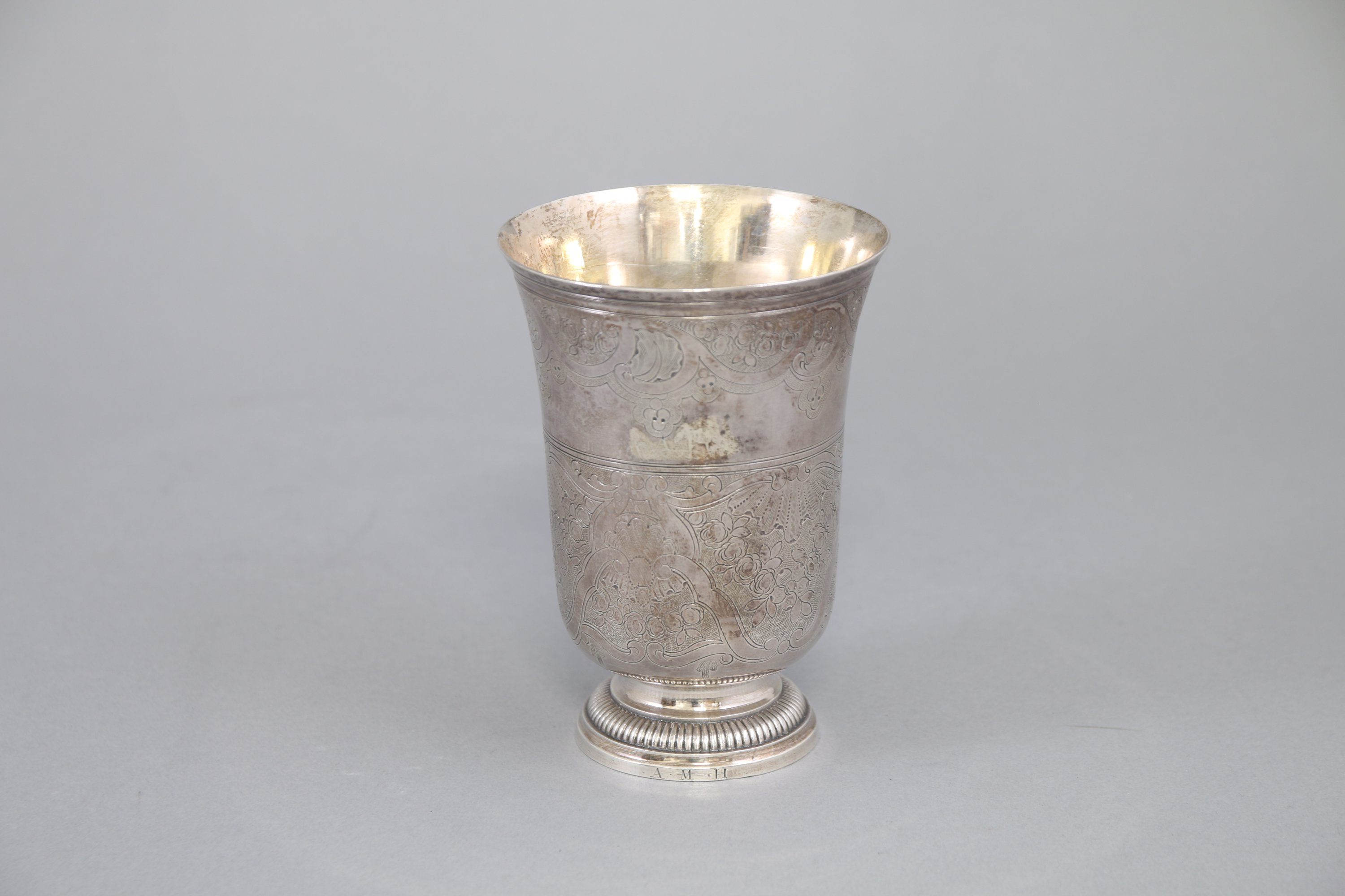 La lèvre évasée soulignée de filets surmonte un corps richement gravé sur deux registres au fond amati d'un décor d'enroulements, guirlandes fleuries, cartouches et coquilles. Le pied circulaire orné de godronse et marqué "A.M.H".