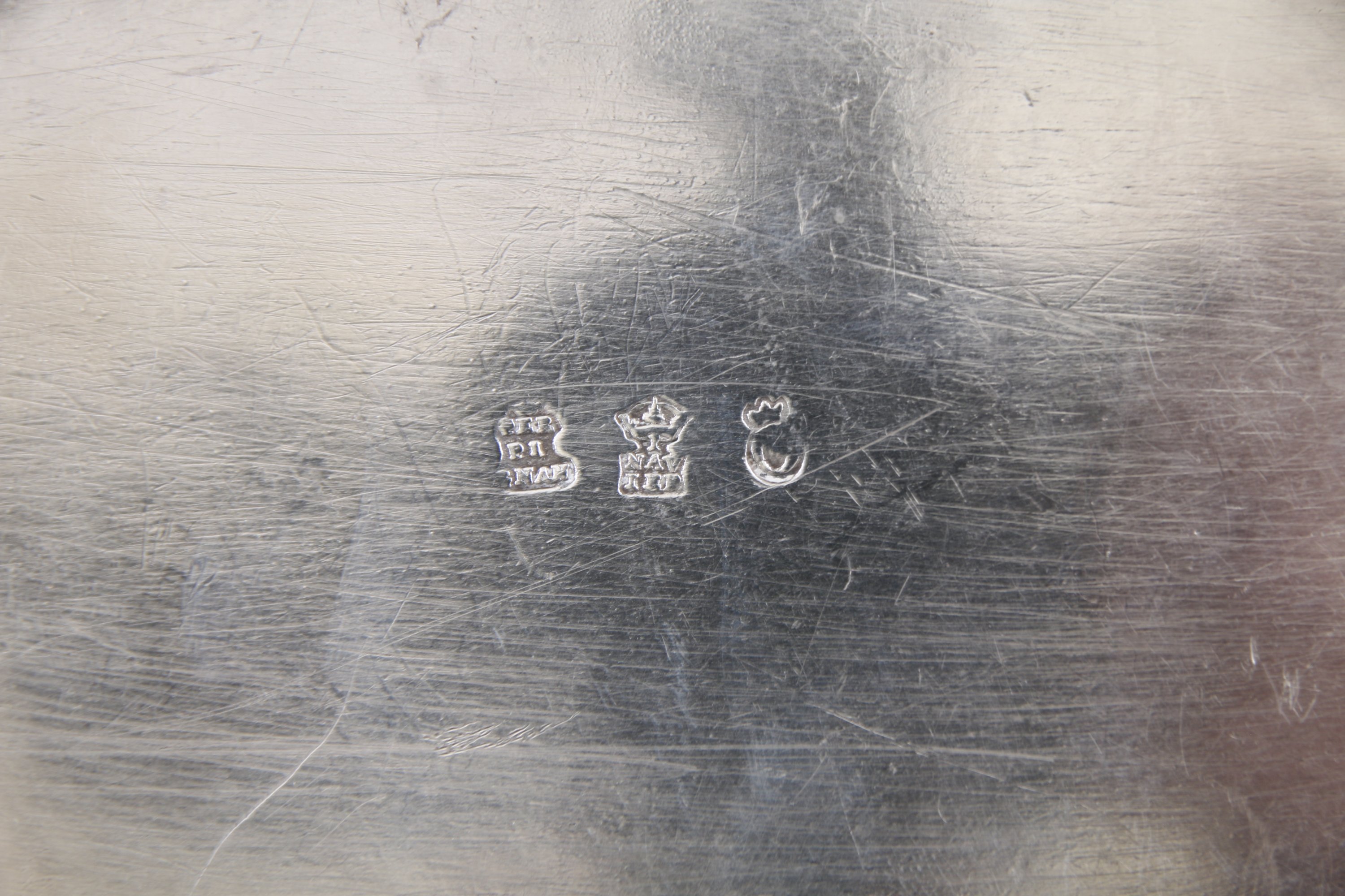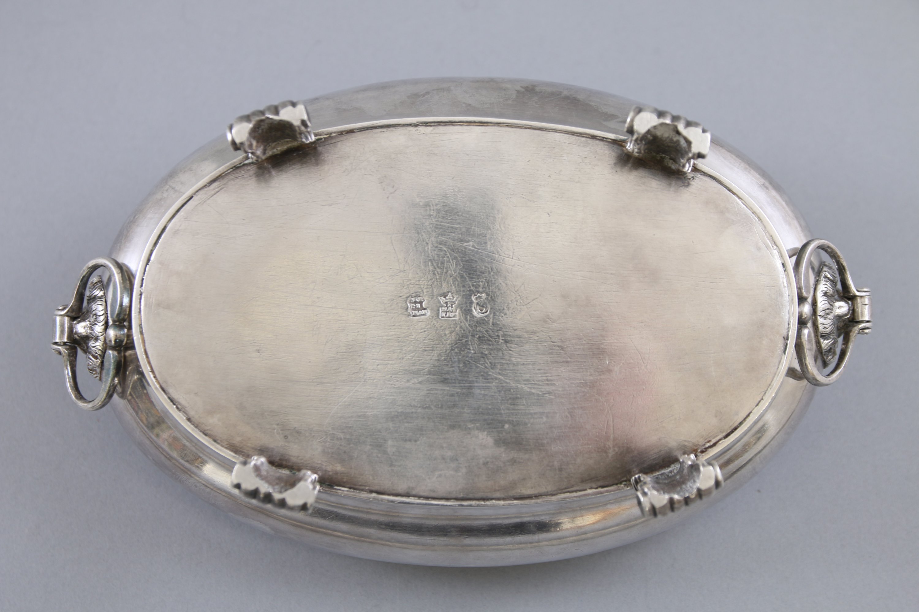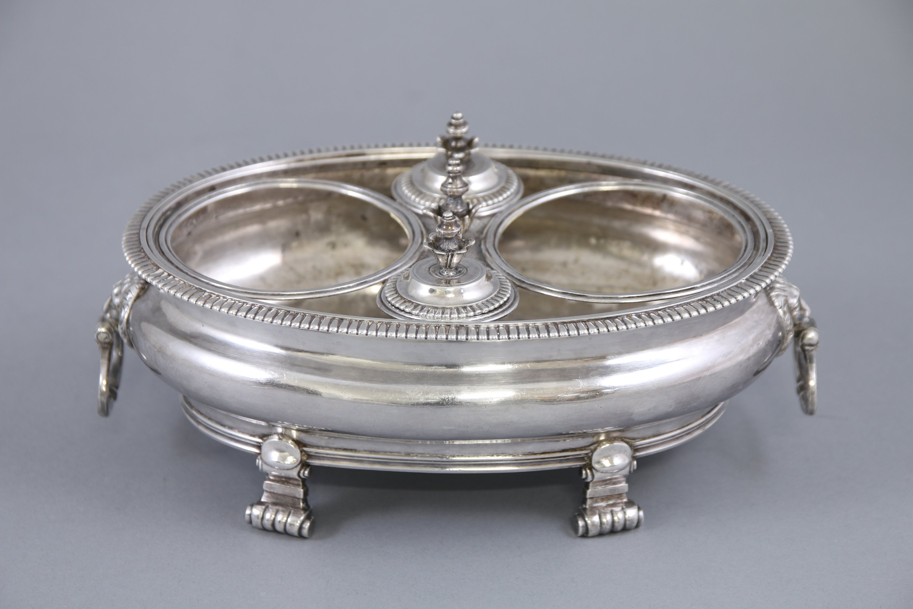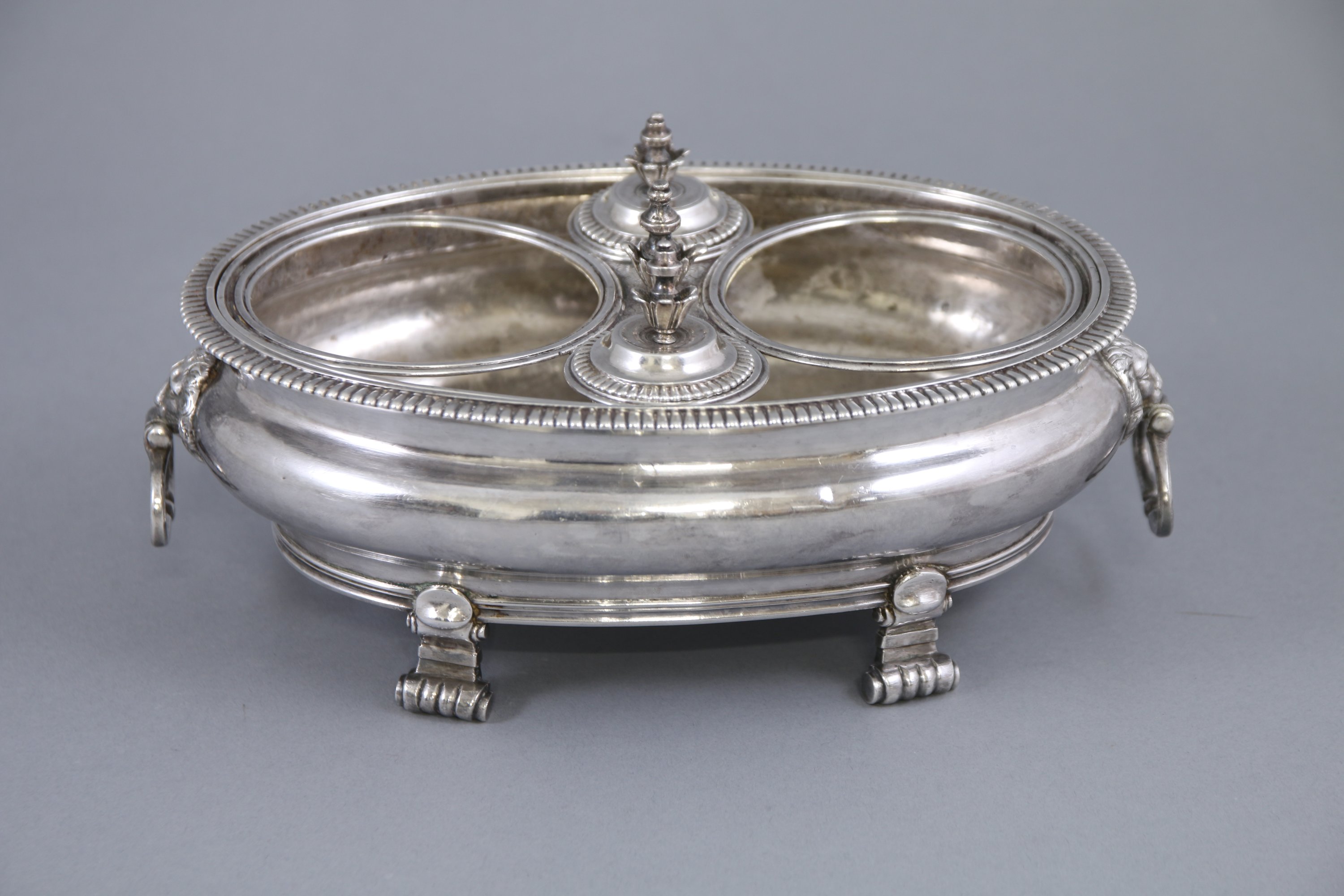 De forme ovale, le bord est souligné de denticules. Deux anneaux mobiles inscrits dans des mufles de lion. Il repose sur quatre pieds à enroulements.