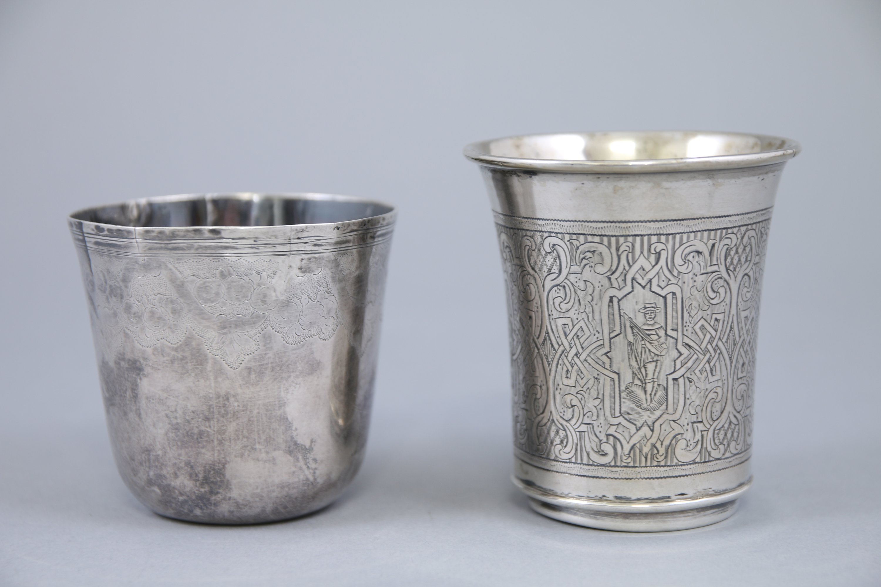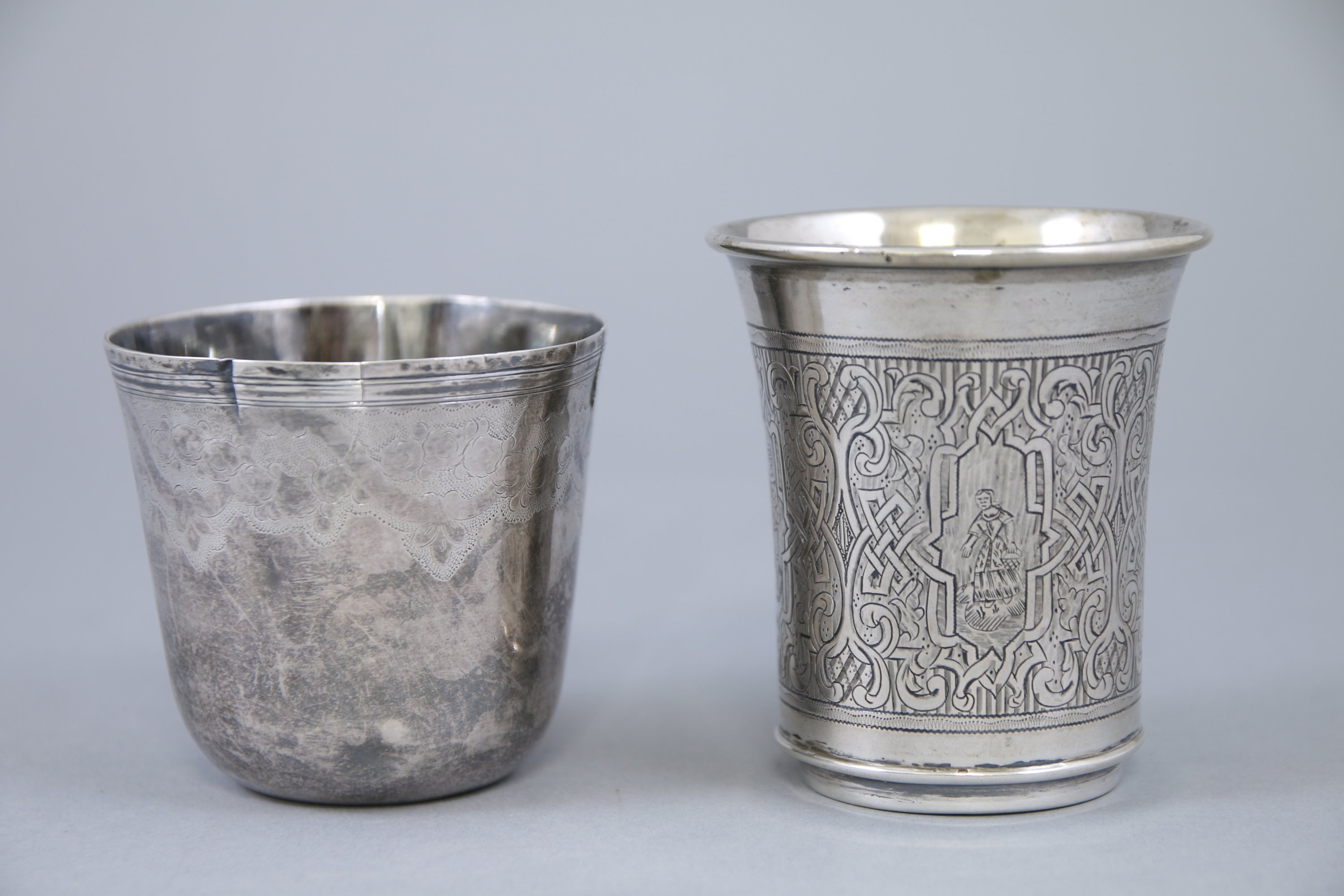 - La timbale à lèvre évasée et la panse à décor gravé d'enroulements de rinceaux entourant des cartouches présentant des femmes aux travaux des champs et des hommes musiciens. Travail russe. Haut. 8 cm. Poids 85 g.