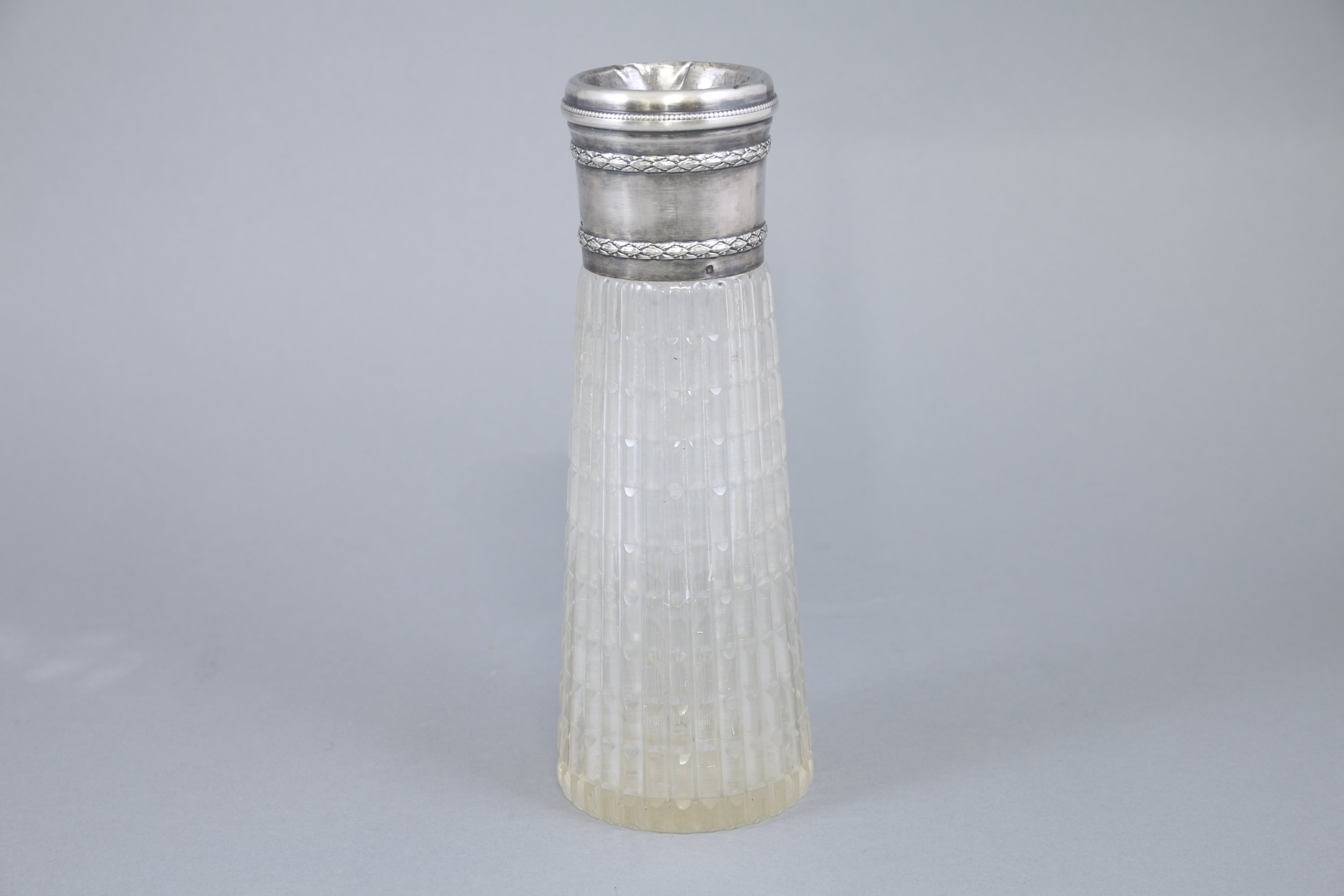 Joint: Vase à col en argent à décor d'une double frise de feuilles de laurier surmontant une panse tronconique en verre. Haut. 24 cm. Poids brut: 662 g (enfoncements).