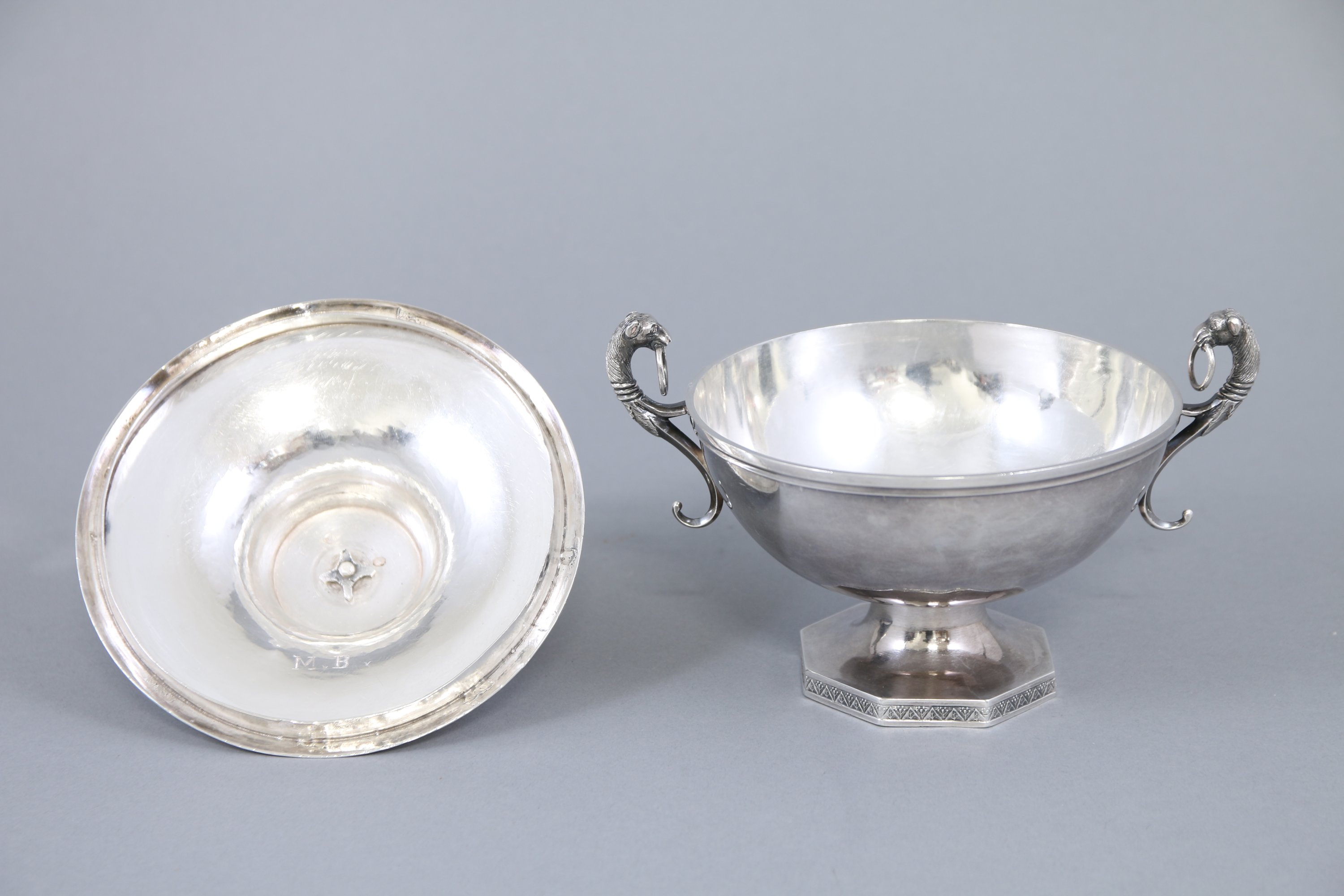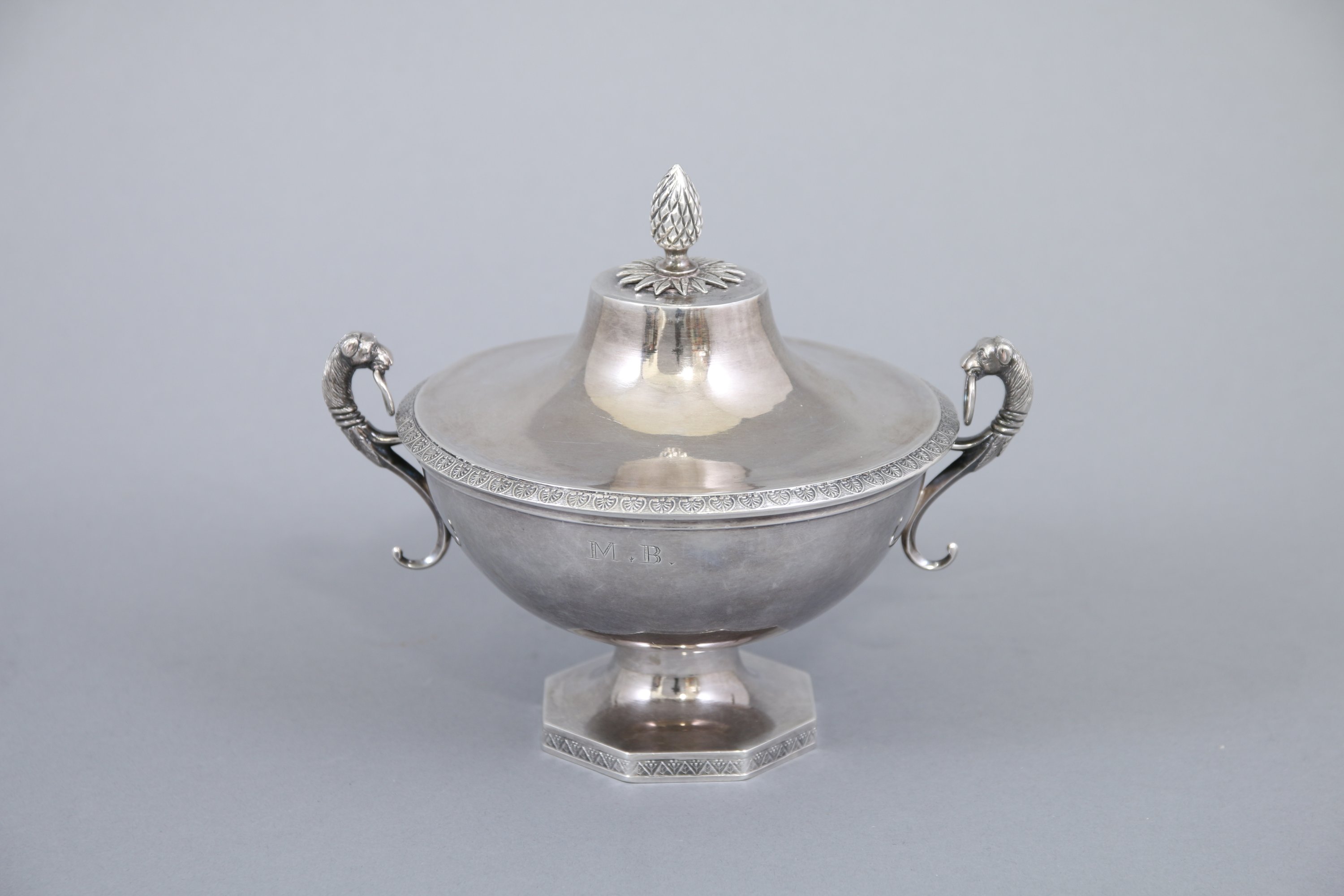 Le couvercle sommé d'une pomme de pin est inscrit sur une terrasse feuillagée. La lèvre décorée d'une frise de palmettes. Deux anses en forme de têtes de lion tenant des anneaux dans leur gueule. Le pied octogonal. Monogrammé "M.B".