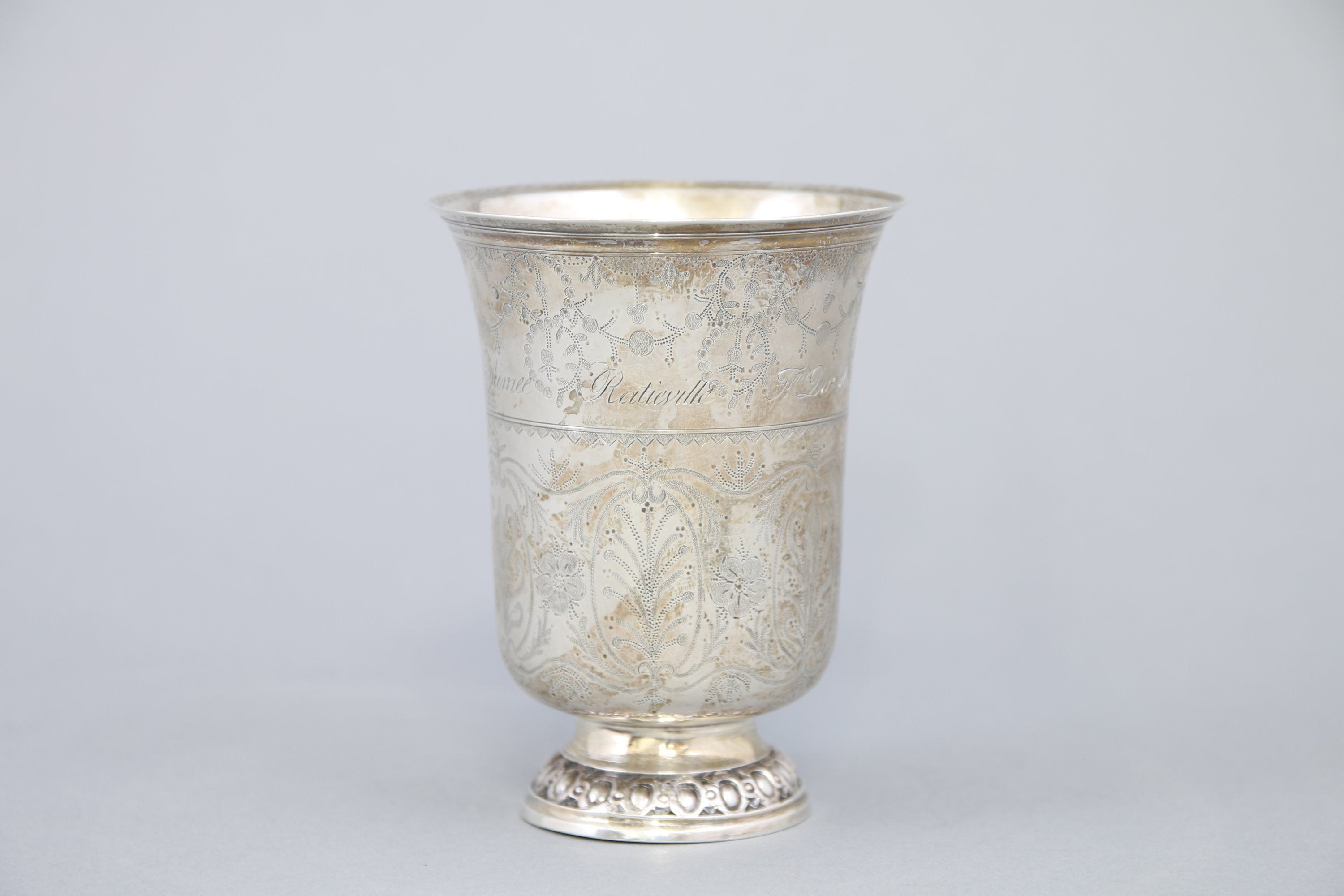 La lèvre évasée surmontant une panse richement gravée de cartouches aux palmes et feuilles d'eau en alternance de fleurettes entourant le nom "Aimée Ratieville Fme Duval". Le pied est orné d'oves et se trouve marqué de la mention "A.R Femme Duval".