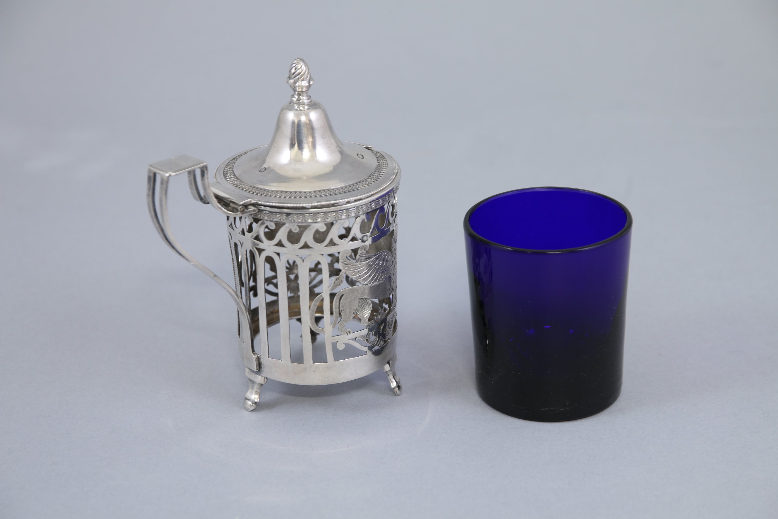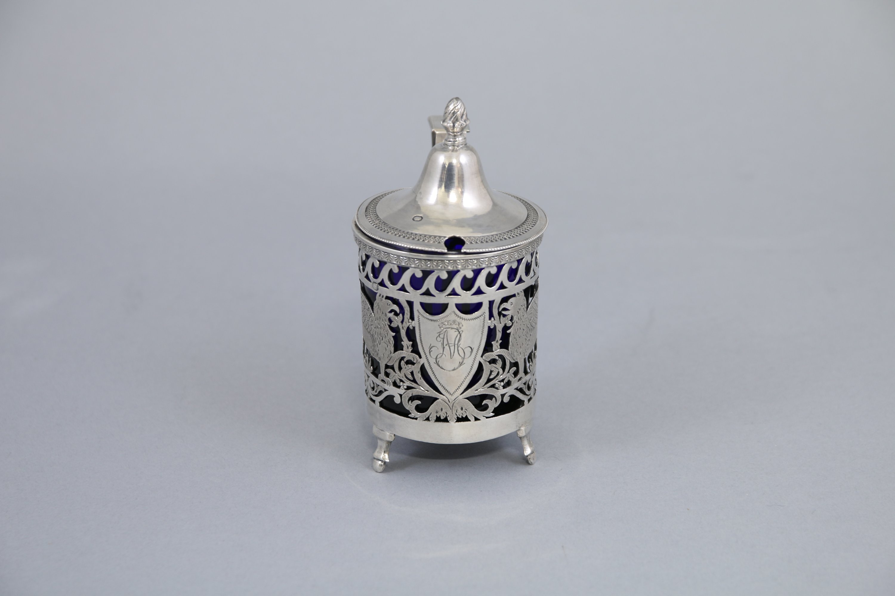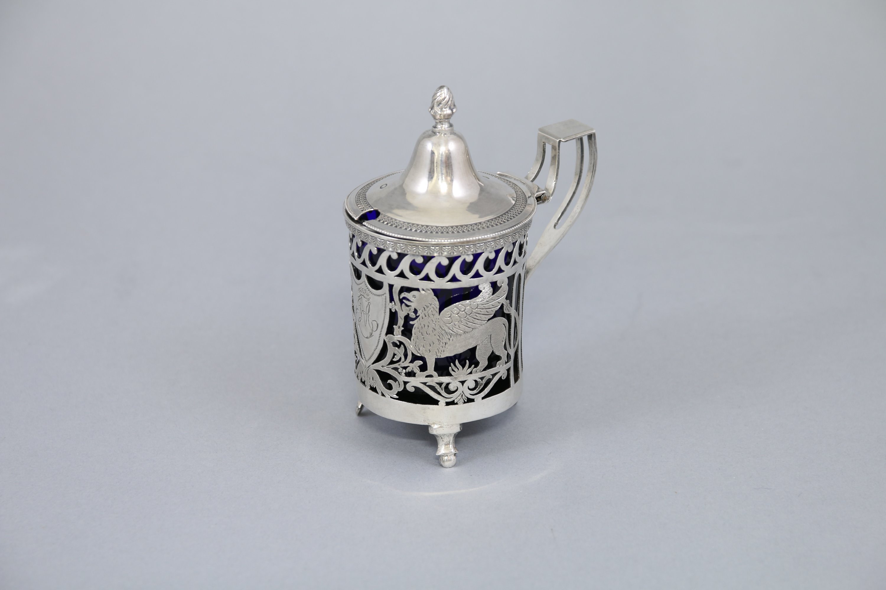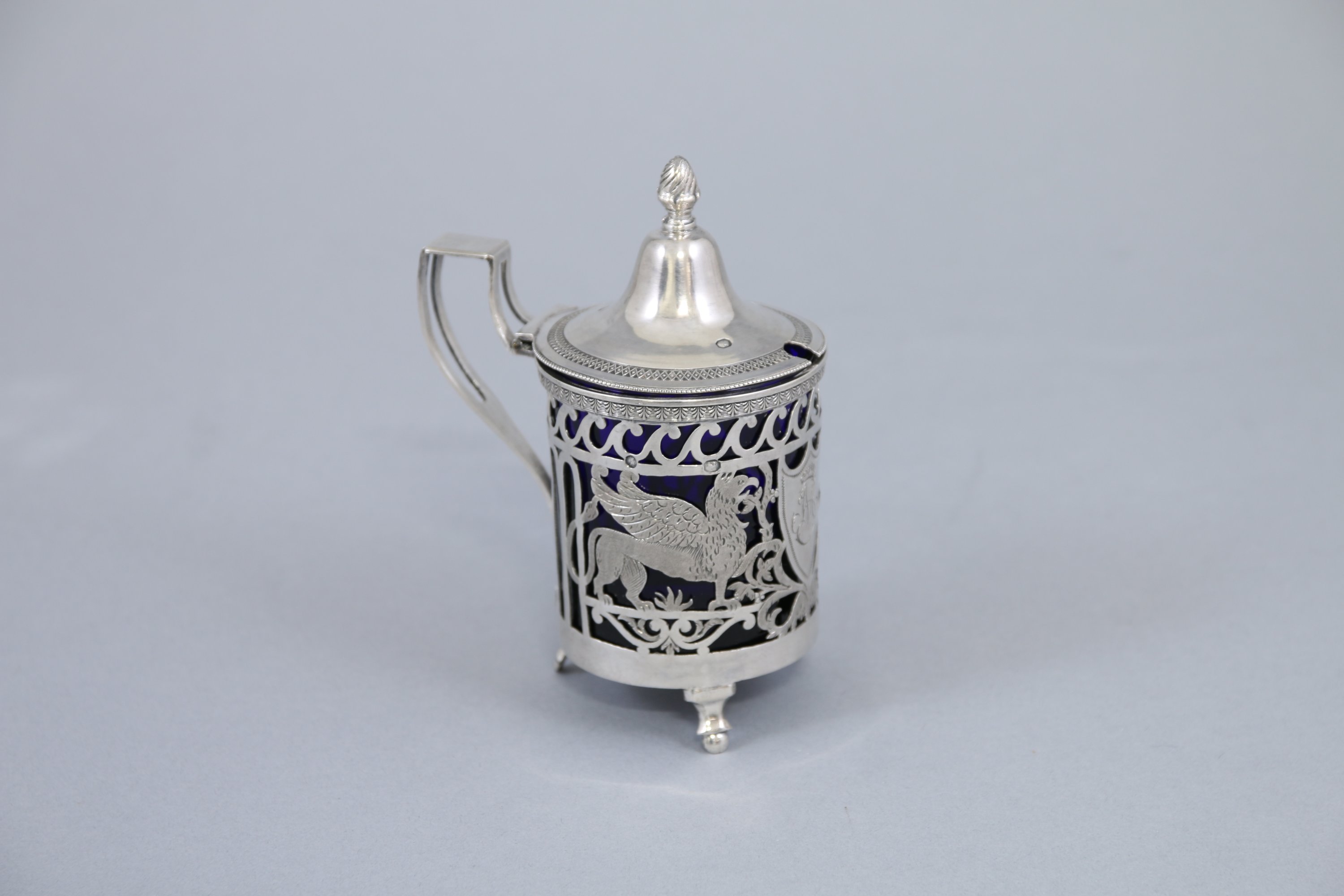 Décor repercé aux griffons affrontés autour d'un blason monogrammé "MB" sous une couronne de lauriers, frises de postes et palmettes. Le fretel à décor d'une pomme de pin sur un couvercle orné d'une frise de quadrillages et d'une frise de perles. Il repose sur trois pieds gaines terminés par des boules.