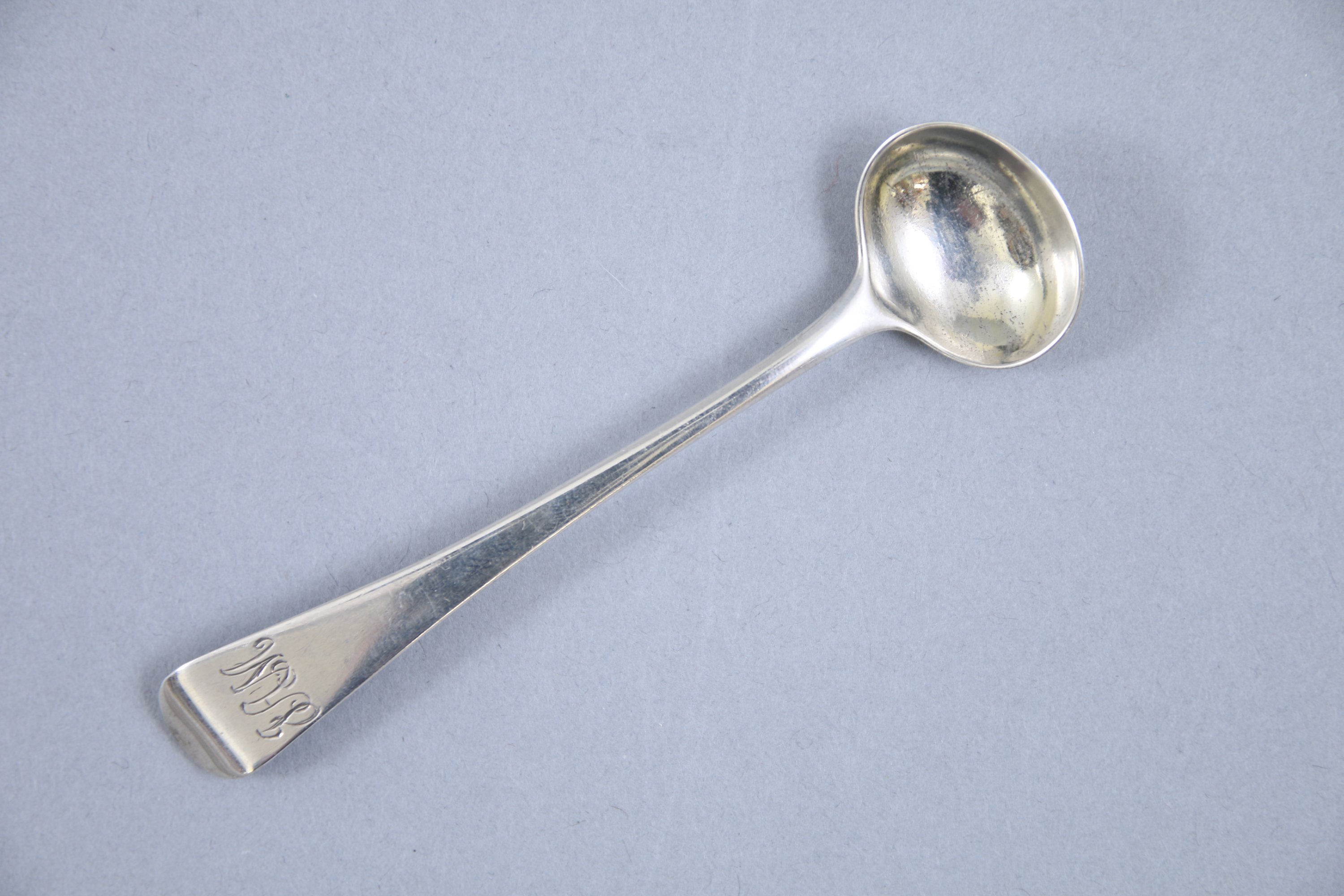 Joint: une cuiller à moutarde en argent modèle uniplat monogrammé "EAM". Travail anglais entre 1836 et 1849 (poinçon de William IV) Long. 10,5 Poids: 9,9 g.
