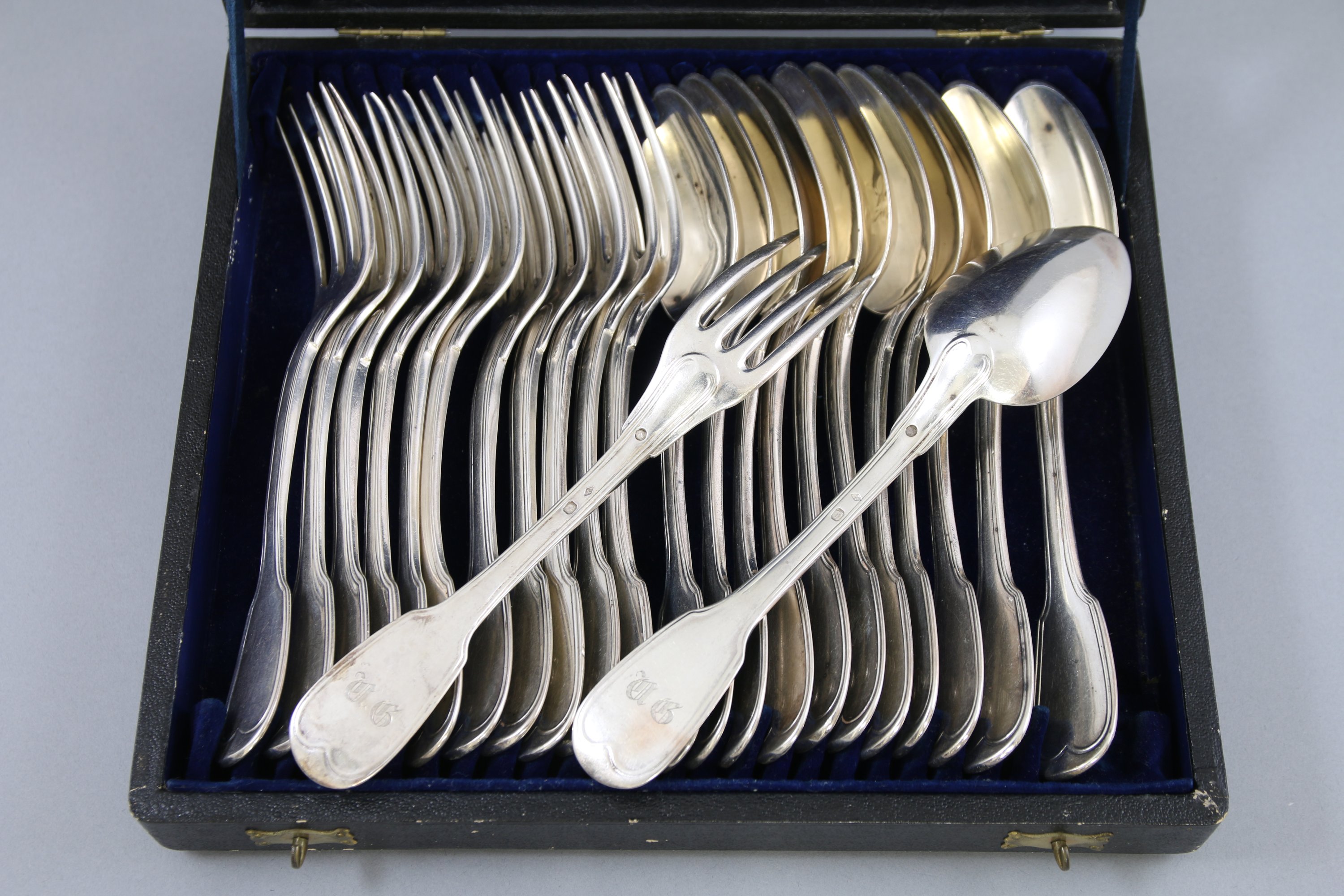 Poinçons: deuxième Coq 1er titre pour trois couverts et Vieillard (1819-1838) pour neuf couverts. Poinçons de grosse garantie. Plusieurs poinçons d'orfèvres différents.