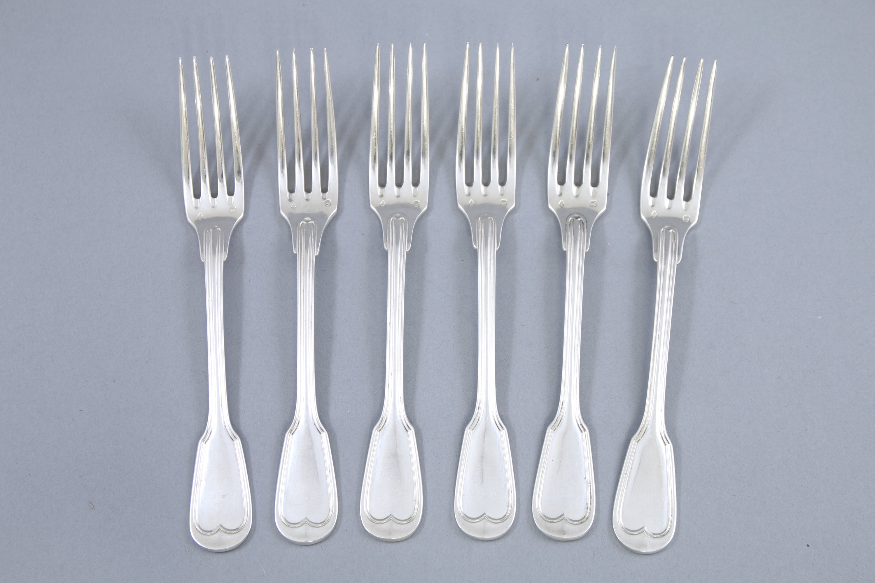 Joint: Six fourchettes à entremets, modèle filet. Poinçon Minerve 1er titre. Orfèvre Henri Soufflot (1884-1910). Poids: 293 g.