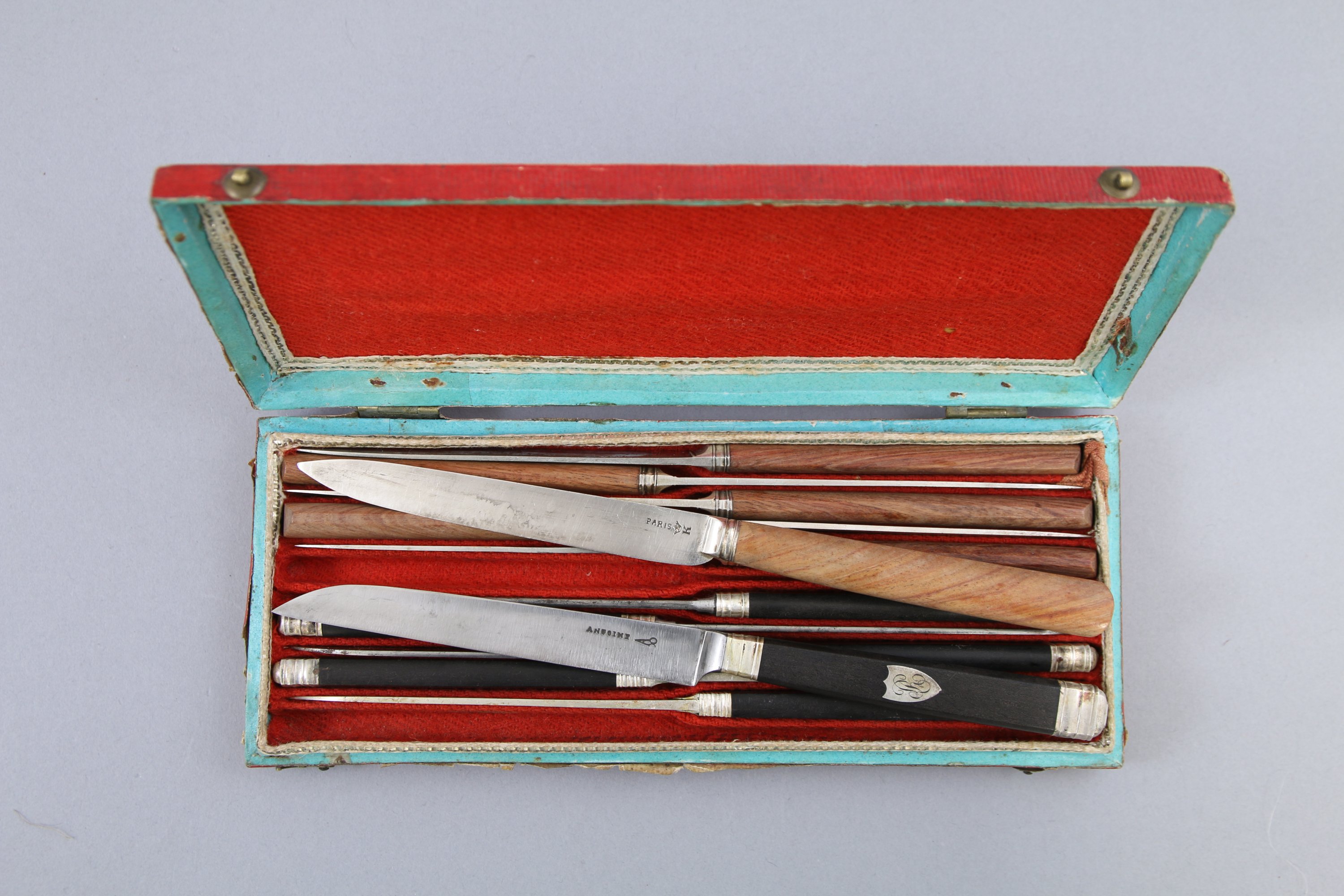 Six couteaux à manches en ébènes, dont deux à lames en argent et quatre à lames en acier, viroles, pommeau et et écusson "LL". orfèvre: Joseph Antoine (actif de 1799 à 1824), les autres marqués "Antoine avec un ciseau" proviennent vraisemblablement du même atelier.