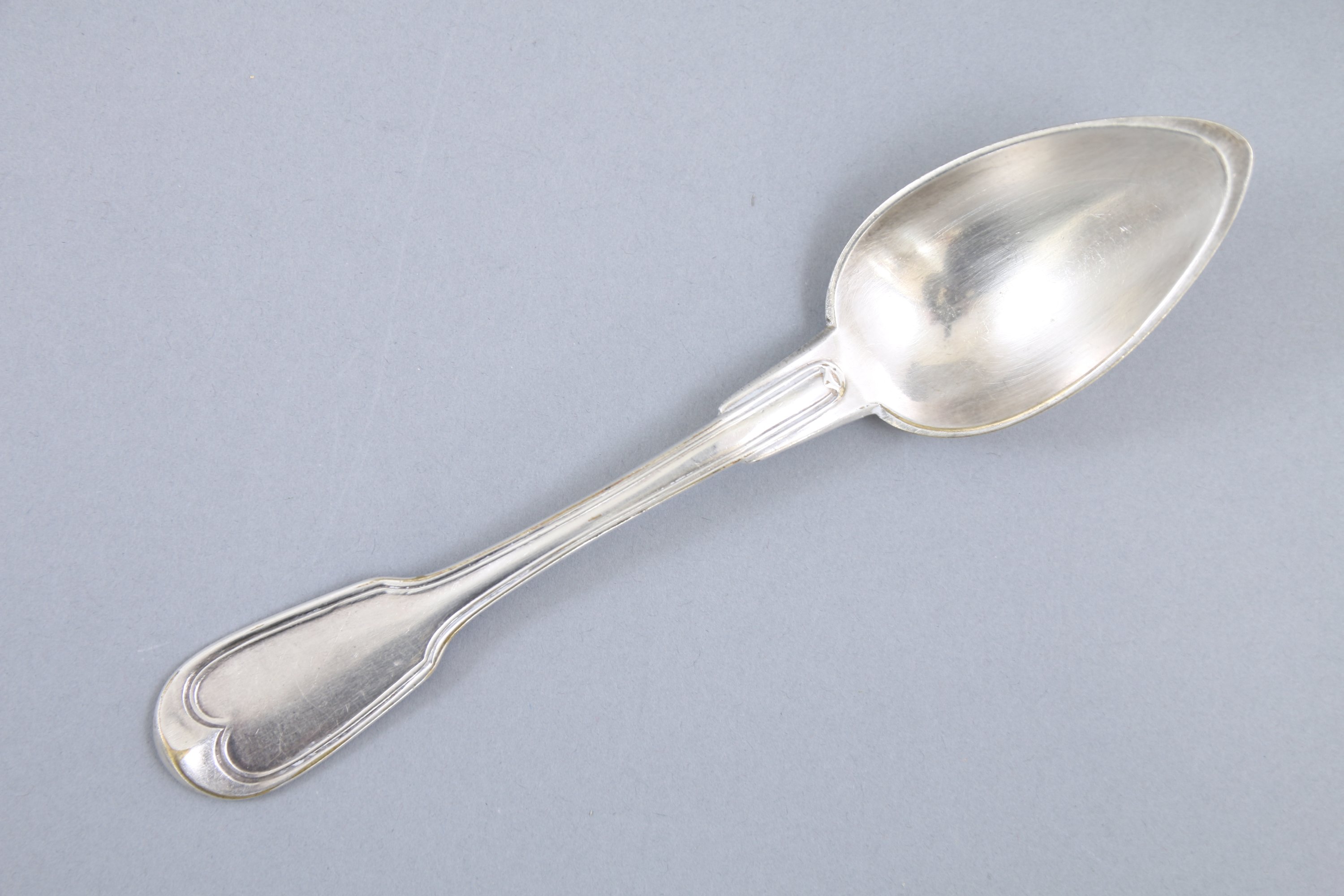 Joint: une cuiller de table en argent, modèle filet, monogrammée "RD". Orfèvre: Charles Christofle. Poids: 88 g.