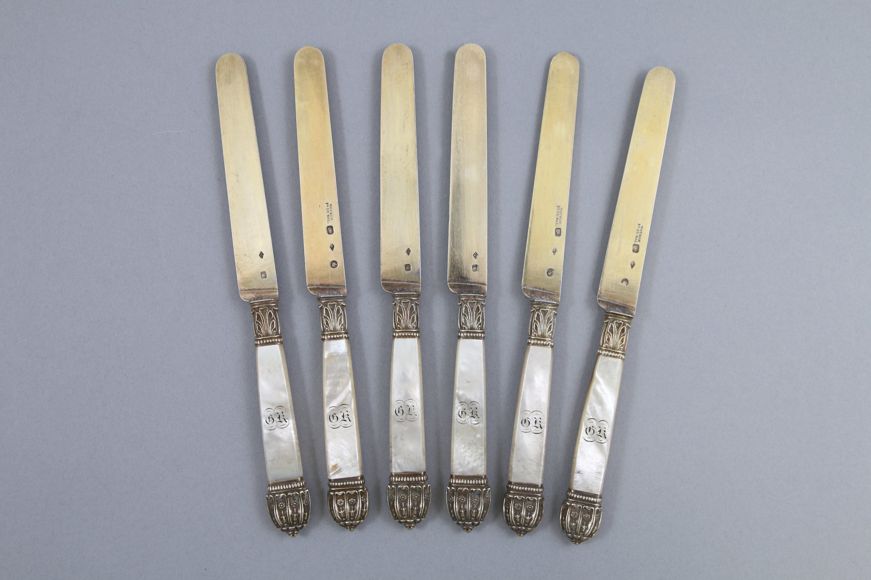 Lames en vermeil, viroles et pommeaux en argent à décor de fleurs et de palmes, manches en nacre monogrammés "GR".