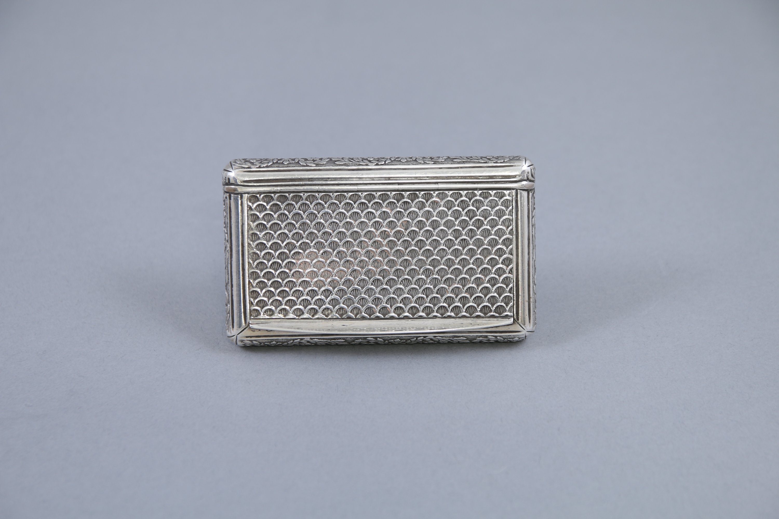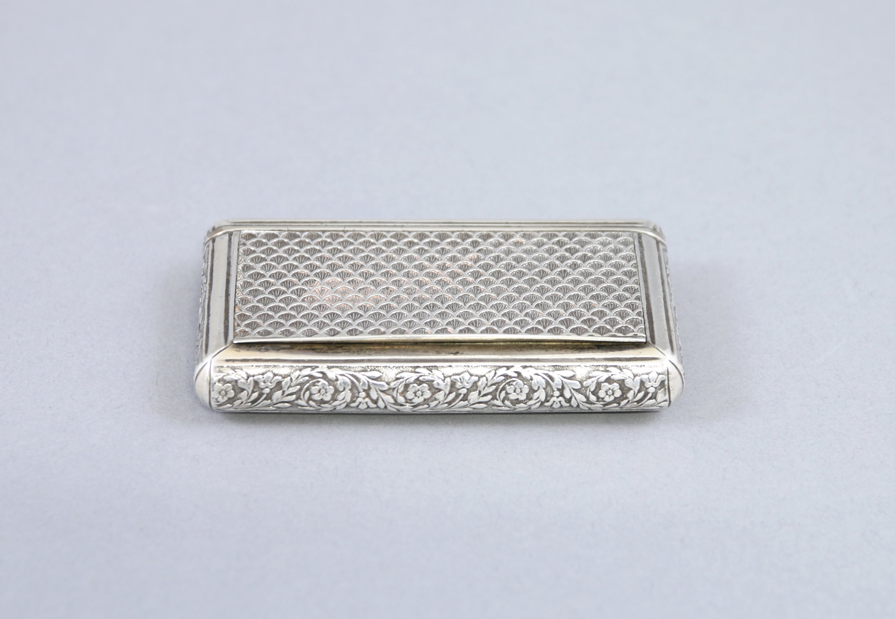 Le couvercle est décoré d'écaille, les côtés de guirlandes de fleurs et le revers de cannelures.