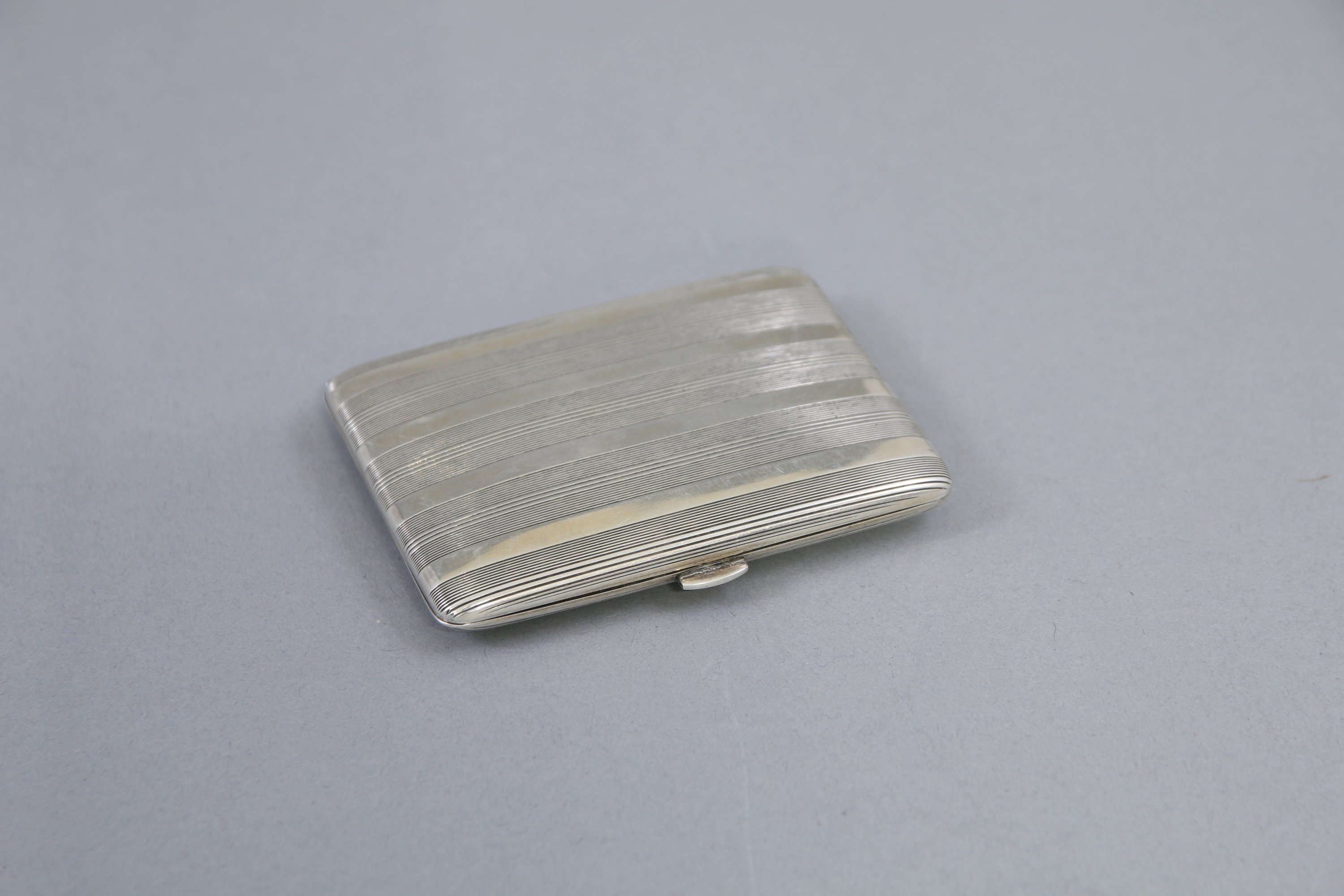 Joint: Etui à cigarette en argent à décor guilloché et intérieur doré. Poinçon tête de sanglier. Orfèvre non identifié "EF avec une fève". Poids: 78,6 g.