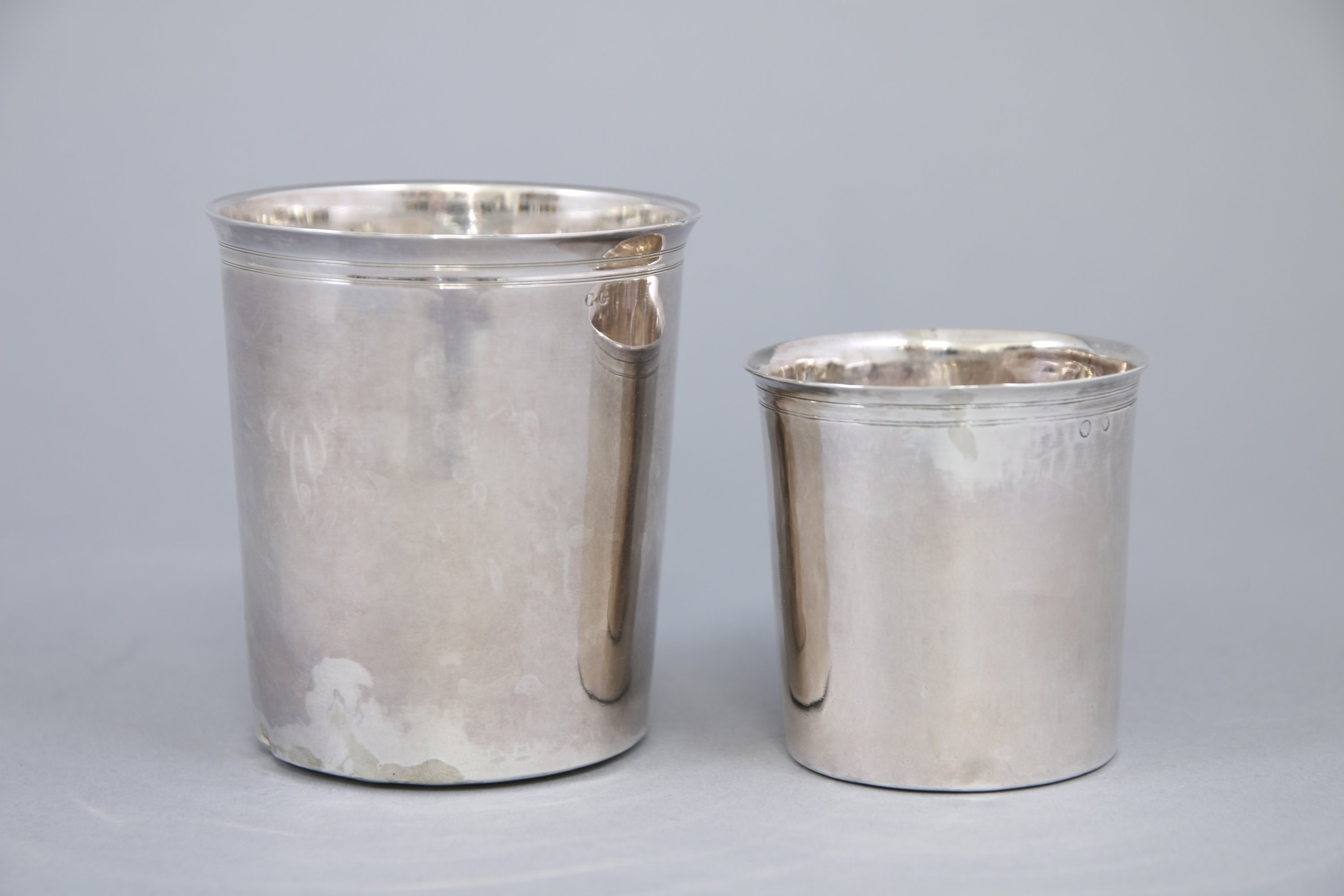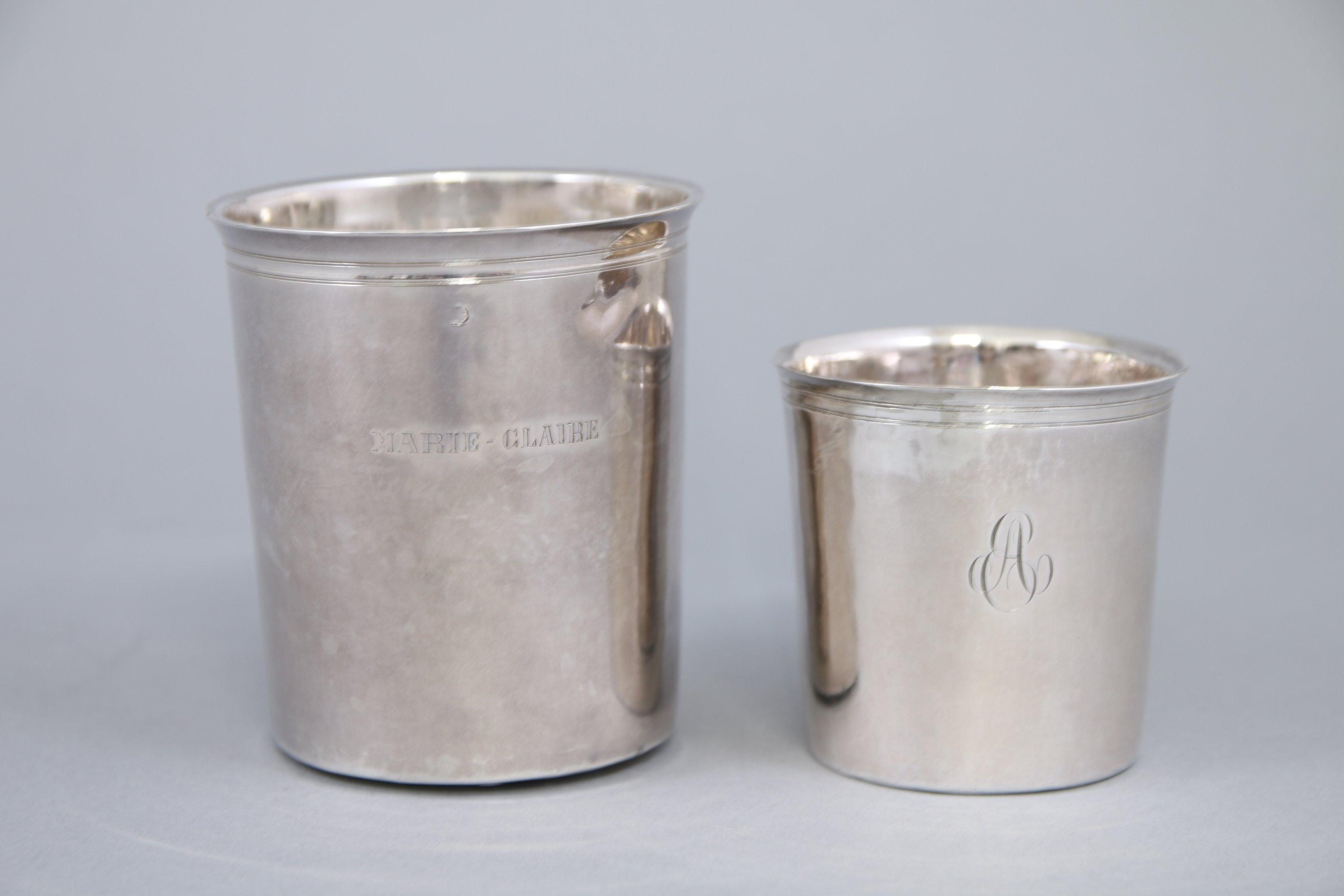 - La seconde monogrammée "AS". Poinçon: deuxième Coq 1er titre (1809-1819). Haut. 6 cm. Poids: 57 g.