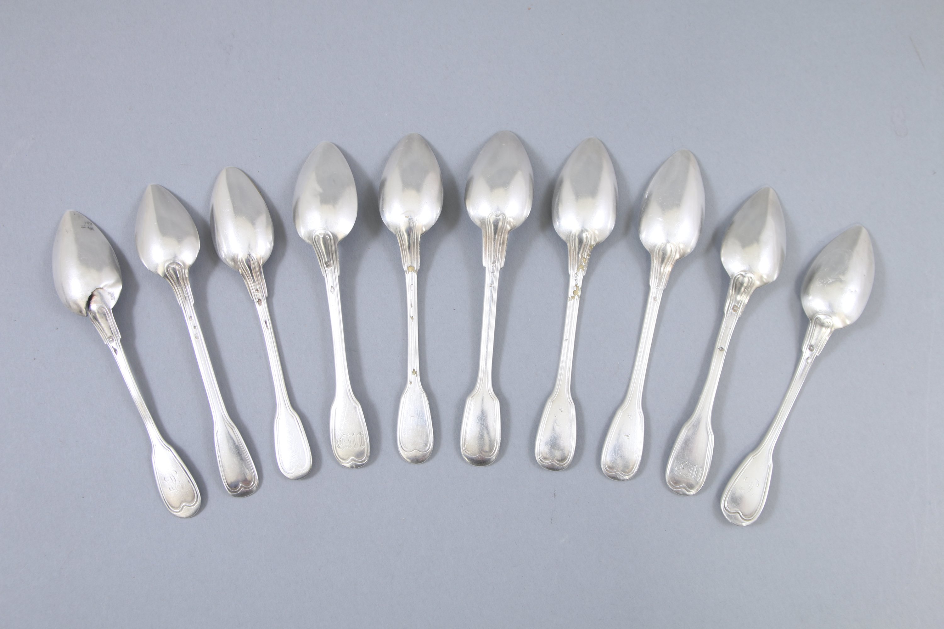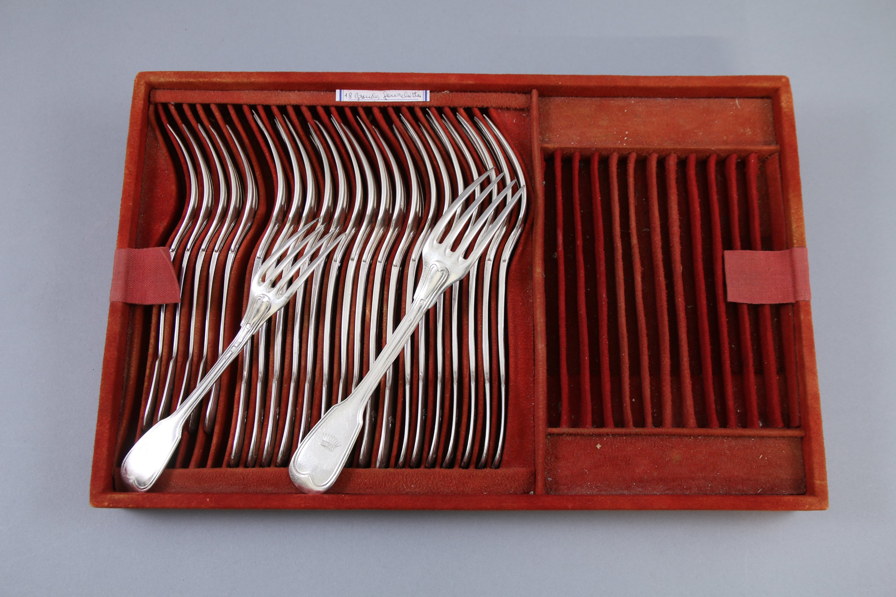 Modèle à filets-contours comprenant 18 fourchettes de table, 13 cuillers de table, 6 couverts à entremets, 9 cuillers à café et une cuiller à moka. La plupart des pièces gravées d'une couronne comtale.