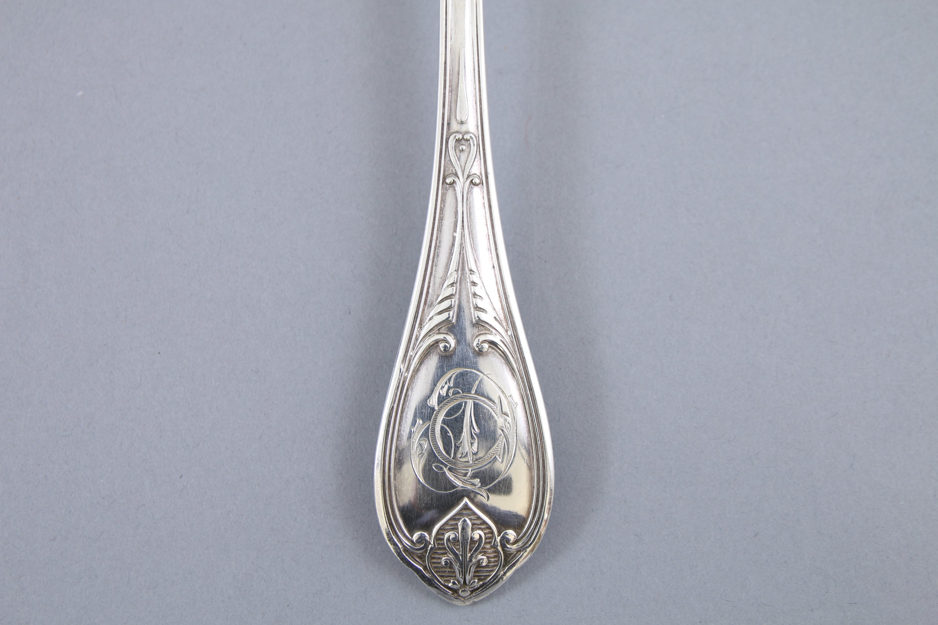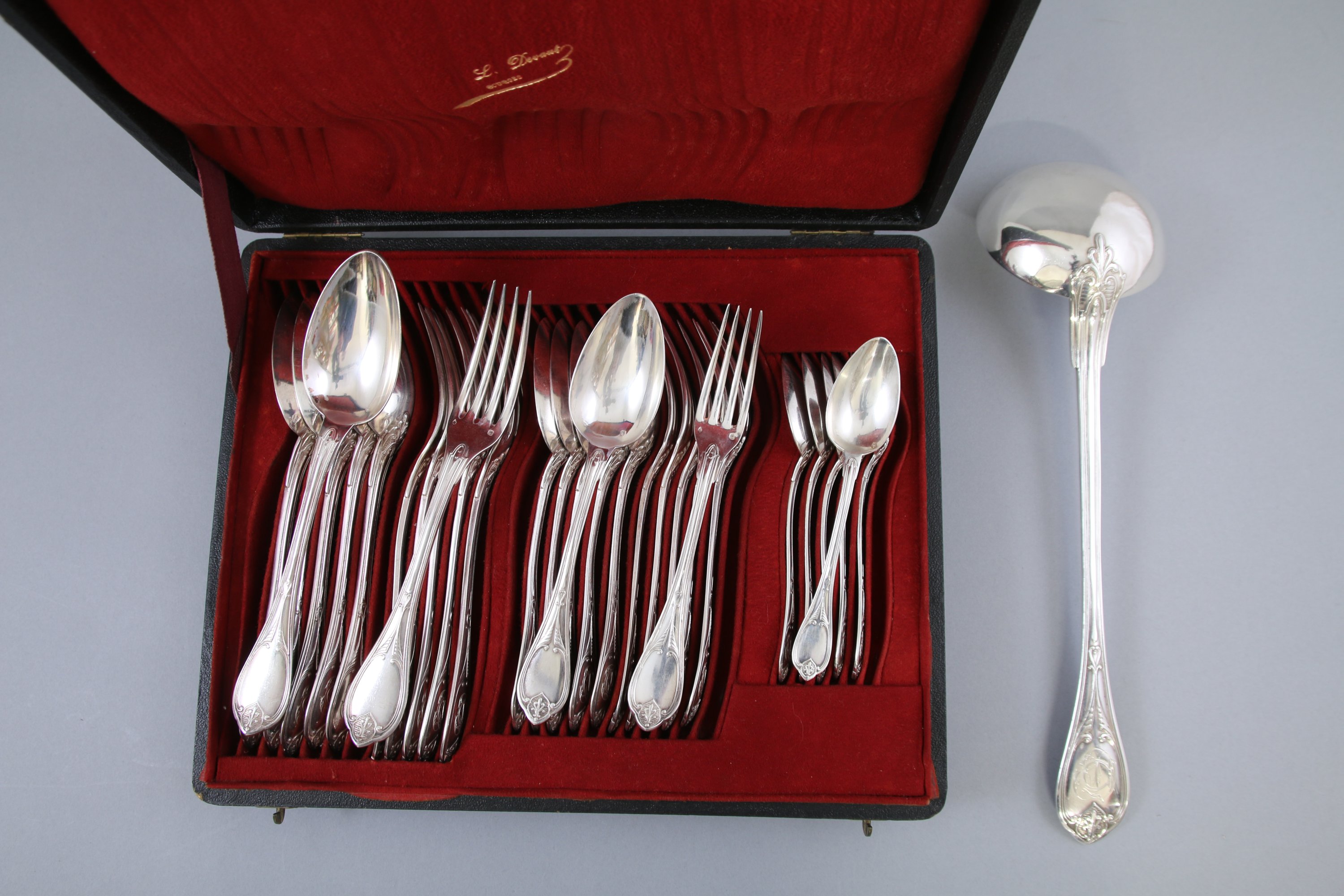 Modèle à fleurons, monogrammée "CD". Elle comprend 18 couverts de table, 18 couverts à entremets, 18 cuillers à café, une louche.