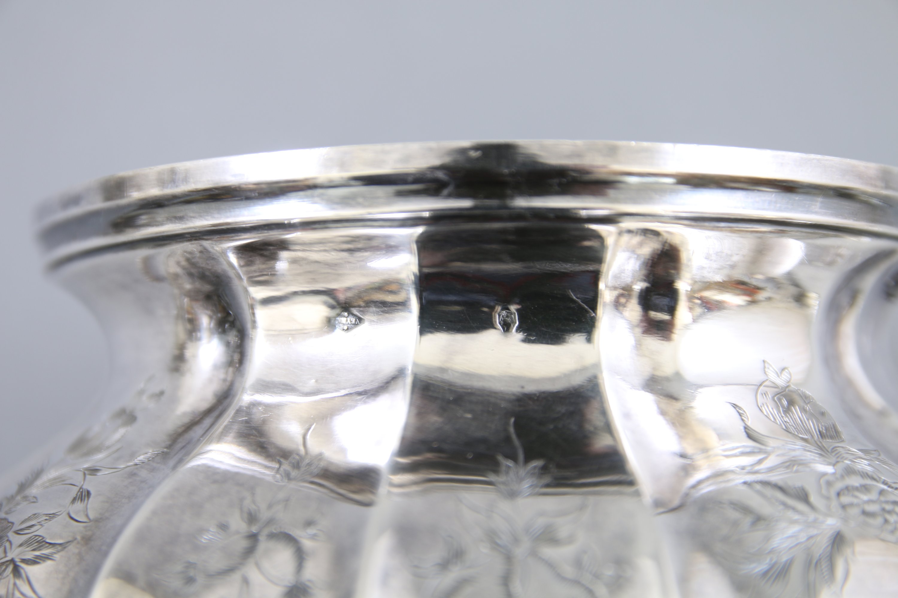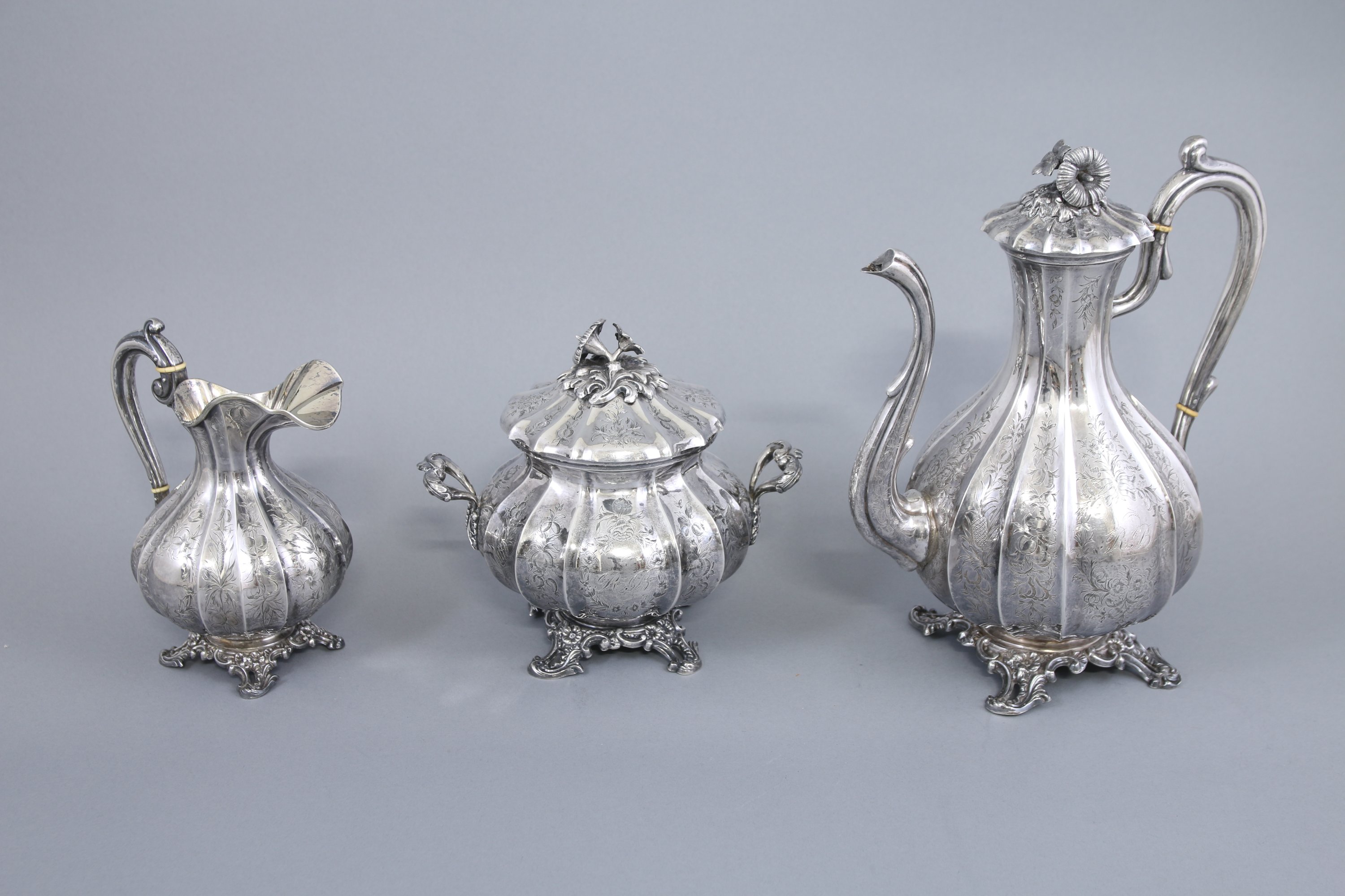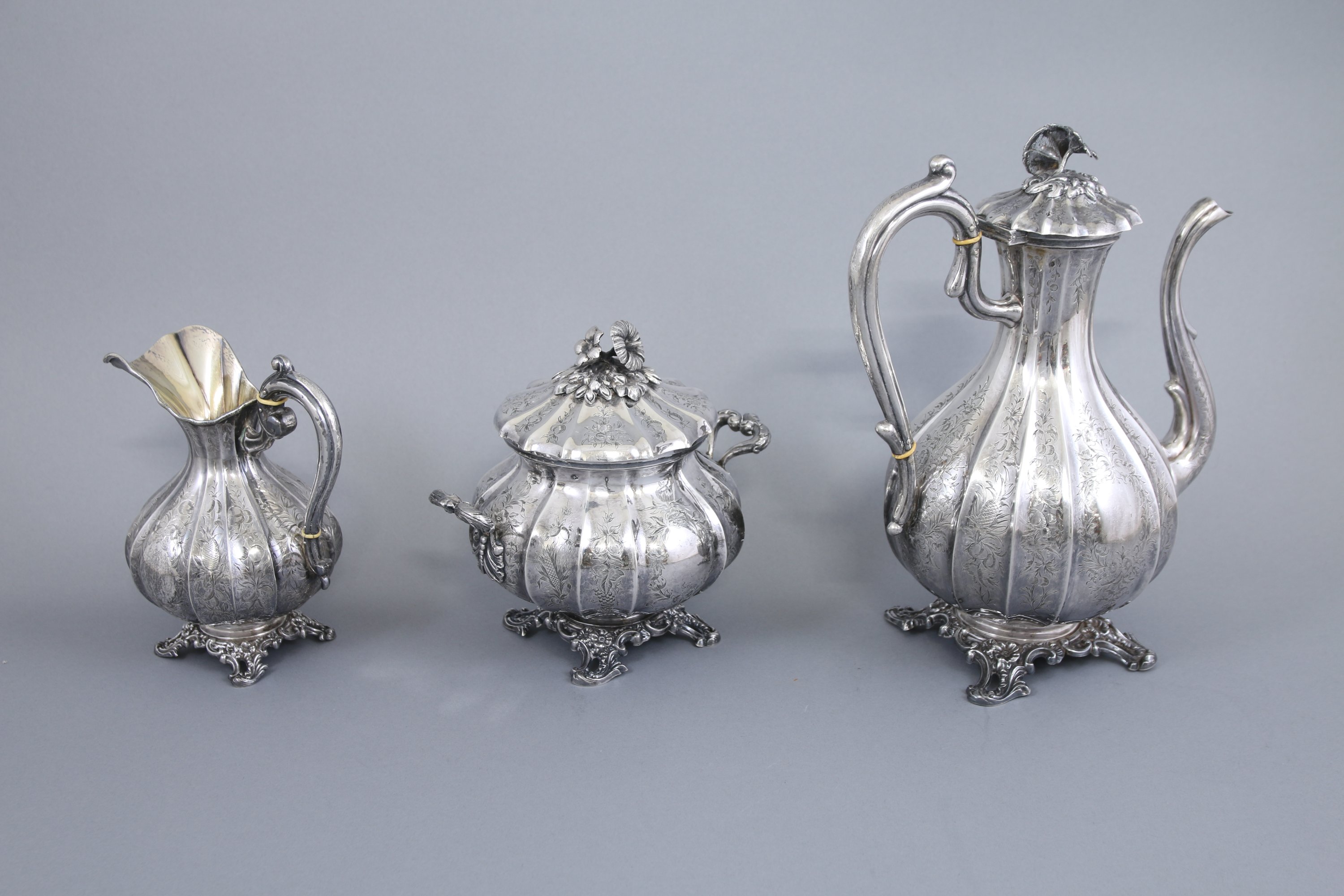 Comprenant une théière, un pot à lait et un pot à sucre. Le fretel à décor de fleurs épanouies sur une terrasse feuillagée. Les anses à deux bagues en os. Les couvercles et les panses godronnées sont décorés de motifs gravés de guirlandes feuillagées et monogrannées "RB".