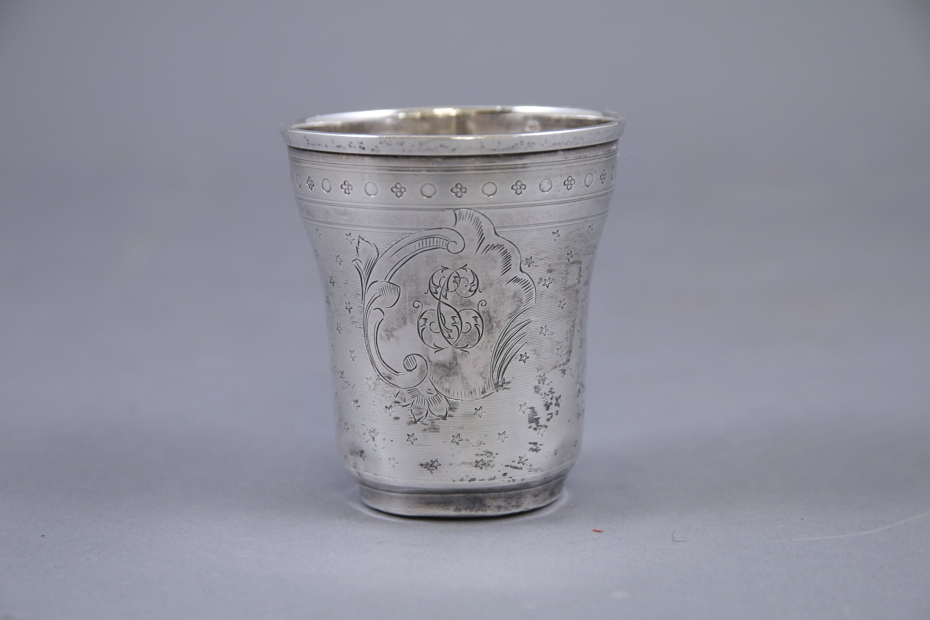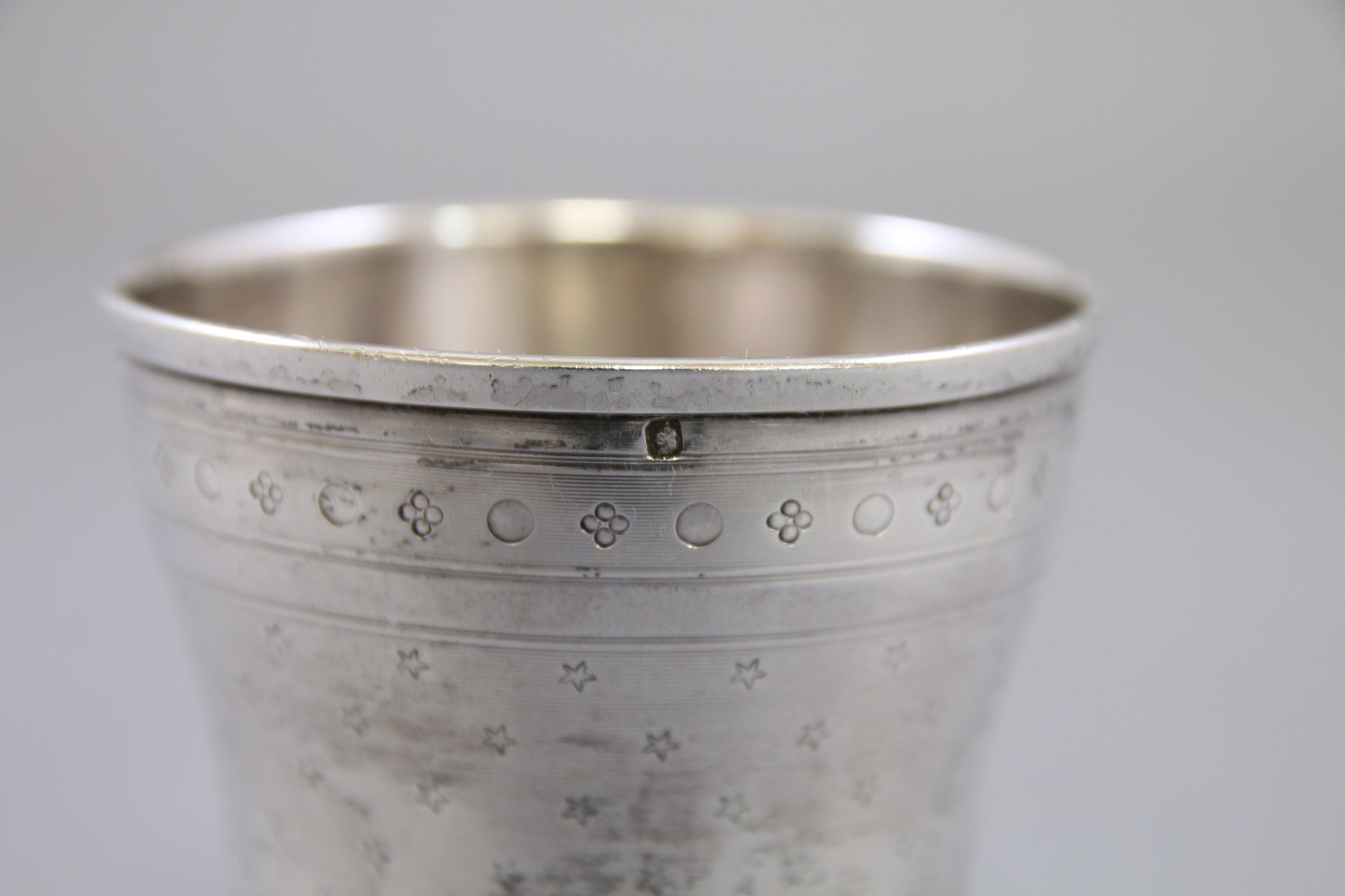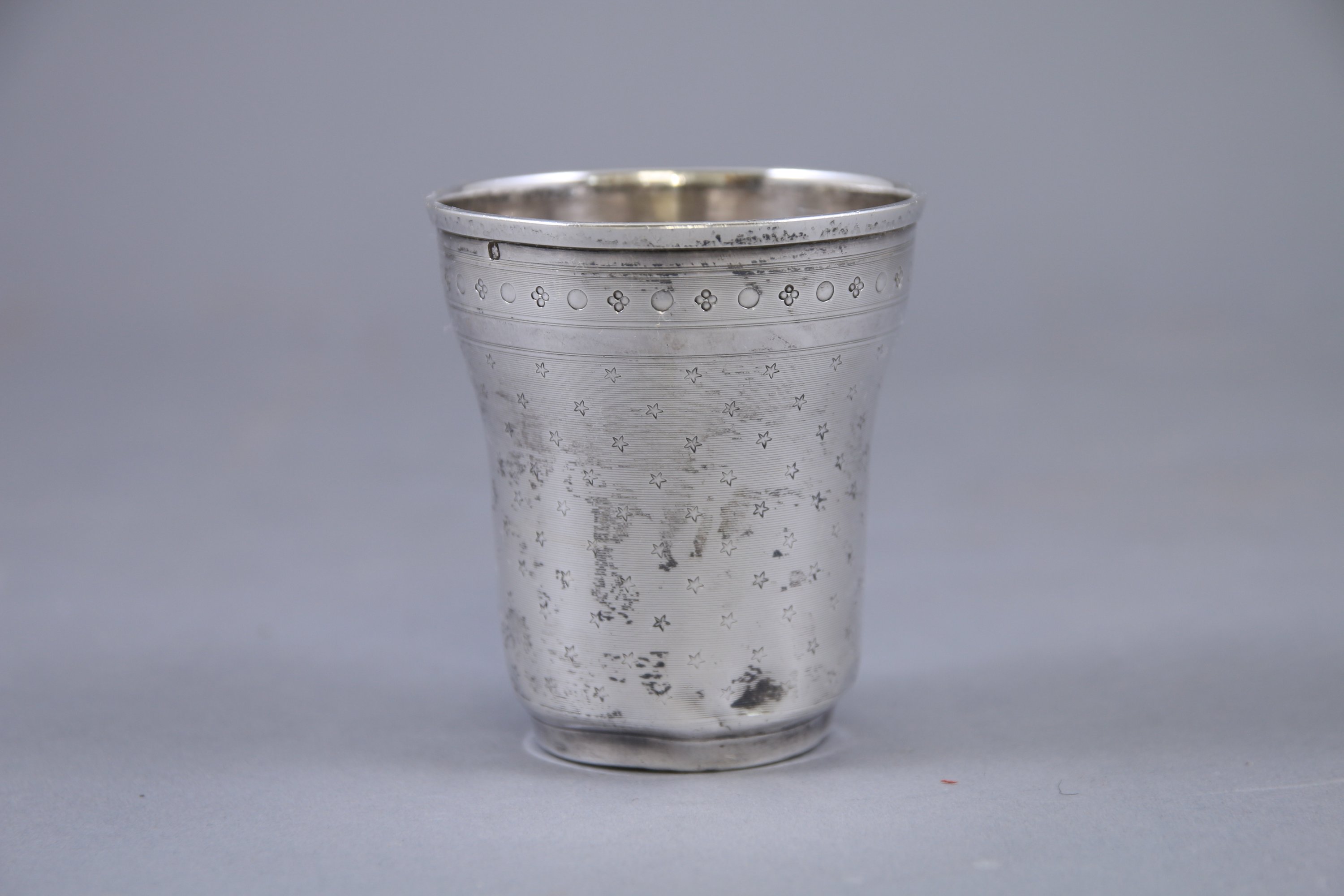Joint: Timbale en argent à fond guilloché à décor d’un semi d’étoiles entourant un cartouche monogrammé « SC ». Numérotée « 24 » au revers. Poinçon: Minerve 1er titre. Orfèvre: HH. Haut. 8 cm. Poids: 73 g. (petits enfoncements)
