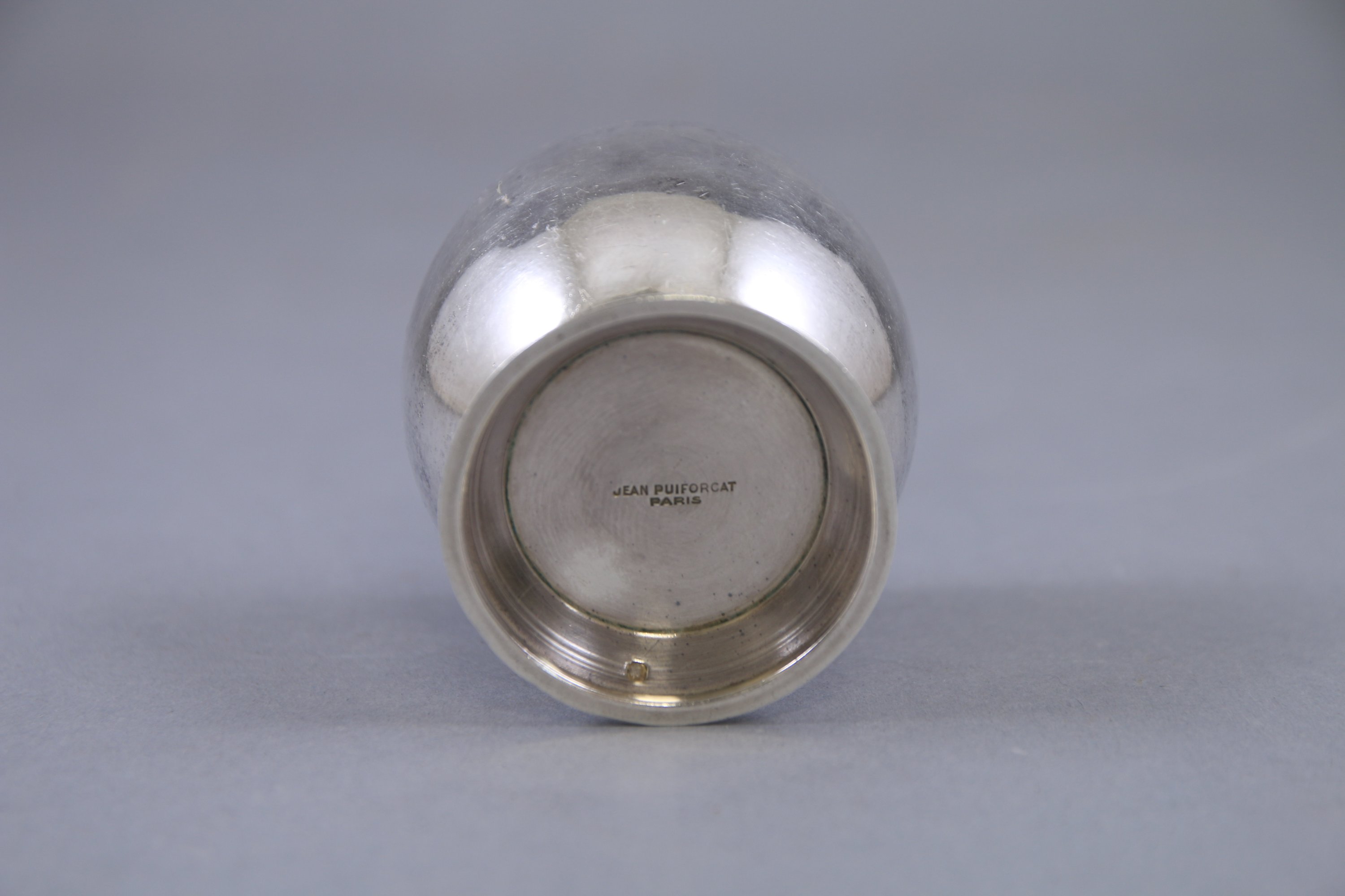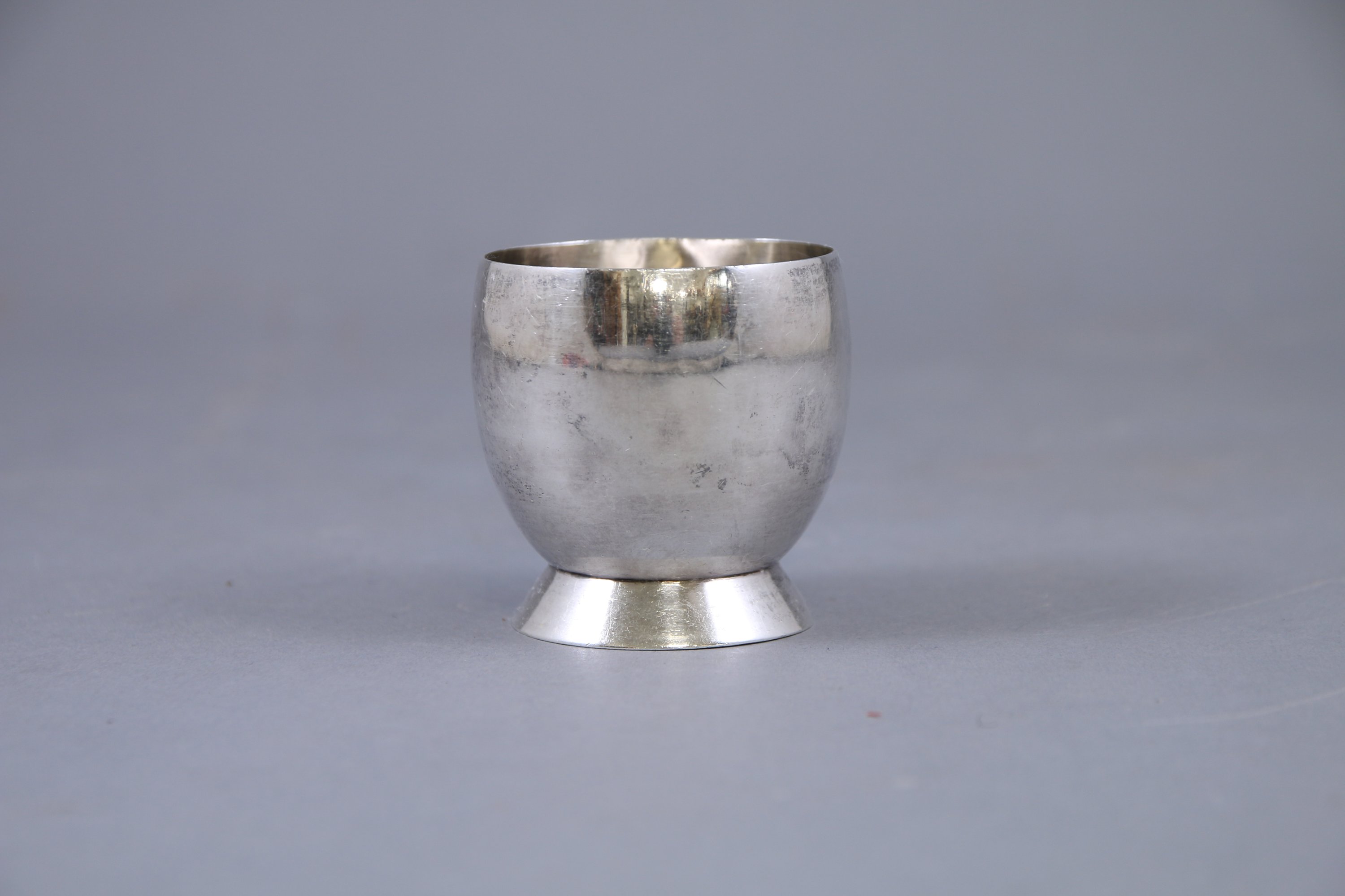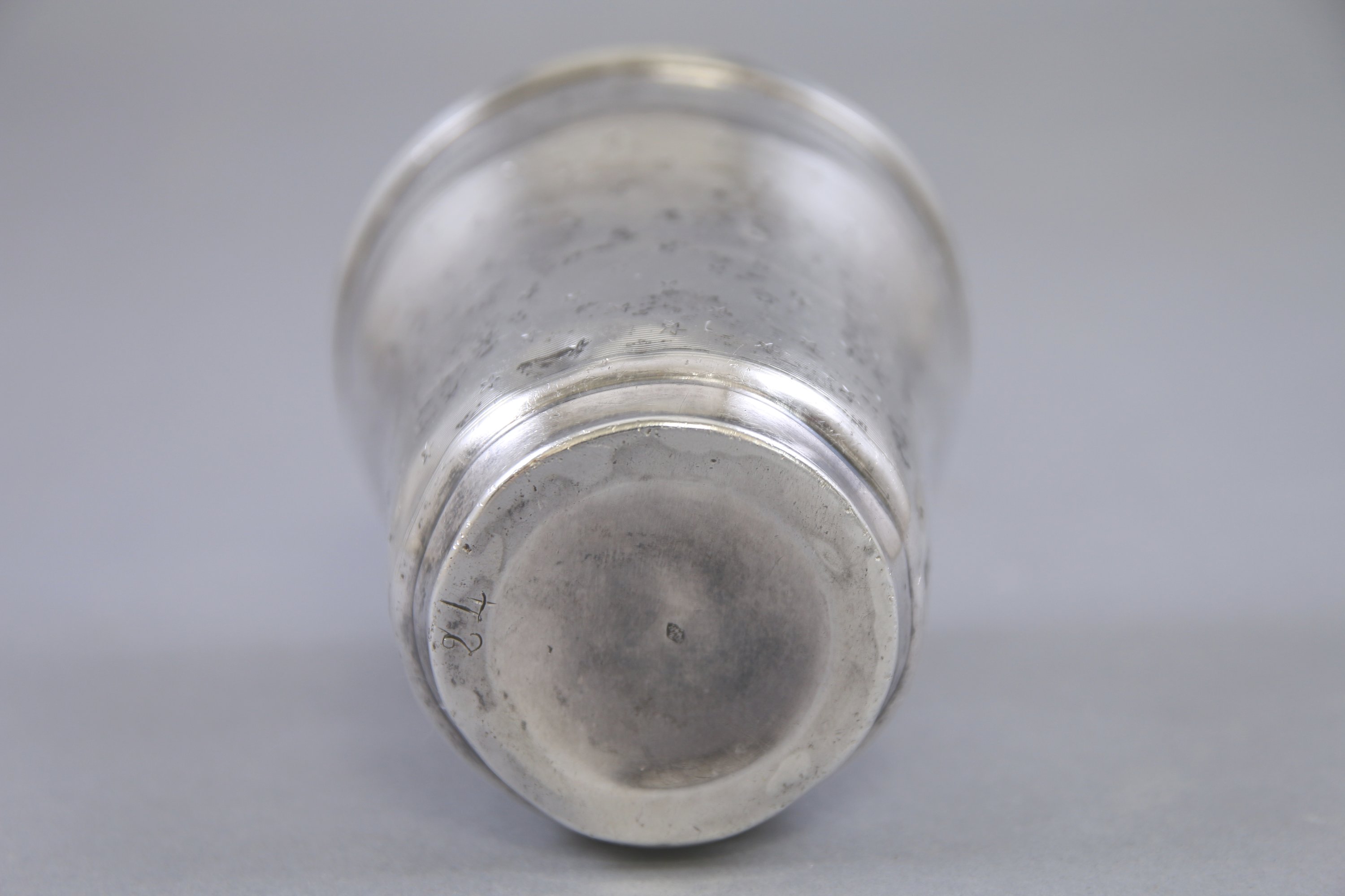 Joint: Timbale en argent à fond guilloché à décor d’un semi d’étoiles entourant un cartouche monogrammé « SC ». Numérotée « 24 » au revers. Poinçon: Minerve 1er titre. Orfèvre: HH. Haut. 8 cm. Poids: 73 g. (petits enfoncements)