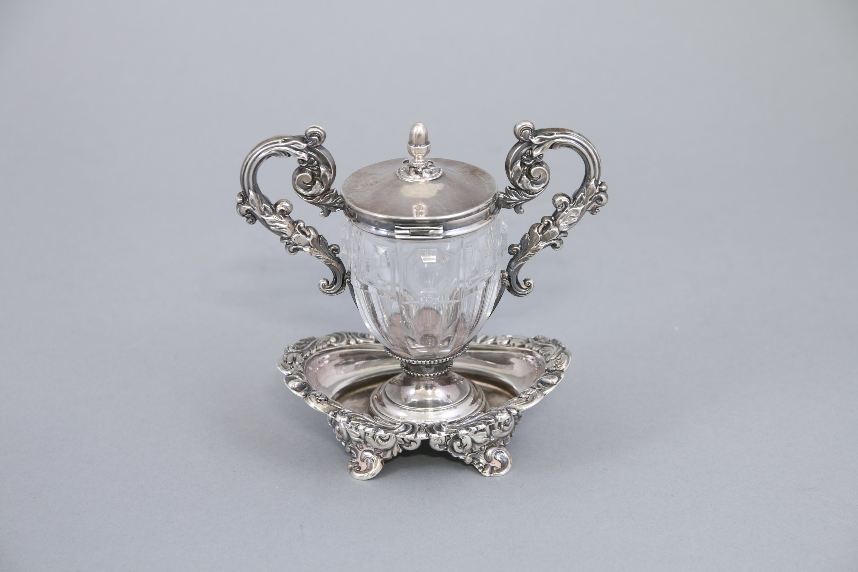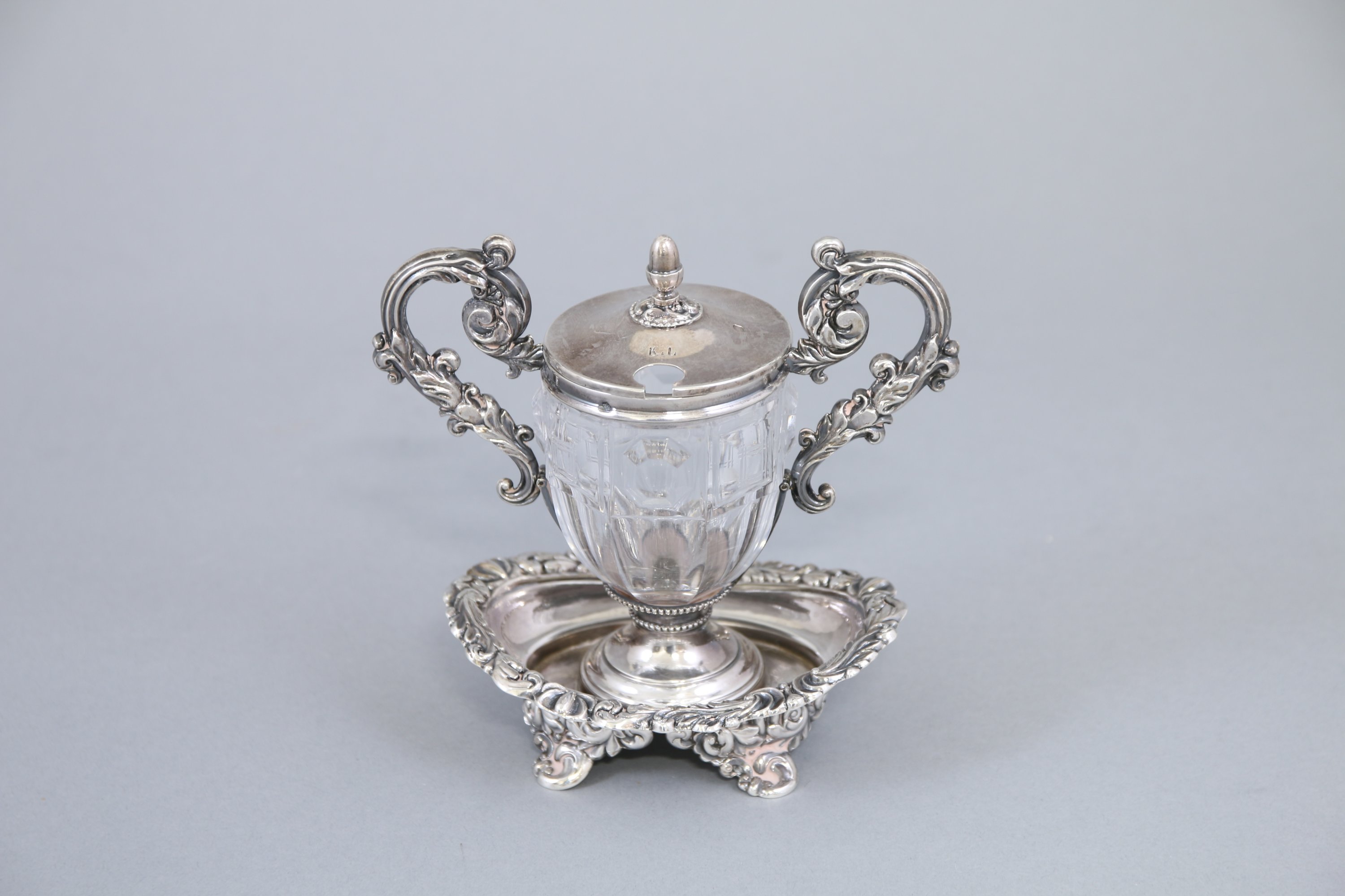 A décor rocaille d'enroulements, rinceaux et acanthes. Le fretel ovoïde supporté par un couvercle monogrammé "KL". Réceptacle en verre de forme balustre à décor de pans coupés et de motifs facettés.