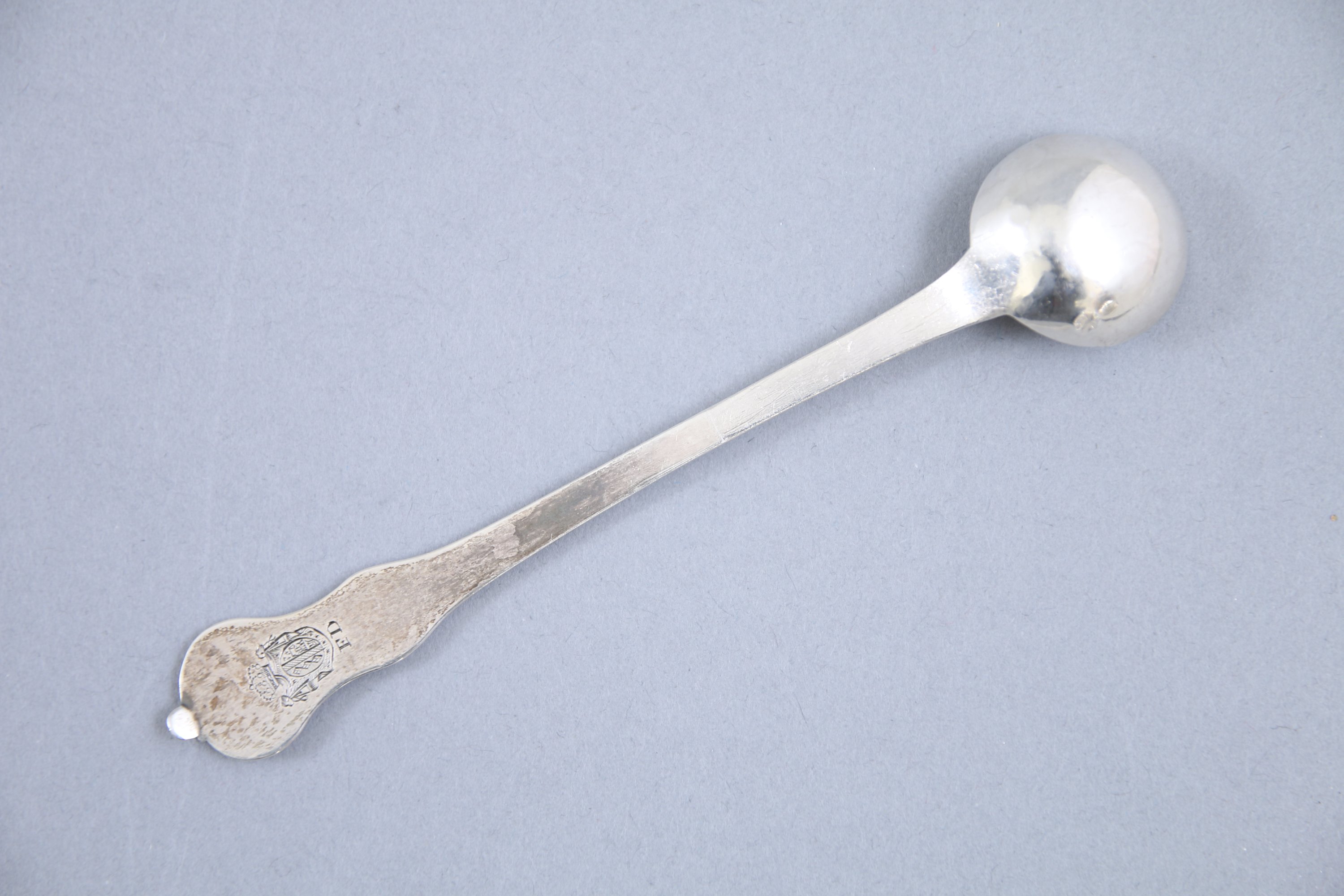 Joint: une cuillère à moutarde en argent modèle rocaille. Le revers monogrammé "FD" sous des armoiries arborant un dais et une couronne royale. Poinçon: Veilliard 1er titre et poinçon de moyenne garantie, Paris. Orfèvre non identifié: une faucille. Poids: 12,7 g.