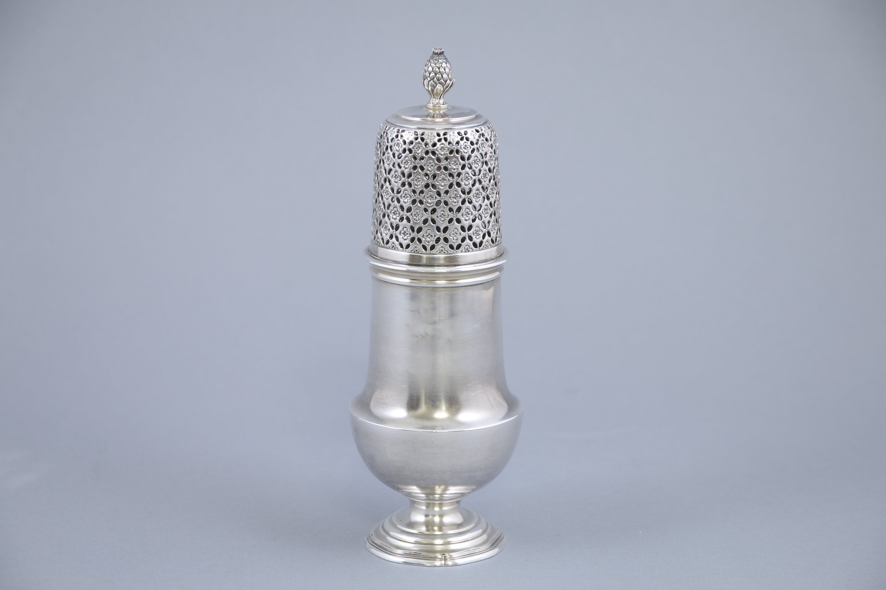 Le bouchon percé à décor d'un semi de fleurs est coiffé d'une graine. Le pied circulaire mouluré.