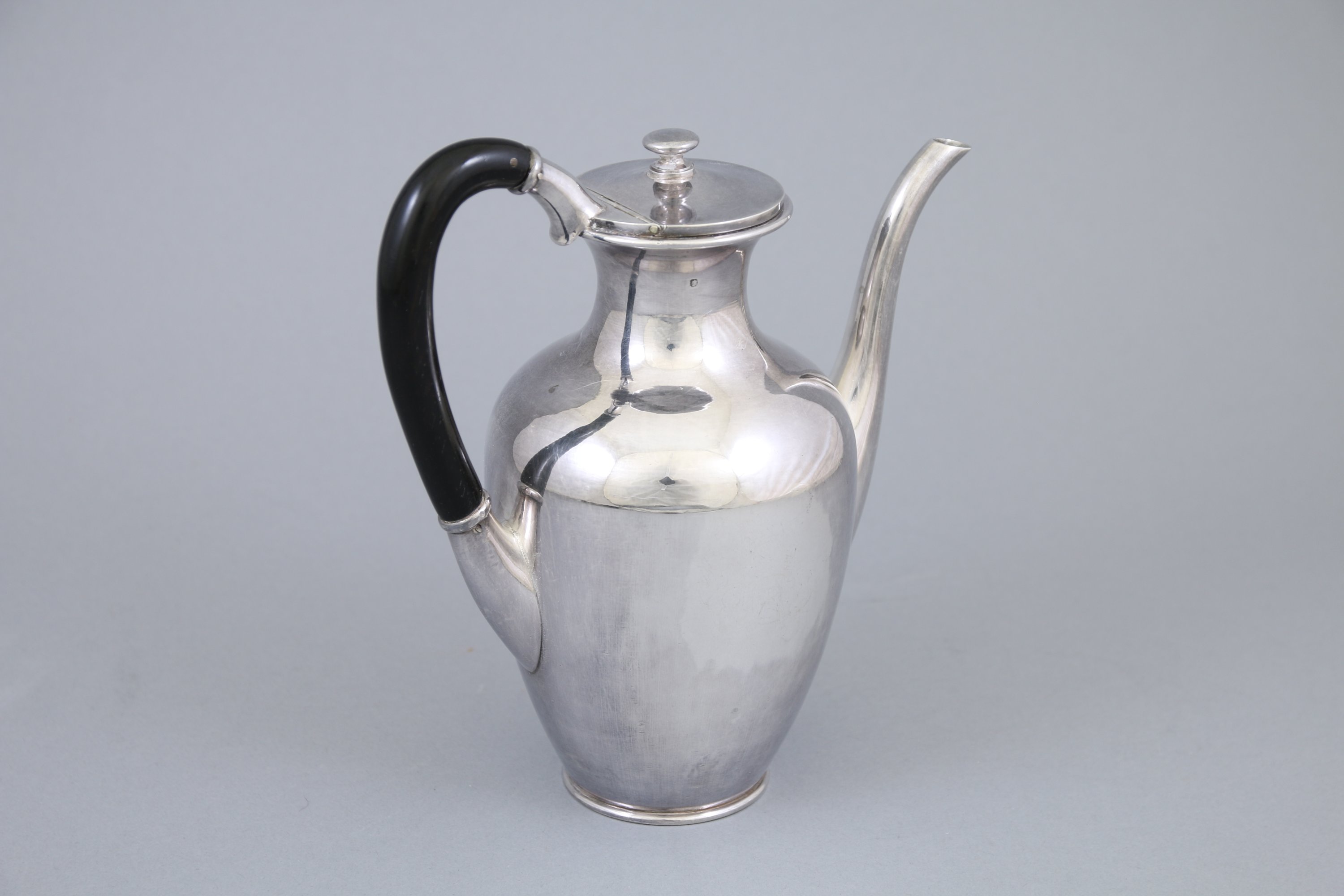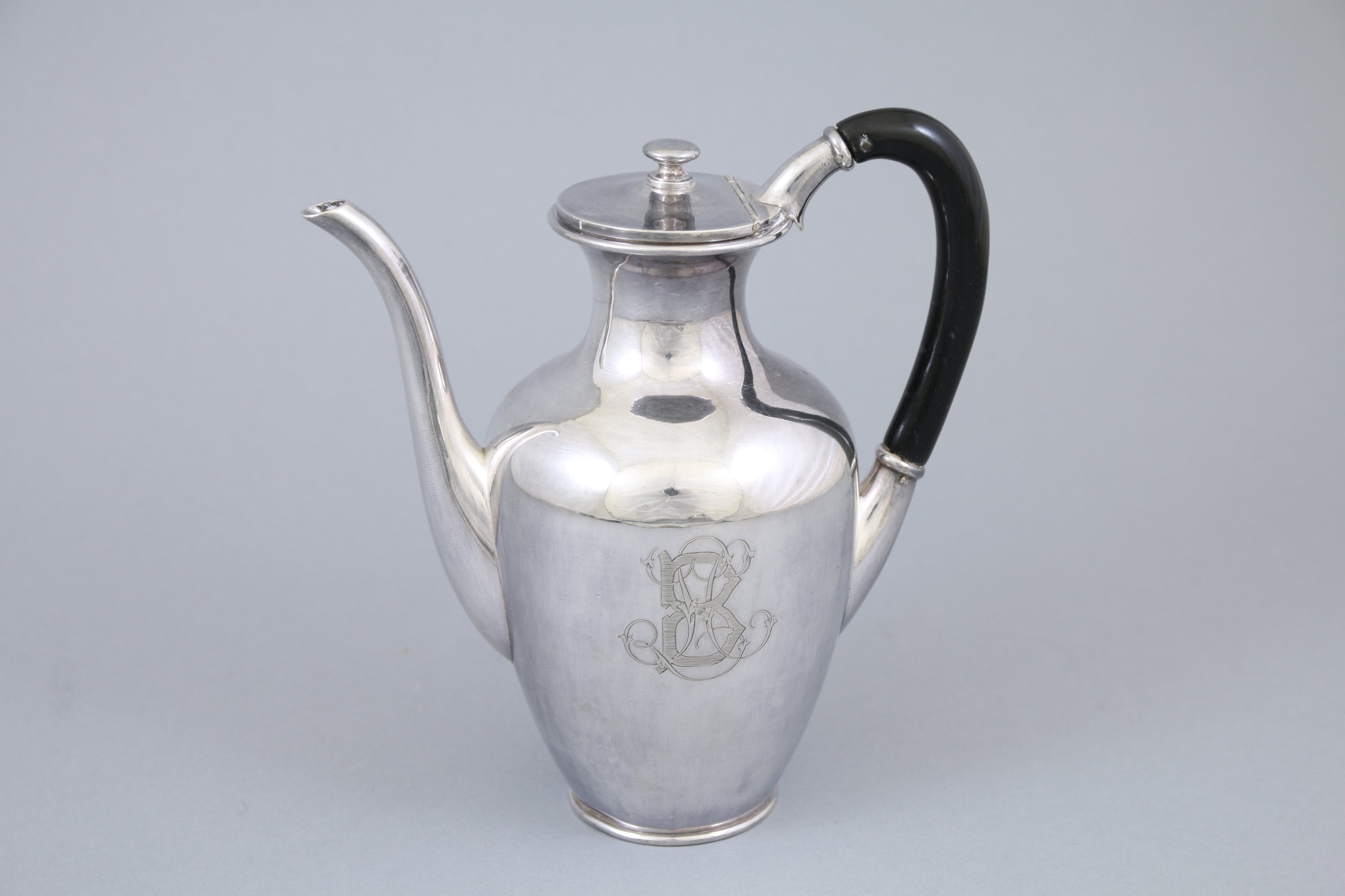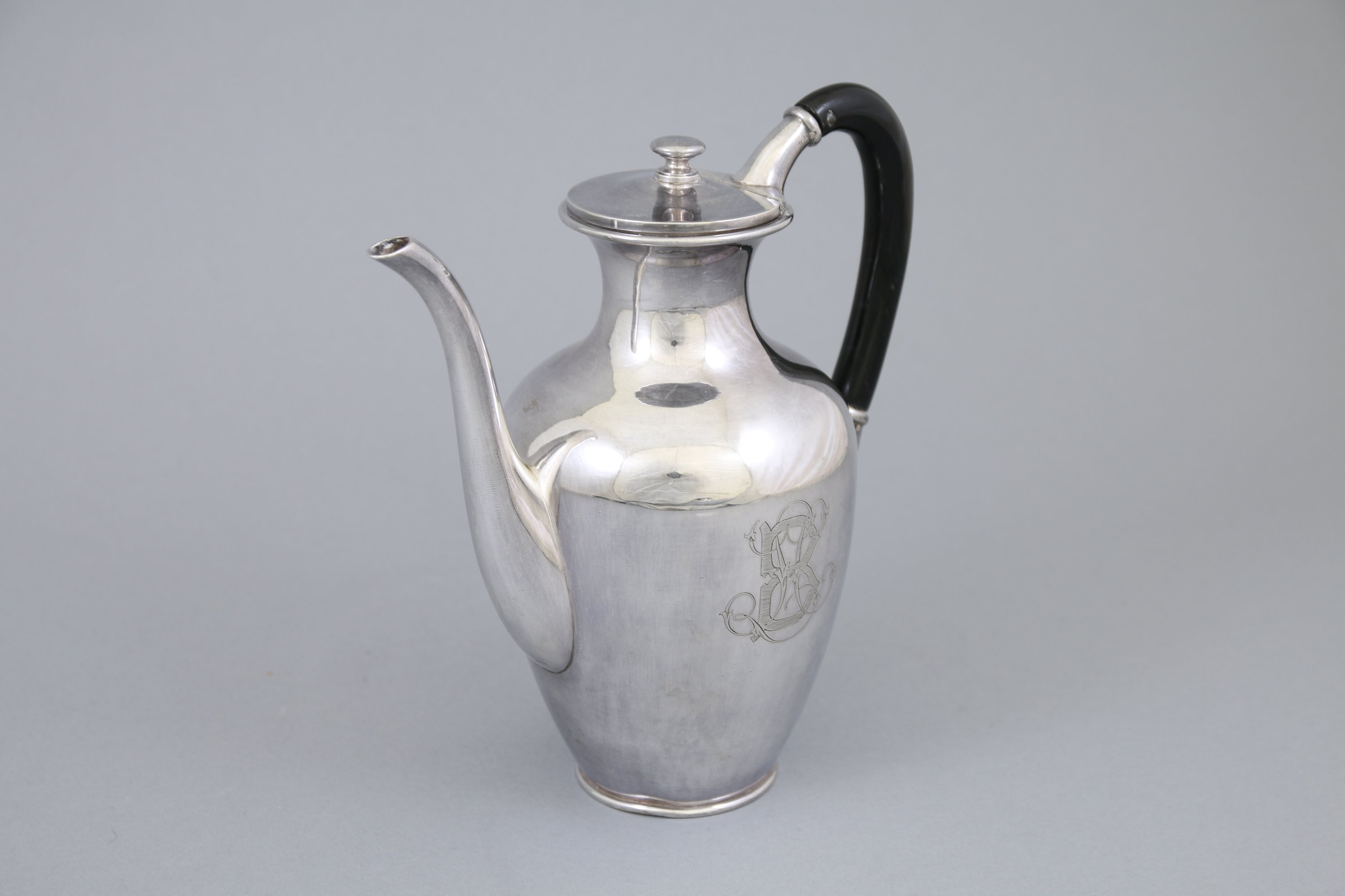 Le couvercle à charnière est sommé d'un fretel en forme de toupie. La panse est monogrammée "BH". Une anse en bois noirci.