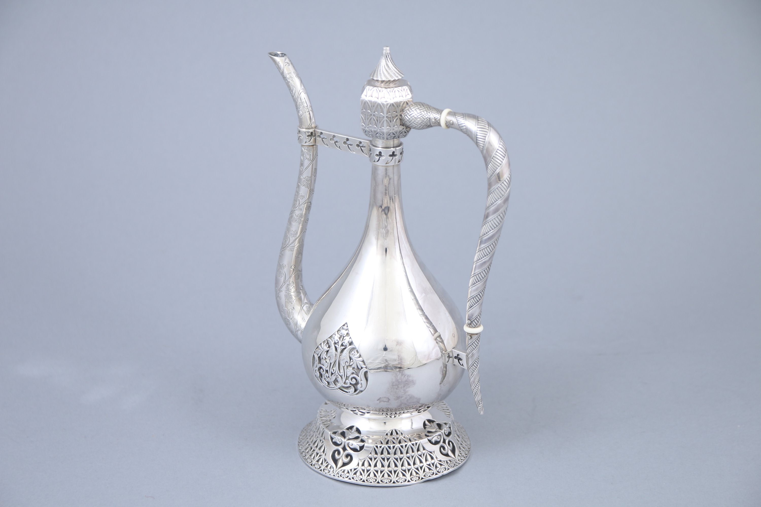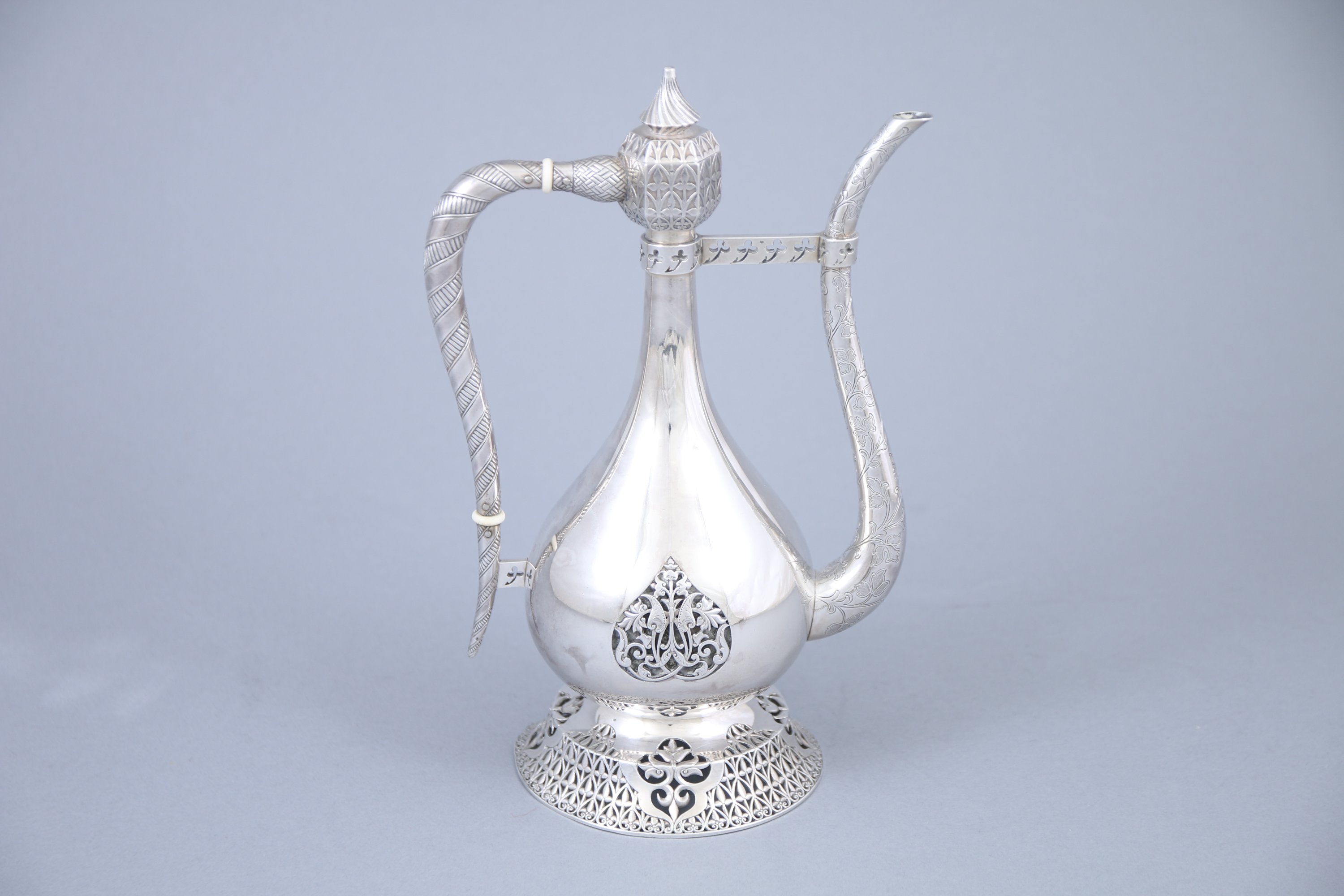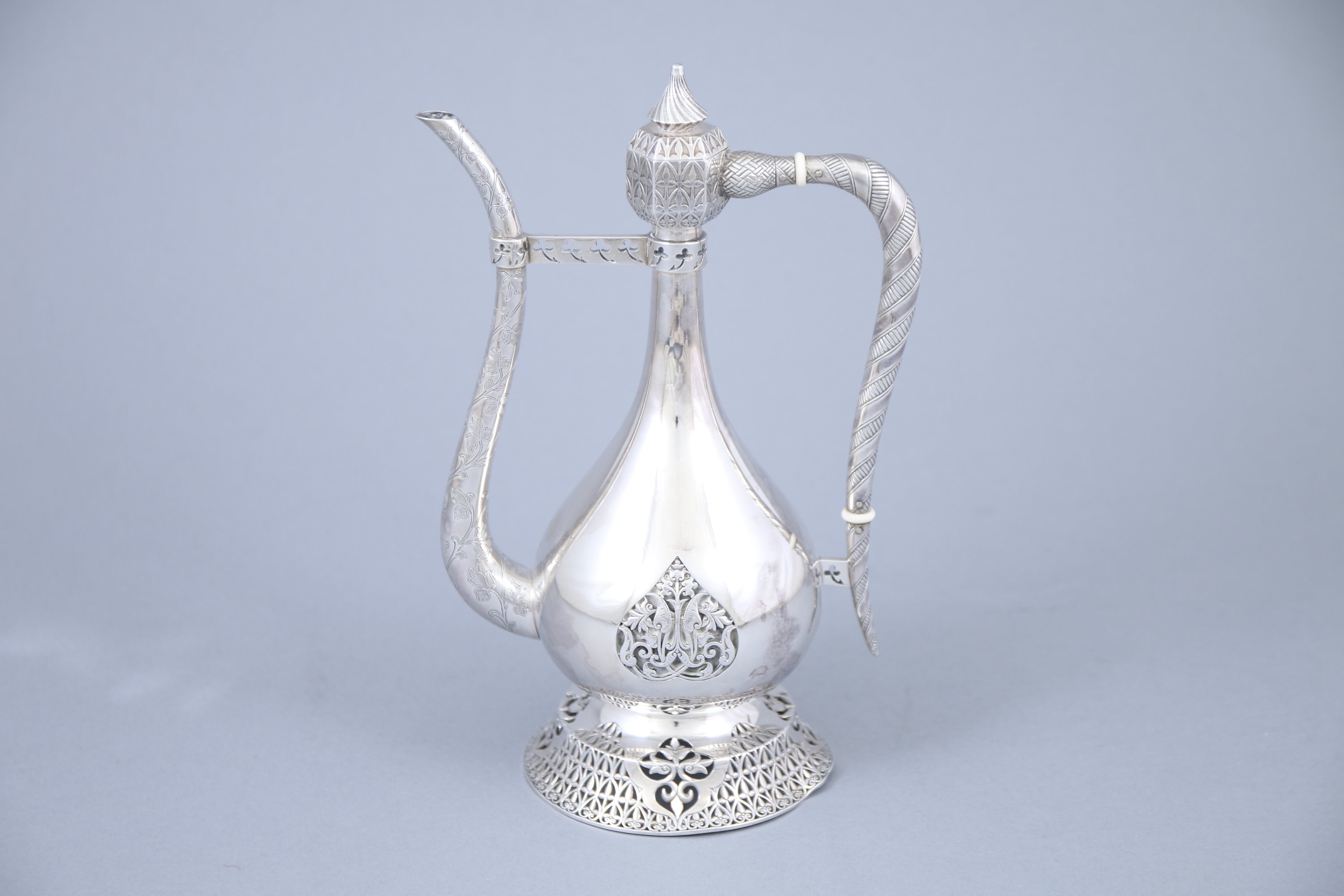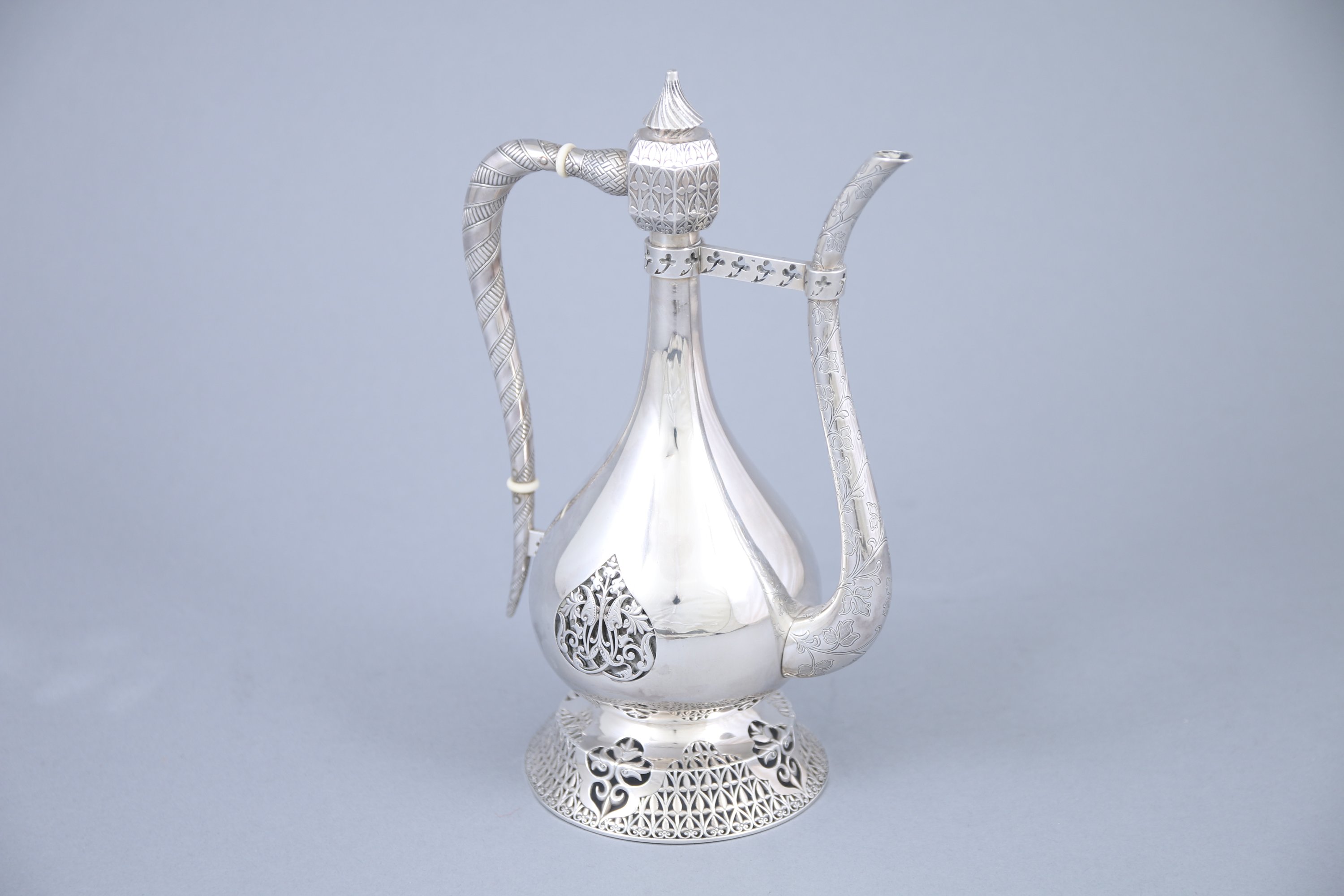 Le bec verseur à décor de frises feuillagées réunies par une tige percée de trèfles soutenue sur le col. Bouchon en pagode à motifs torsadés se prolongeant sur l'anse. Spectaculaire motifs d'arum en ferrure sur la panse et de lys ajourés sur le piédouche.