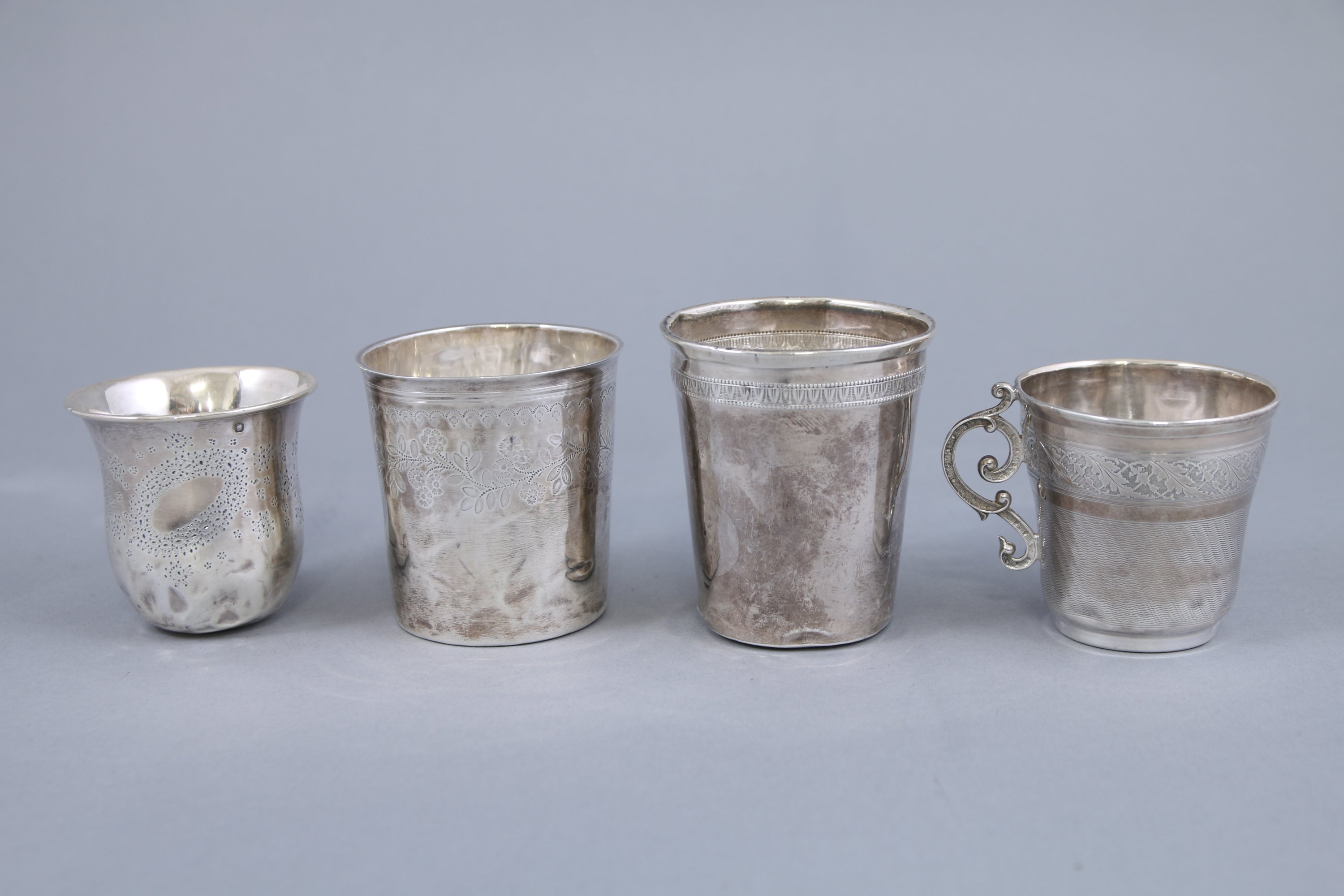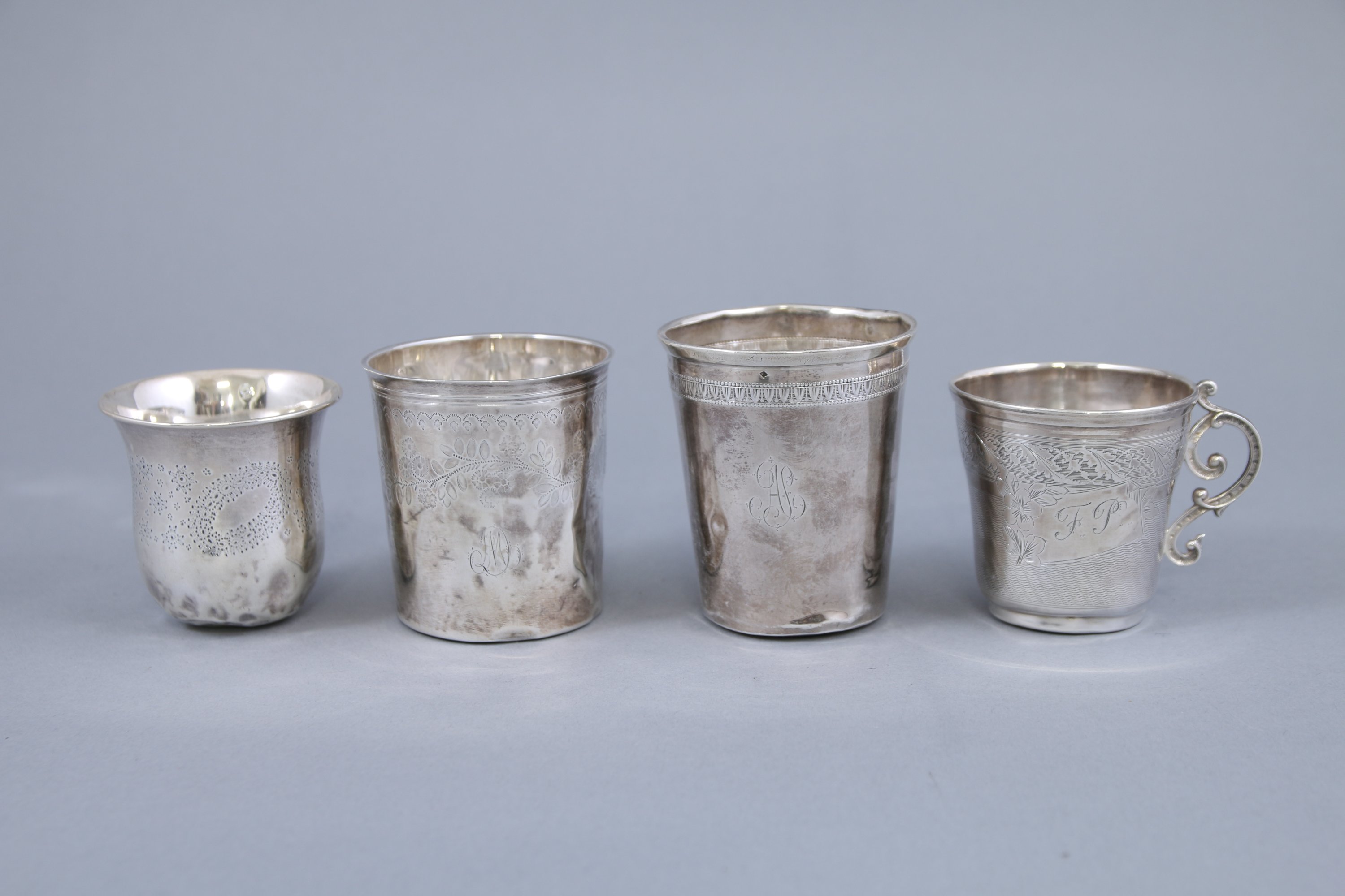 - La première timbale à décor d'une frise de feuilles de lotus et monogrammée "AP". Haut. 7,5 cm.