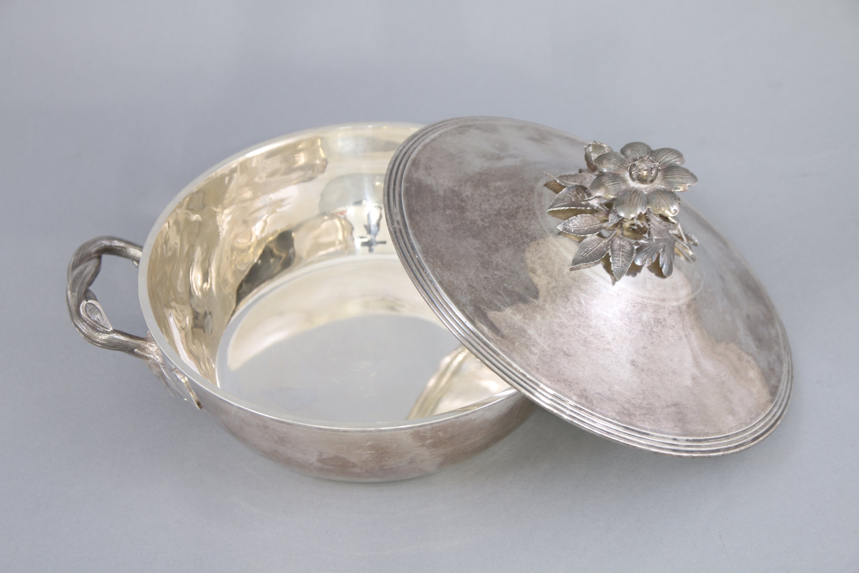 A couvercle surmonté d'un fretel en forme d'une fleur épanouie sur une terrasse de branchage. Deux anses aux branches torsadées terminées par des feuilles. Monogrammé "DL" sur le couvercle et la panse.
