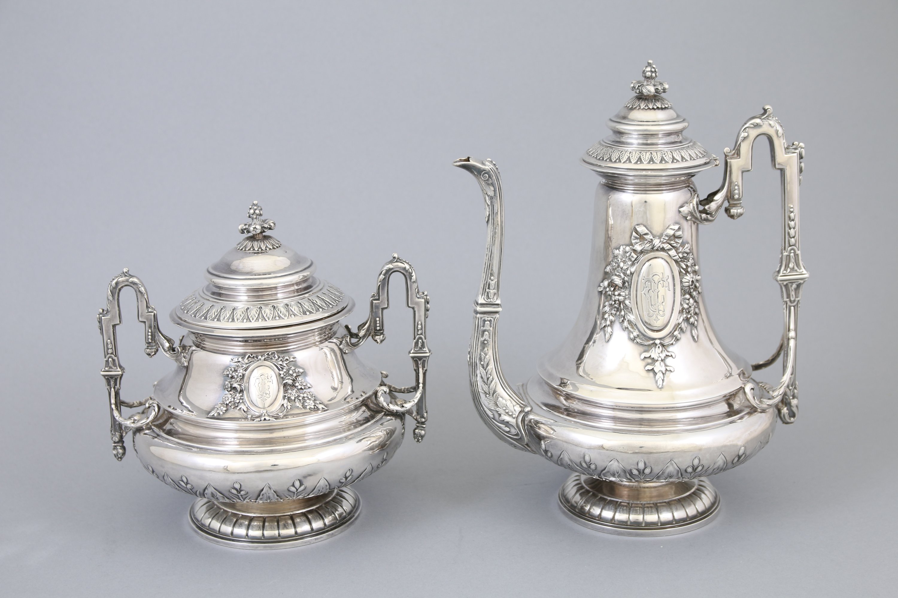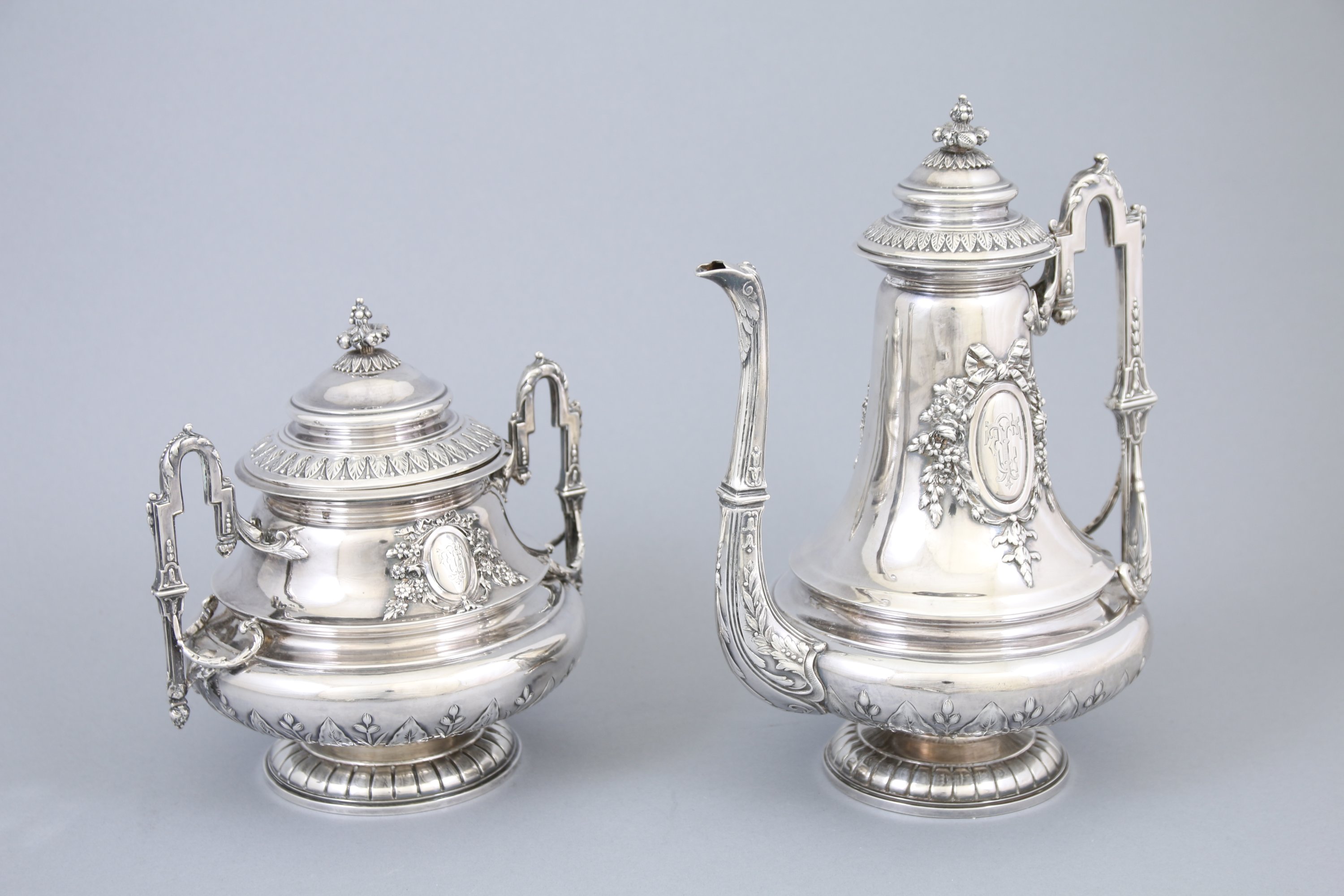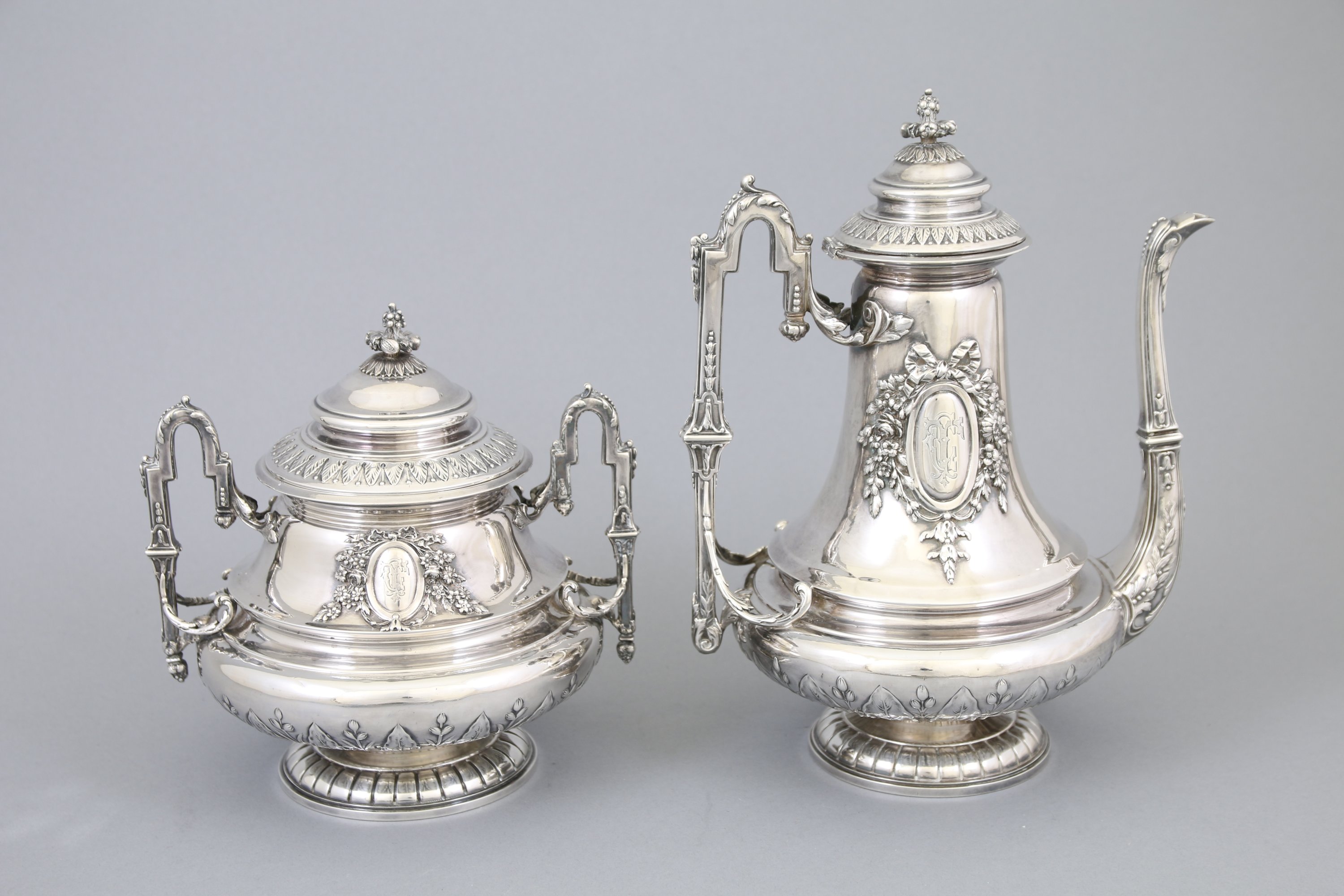 Fretel à grains de pavots, couvercles à frises de feuilles de lotus, bec verseur à feuilles de laurier, anse ouvragée à pointe d'asperge. Le corps est orné du monogramme "CT" dans un entourage au noeud fleuri. Ils reposent sur des pieds circulaires godronnées.