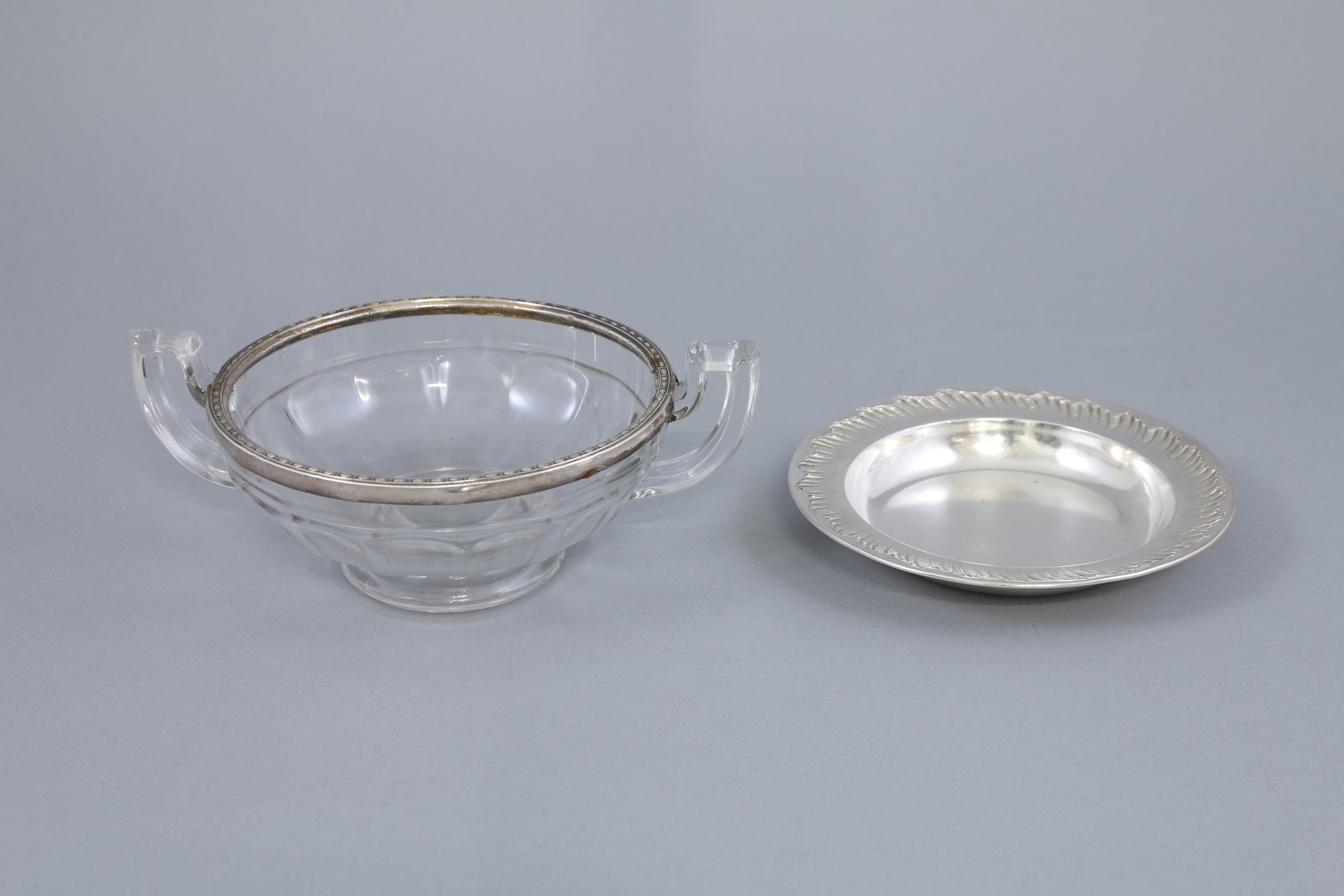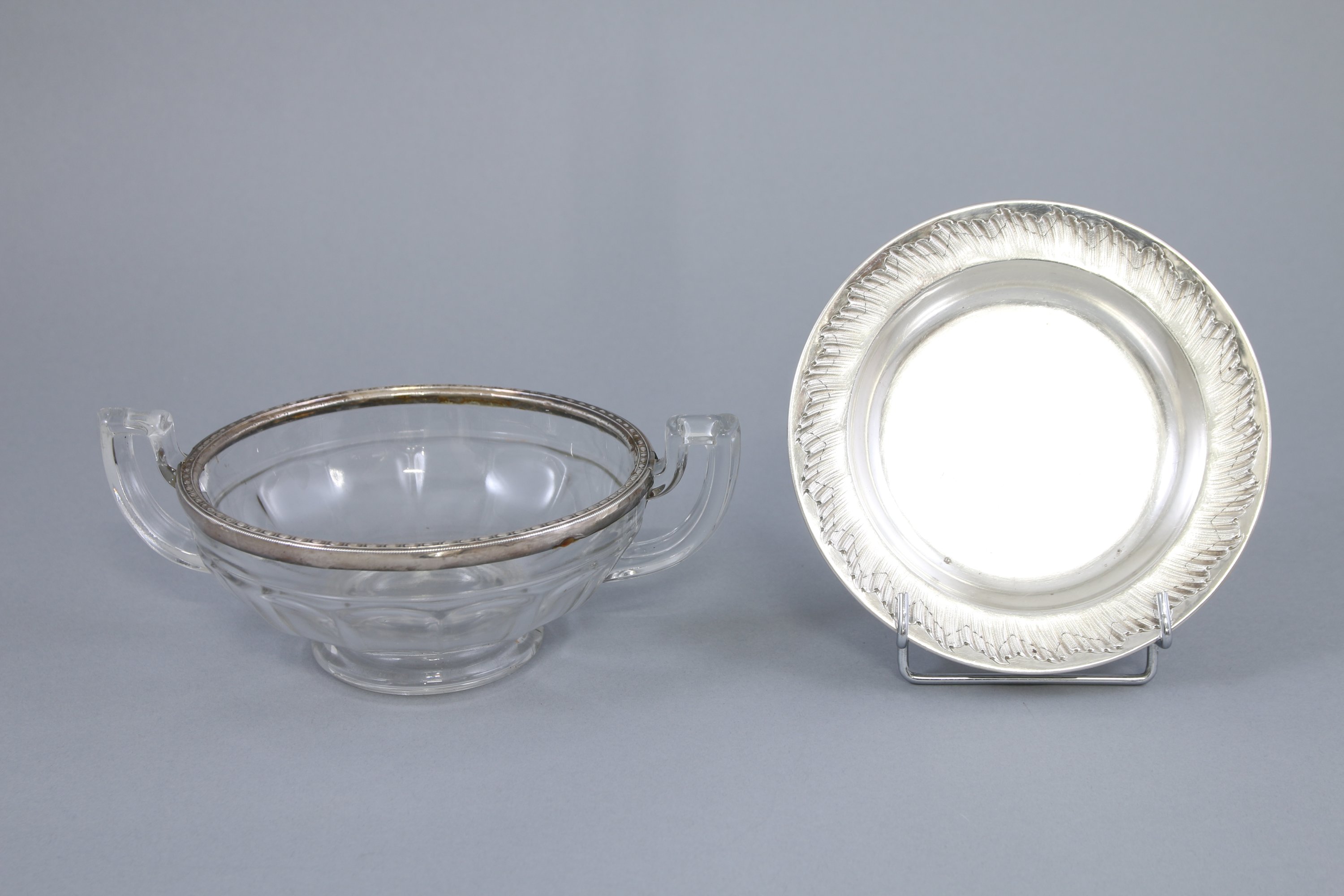 Coupe: Haut. 9,5 Long. 23,5 cm. Poids brut: 681 g. Soucoupe: Diam. 17 cm. Poids: 173 g. (petit accident au cerclage en argent)
