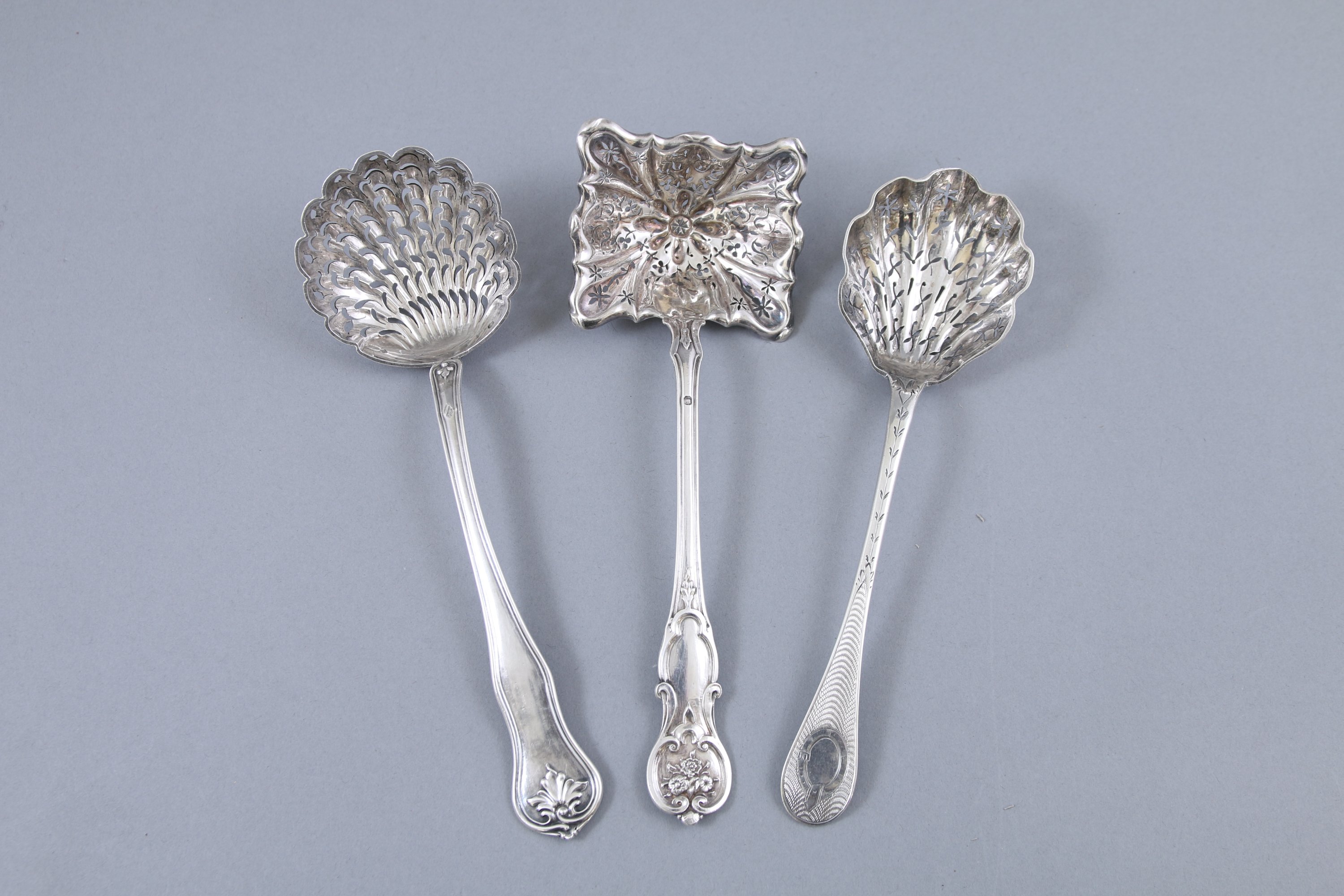 - Trois cuillers à saupoudrer de trois modèles en argent, aux cuillerons à décor en repercé. Poinçons: deux Minerve 1er titre et une Minerve 2ème titre. Poids: 157 g.
