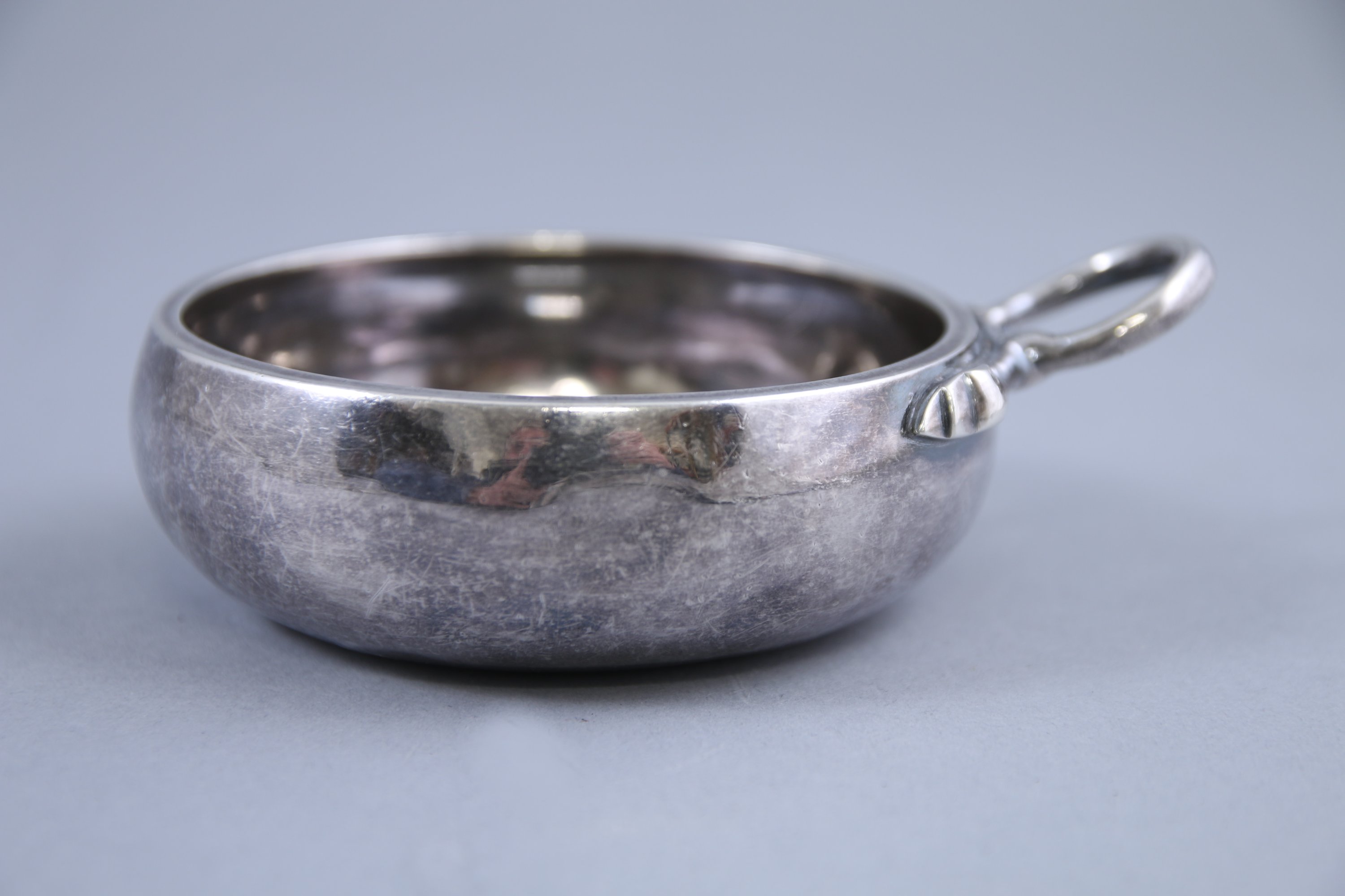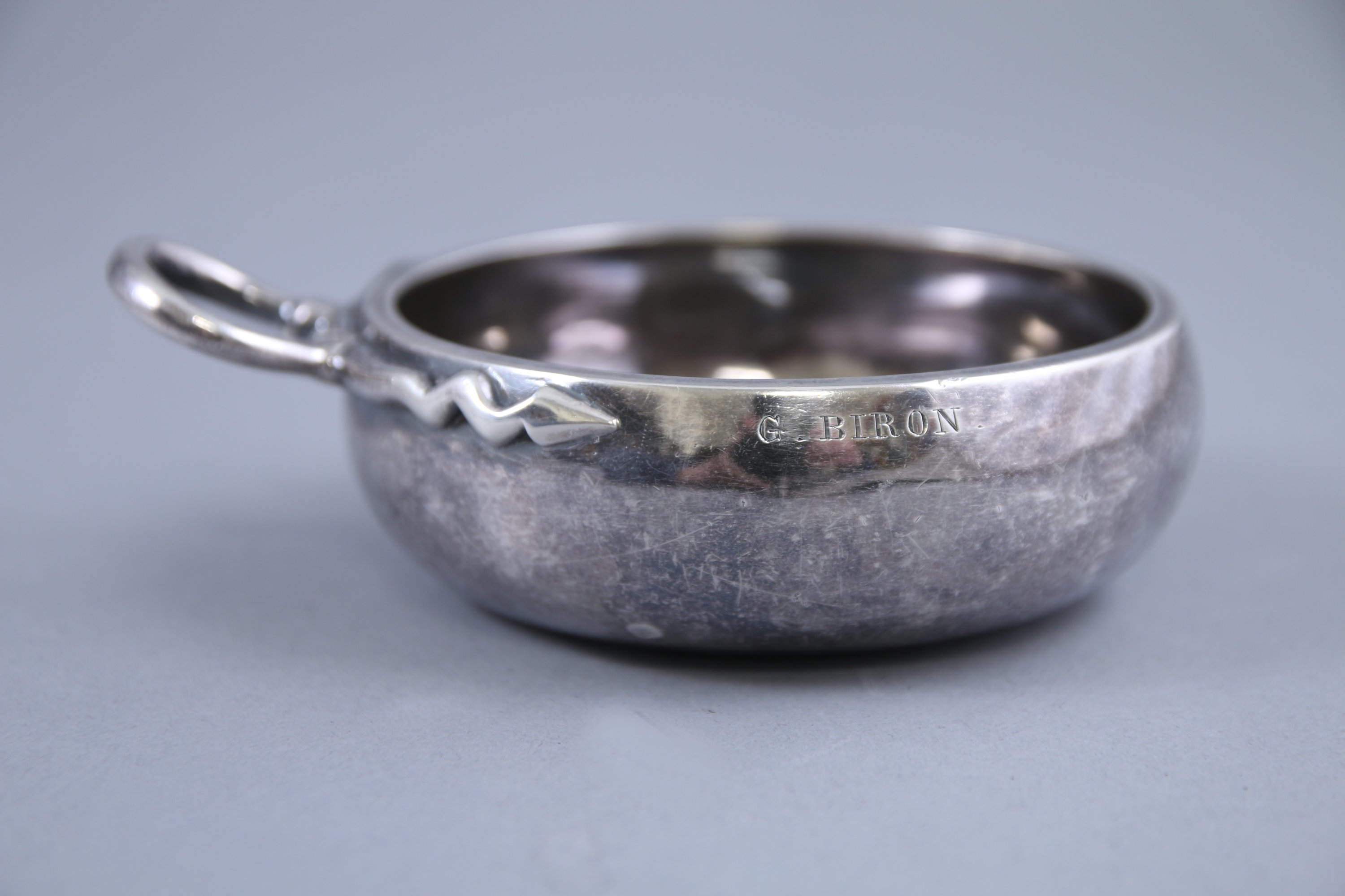 - Un tastevin en argent modèle uniplat à une anse à décor d'une flèche. Gravé "G.Biron" sur la panse. Poinçon: Minerve 1er titre. Diam. 9 cm. Poids: 122 g.