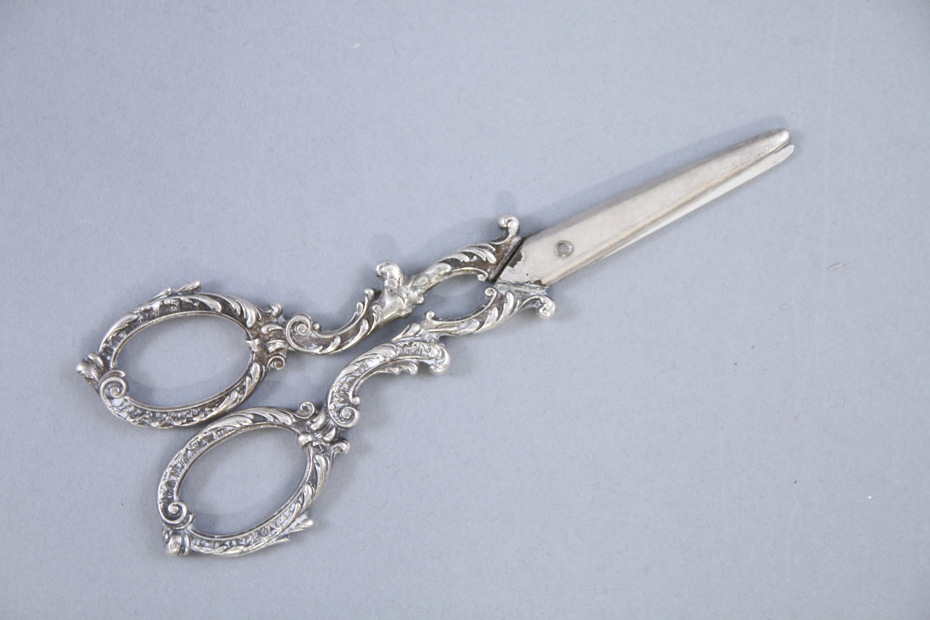 Joint: une paire de ciseaux à raisin à monture en argent et lame en métal, à décor de rinceaux et feuilles d'acanthe. Long. 15 cm. Poids brut: 54 g.