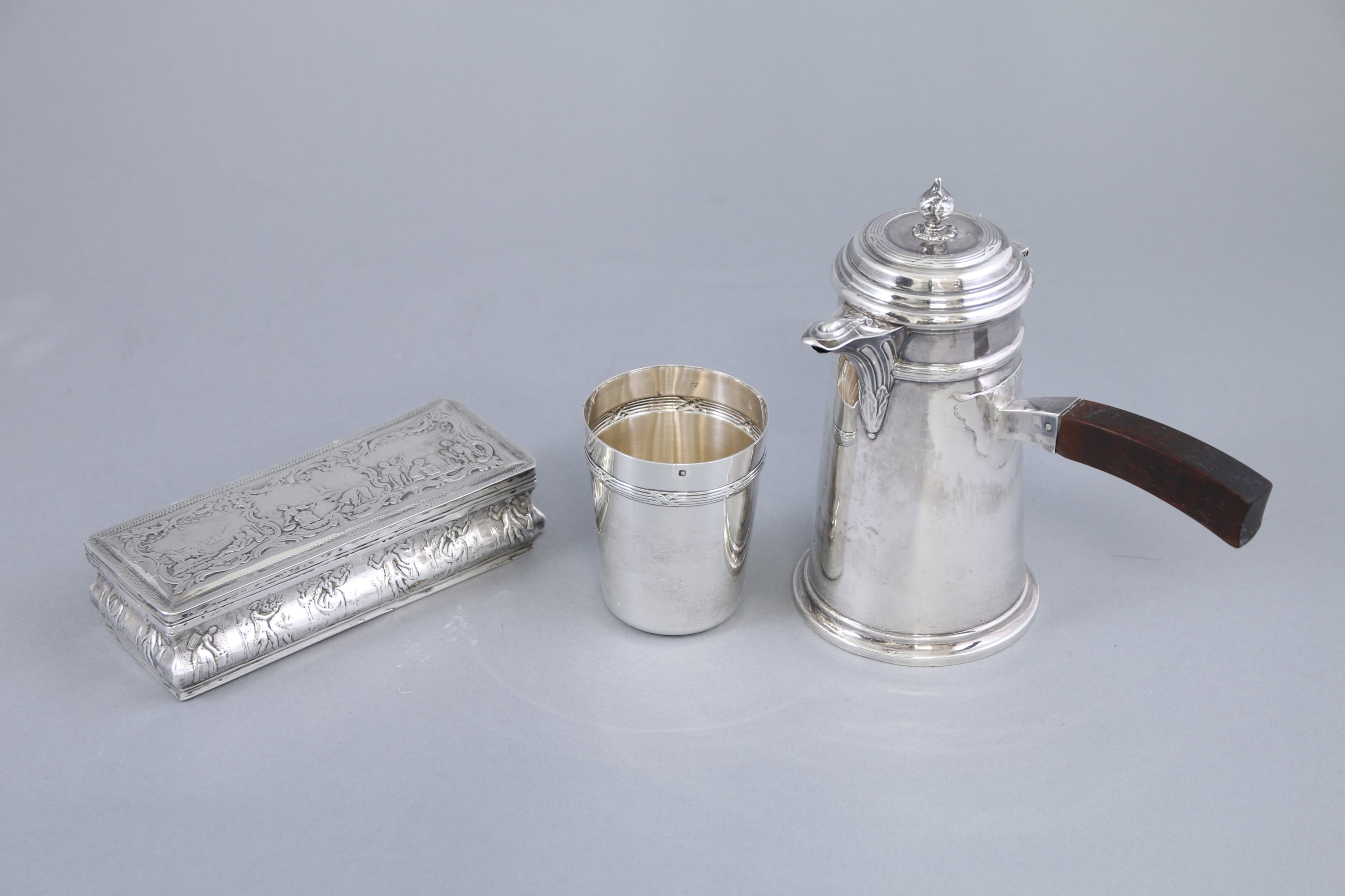Joint: Boite à cigares en argent à motifs de scènes de vendanges, de pêches et de fêtes bachiques. Haut. 3,8 Larg. 15 Prof. 6,3 cm. Poids: 178 g.
