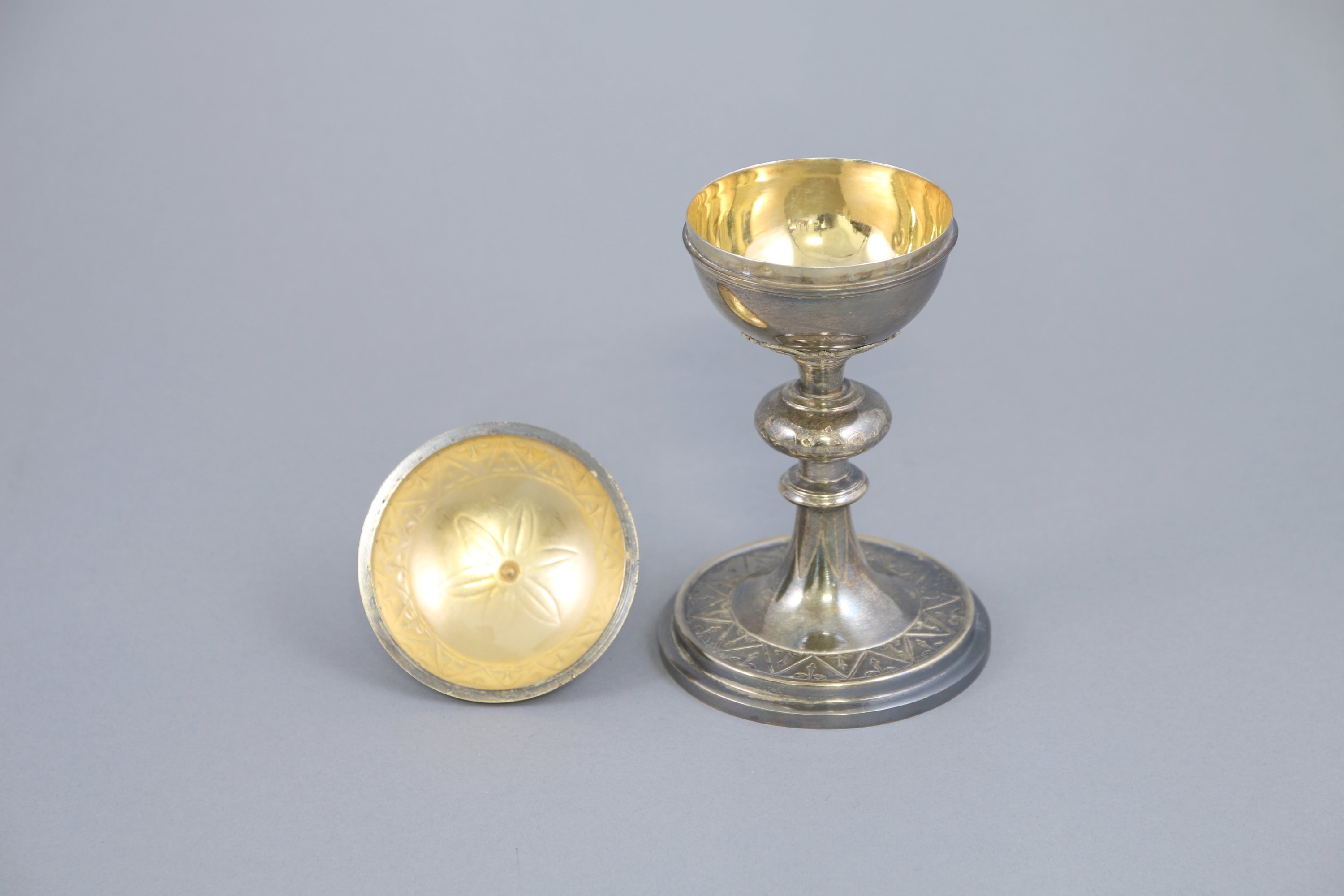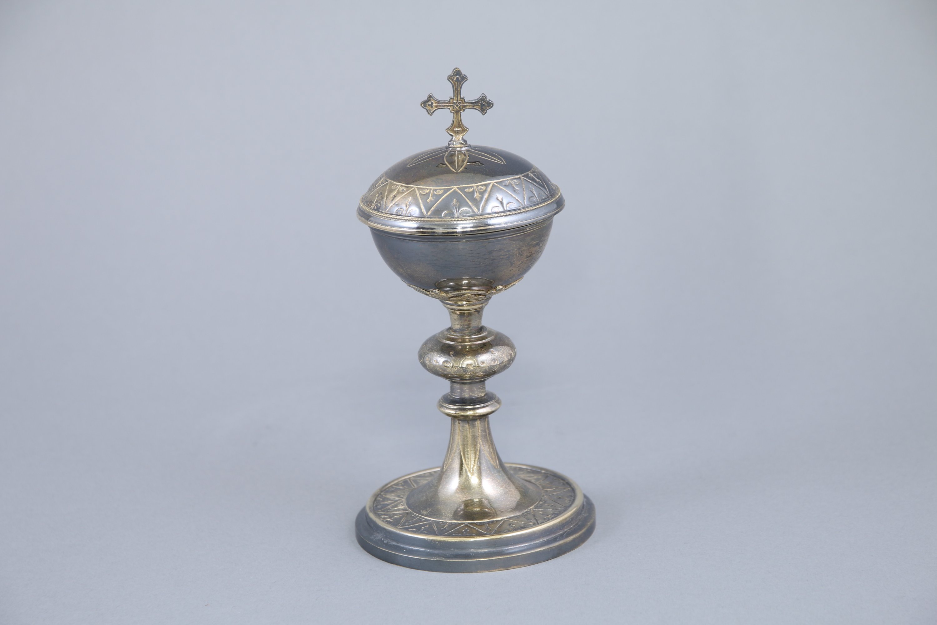 Le couvercle sommé d'une croix latine sur fond gravé d'une fleur à six pétales et frise losangé de fleurs de lys. Le fût à deux ombilic surmonte un pied circulaire.