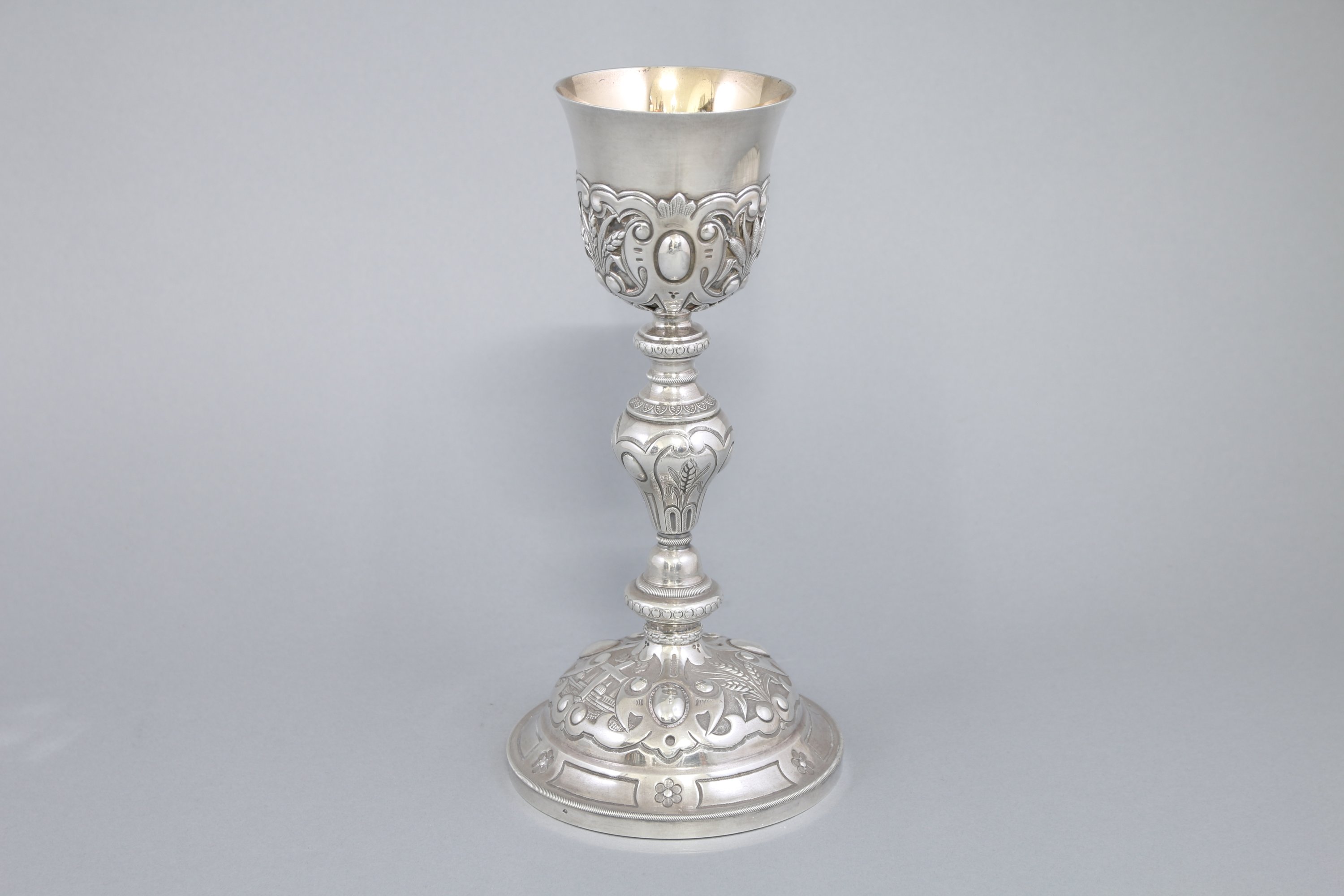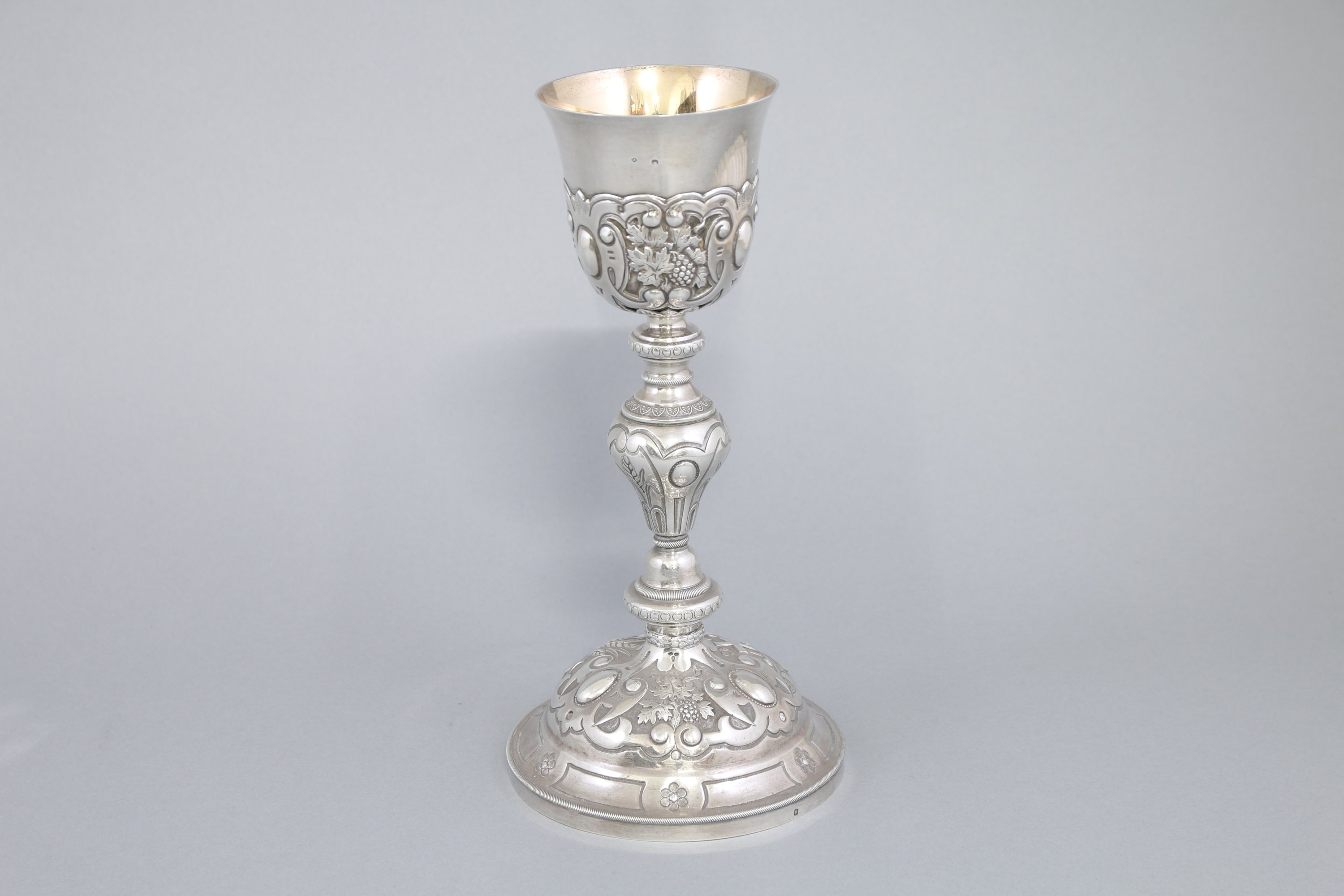 La coupe à lèvre évasée et décor de roseaux, pampres de vigne et épis de blé. Le fût à ombilic et bague ornée d'une frise de perles. Le pied circulaire à décor repoussé figurant notamment la Jérusalem.
