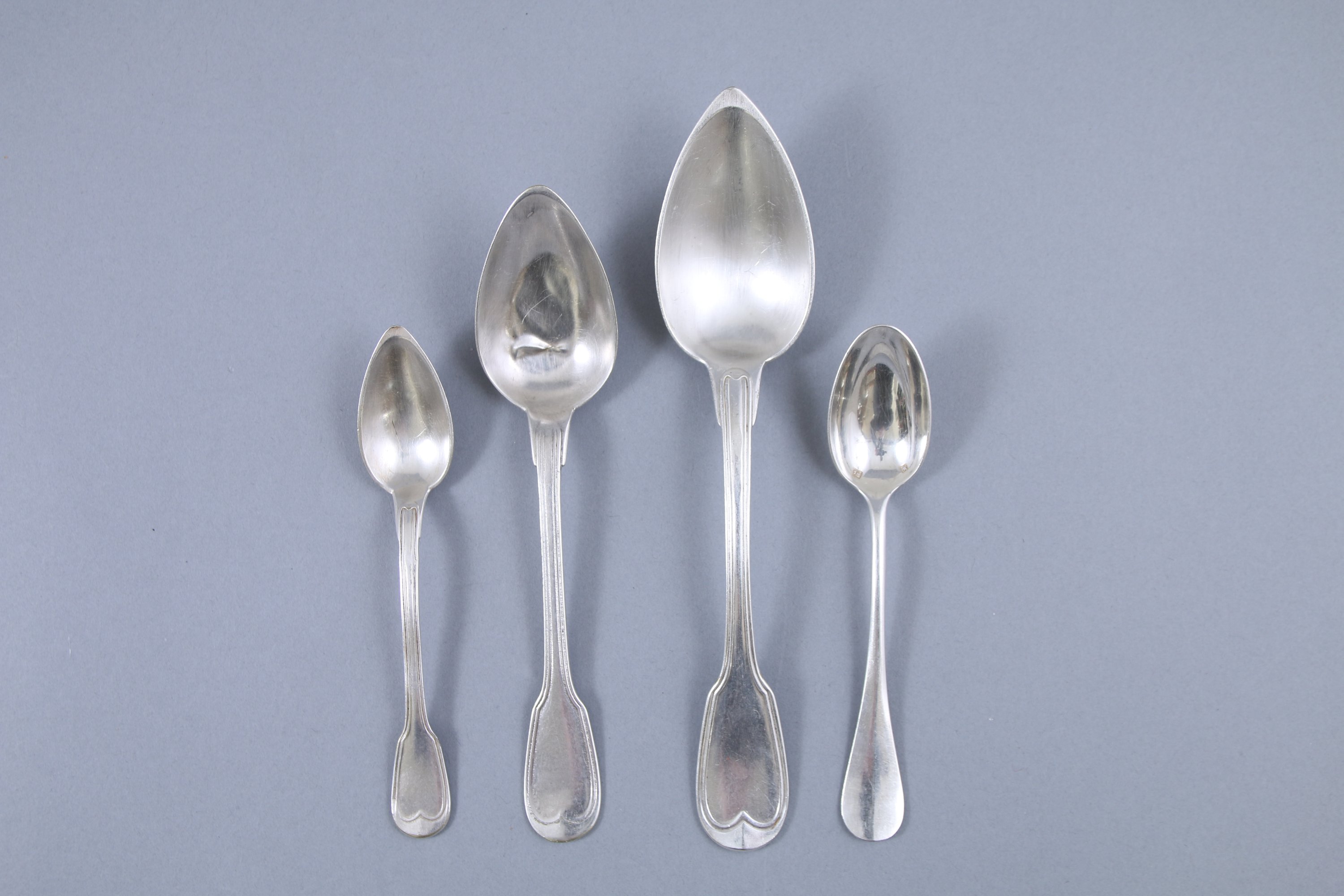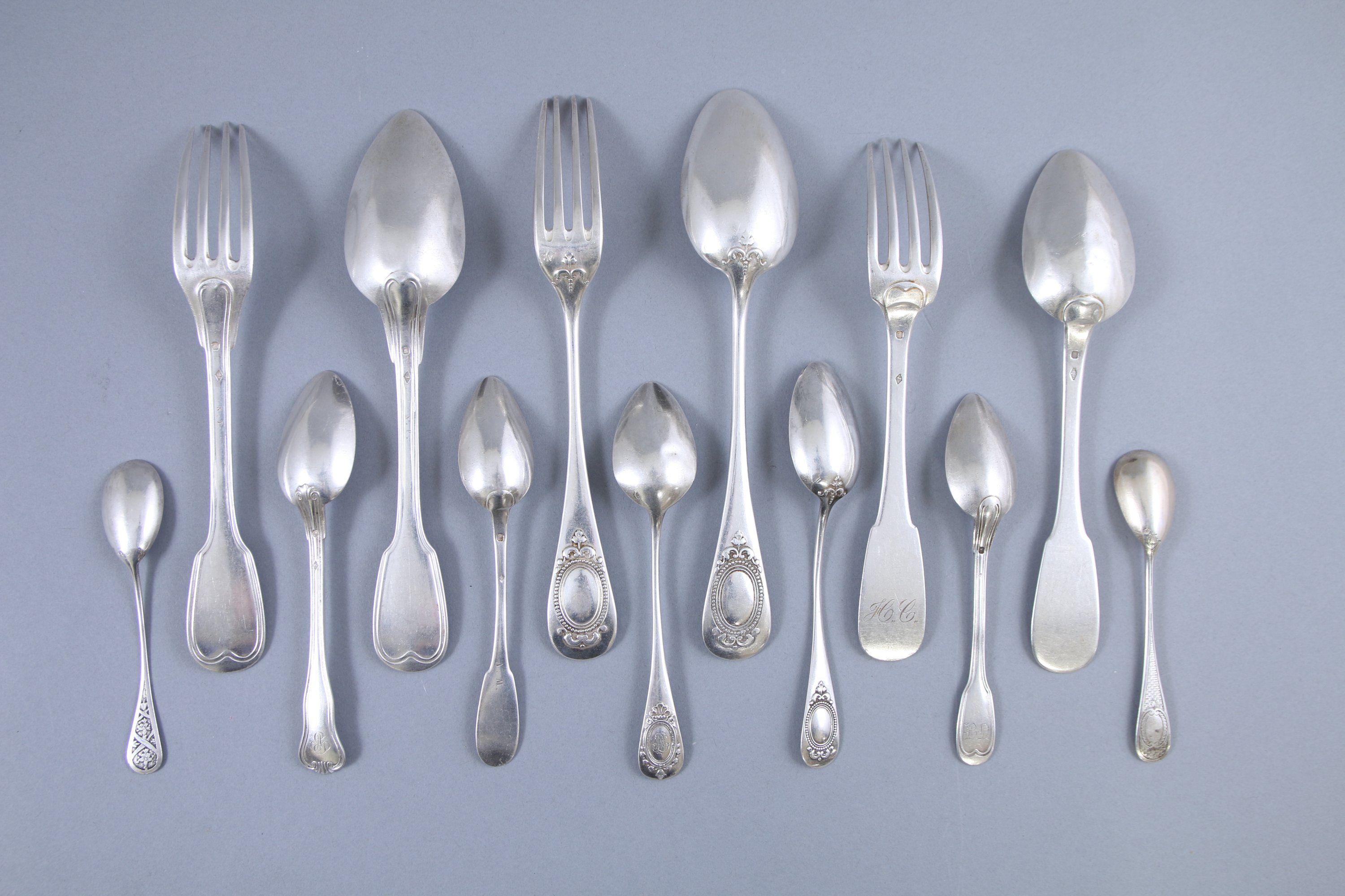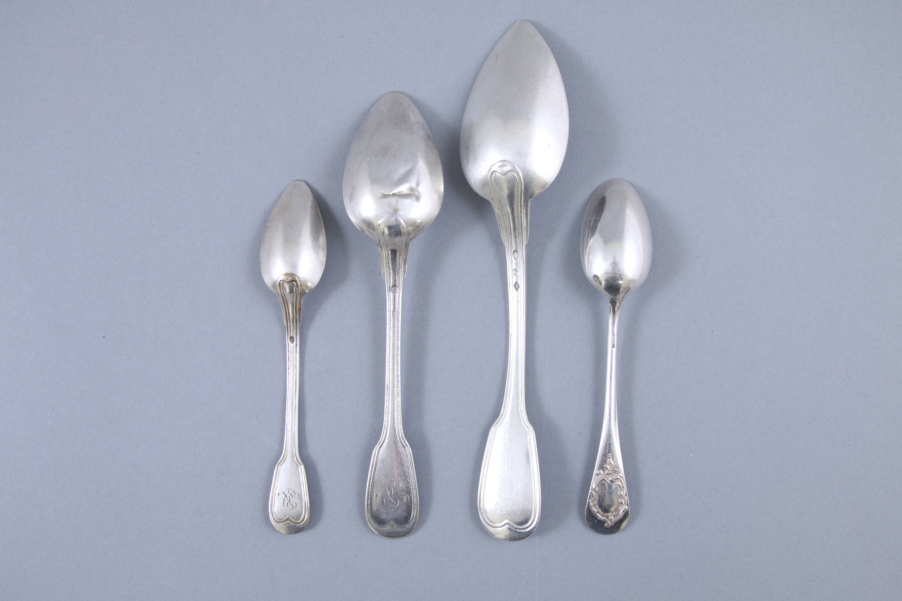 De modèles variés dont uniplat, filets-contours et médaillons. Certaines pièces monogrammées.